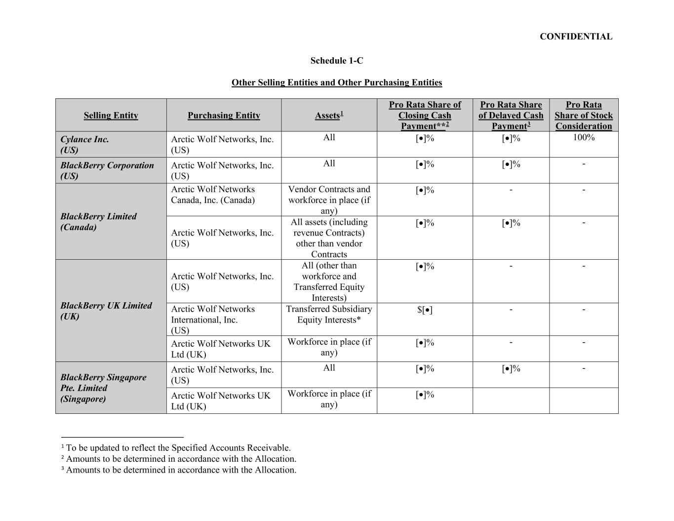 CONFIDENTIAL Schedule 1-C Other Selling Entities and Other Purchasing Entities Selling Entity Purchasing Entity Assets1 Pro Rata Share of Closing Cash Payment**2 Pro Rata Share of Delayed Cash Payment3 Pro Rata Share of Stock Consideration Cylance Inc. (US) Arctic Wolf Networks, Inc. (US) All [•]% [•]% 100% BlackBerry Corporation (US) Arctic Wolf Networks, Inc. (US) All [•]% [•]% - BlackBerry Limited (Canada) Arctic Wolf Networks Canada, Inc. (Canada) Vendor Contracts and workforce in place (if any) [•]% - - Arctic Wolf Networks, Inc. (US) All assets (including revenue Contracts) other than vendor Contracts [•]% [•]% - BlackBerry UK Limited (UK) Arctic Wolf Networks, Inc. (US) All (other than workforce and Transferred Equity Interests) [•]% - - Arctic Wolf Networks International, Inc. (US) Transferred Subsidiary Equity Interests* $[•] - - Arctic Wolf Networks UK Ltd (UK) Workforce in place (if any) [•]% - - BlackBerry Singapore Pte. Limited (Singapore) Arctic Wolf Networks, Inc. (US) All [•]% [•]% - Arctic Wolf Networks UK Ltd (UK) Workforce in place (if any) [•]% 1 To be updated to reflect the Specified Accounts Receivable. 2 Amounts to be determined in accordance with the Allocation. 3 Amounts to be determined in accordance with the Allocation.