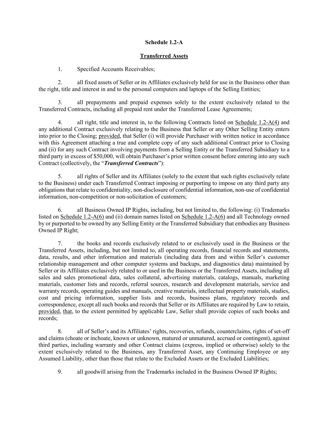 Schedule 1.2-A Transferred Assets 1. Specified Accounts Receivables; 2. all fixed assets of Seller or its Affiliates exclusively held for use in the Business other than the right, title and interest in and to the personal computers and laptops of the Selling Entities; 3. all prepayments and prepaid expenses solely to the extent exclusively related to the Transferred Contracts, including all prepaid rent under the Transferred Lease Agreements; 4. all right, title and interest in, to the following Contracts listed on Schedule 1.2-A(4) and any additional Contract exclusively relating to the Business that Seller or any Other Selling Entity enters into prior to the Closing; provided, that Seller (i) will provide Purchaser with written notice in accordance with this Agreement attaching a true and complete copy of any such additional Contract prior to Closing and (ii) for any such Contract involving payments from a Selling Entity or the Transferred Subsidiary to a third party in excess of $50,000, will obtain Purchaser’s prior written consent before entering into any such Contract (collectively, the “Transferred Contracts”): 5. all rights of Seller and its Affiliates (solely to the extent that such rights exclusively relate to the Business) under each Transferred Contract imposing or purporting to impose on any third party any obligations that relate to confidentiality, non-disclosure of confidential information, non-use of confidential information, non-competition or non-solicitation of customers; 6. all Business Owned IP Rights, including, but not limited to, the following: (i) Trademarks listed on Schedule 1.2-A(6) and (ii) domain names listed on Schedule 1.2-A(6) and all Technology owned by or purported to be owned by any Selling Entity or the Transferred Subsidiary that embodies any Business Owned IP Right; 7. the books and records exclusively related to or exclusively used in the Business or the Transferred Assets, including, but not limited to, all operating records, financial records and statements, data, results, and other information and materials (including data from and within Seller’s customer relationship management and other computer systems and backups, and diagnostics data) maintained by Seller or its Affiliates exclusively related to or used in the Business or the Transferred Assets, including all sales and sales promotional data, sales collateral, advertising materials, catalogs, manuals, marketing materials, customer lists and records, referral sources, research and development materials, service and warranty records, operating guides and manuals, creative materials, intellectual property materials, studies, cost and pricing information, supplier lists and records, business plans, regulatory records and correspondence, except all such books and records that Seller or its Affiliates are required by Law to retain, provided, that, to the extent permitted by applicable Law, Seller shall provide copies of such books and records; 8. all of Seller’s and its Affiliates’ rights, recoveries, refunds, counterclaims, rights of set-off and claims (choate or inchoate, known or unknown, matured or unmatured, accrued or contingent), against third parties, including warranty and other Contract claims (express, implied or otherwise) solely to the extent exclusively related to the Business, any Transferred Asset, any Continuing Employee or any Assumed Liability, other than those that relate to the Excluded Assets or the Excluded Liabilities; 9. all goodwill arising from the Trademarks included in the Business Owned IP Rights;