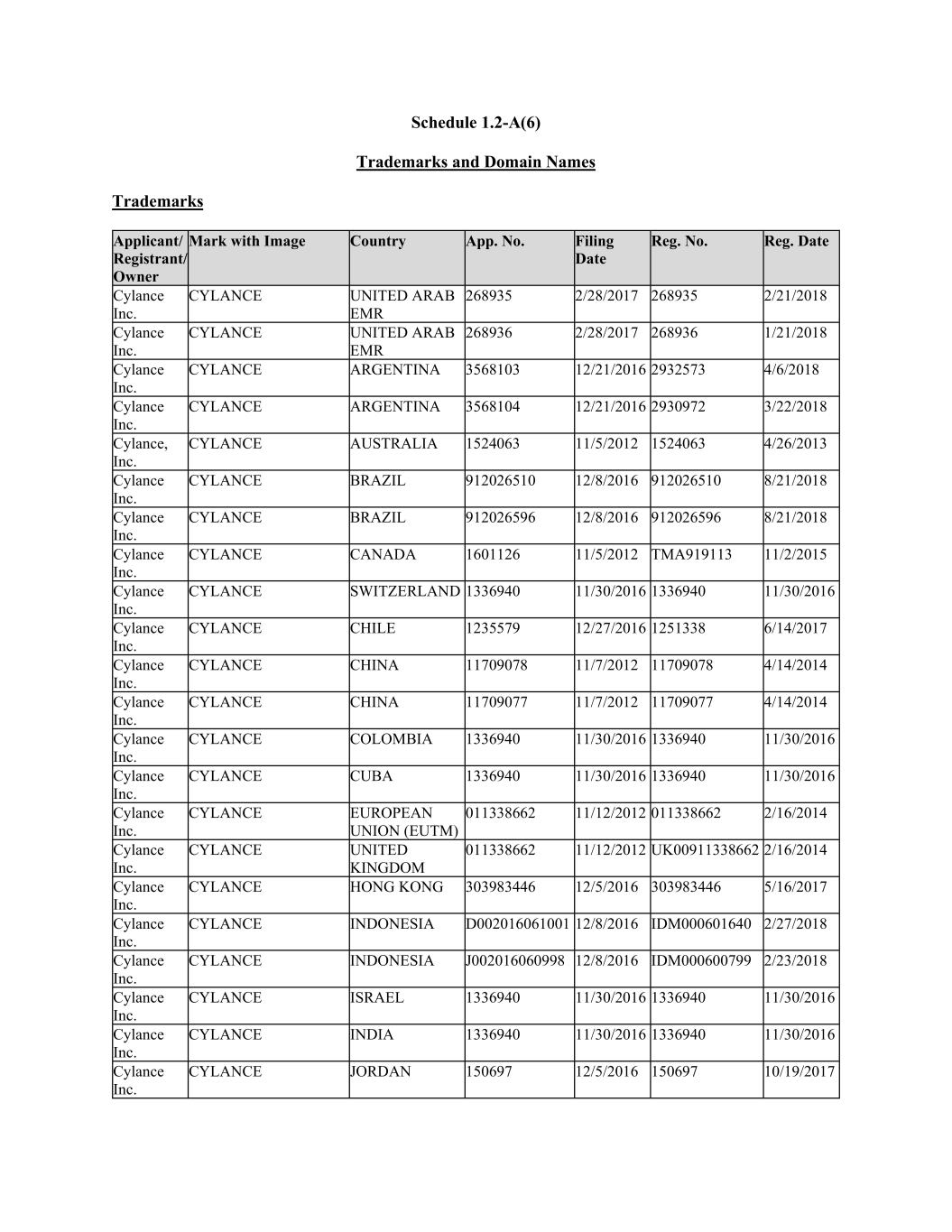 Schedule 1.2-A(6) Trademarks and Domain Names Trademarks Applicant/ Registrant/ Owner Mark with Image Country App. No. Filing Date Reg. No. Reg. Date Cylance Inc. CYLANCE UNITED ARAB EMR 268935 2/28/2017 268935 2/21/2018 Cylance Inc. CYLANCE UNITED ARAB EMR 268936 2/28/2017 268936 1/21/2018 Cylance Inc. CYLANCE ARGENTINA 3568103 12/21/2016 2932573 4/6/2018 Cylance Inc. CYLANCE ARGENTINA 3568104 12/21/2016 2930972 3/22/2018 Cylance, Inc. CYLANCE AUSTRALIA 1524063 11/5/2012 1524063 4/26/2013 Cylance Inc. CYLANCE BRAZIL 912026510 12/8/2016 912026510 8/21/2018 Cylance Inc. CYLANCE BRAZIL 912026596 12/8/2016 912026596 8/21/2018 Cylance Inc. CYLANCE CANADA 1601126 11/5/2012 TMA919113 11/2/2015 Cylance Inc. CYLANCE SWITZERLAND 1336940 11/30/2016 1336940 11/30/2016 Cylance Inc. CYLANCE CHILE 1235579 12/27/2016 1251338 6/14/2017 Cylance Inc. CYLANCE CHINA 11709078 11/7/2012 11709078 4/14/2014 Cylance Inc. CYLANCE CHINA 11709077 11/7/2012 11709077 4/14/2014 Cylance Inc. CYLANCE COLOMBIA 1336940 11/30/2016 1336940 11/30/2016 Cylance Inc. CYLANCE CUBA 1336940 11/30/2016 1336940 11/30/2016 Cylance Inc. CYLANCE EUROPEAN UNION (EUTM) 011338662 11/12/2012 011338662 2/16/2014 Cylance Inc. CYLANCE UNITED KINGDOM 011338662 11/12/2012 UK00911338662 2/16/2014 Cylance Inc. CYLANCE HONG KONG 303983446 12/5/2016 303983446 5/16/2017 Cylance Inc. CYLANCE INDONESIA D002016061001 12/8/2016 IDM000601640 2/27/2018 Cylance Inc. CYLANCE INDONESIA J002016060998 12/8/2016 IDM000600799 2/23/2018 Cylance Inc. CYLANCE ISRAEL 1336940 11/30/2016 1336940 11/30/2016 Cylance Inc. CYLANCE INDIA 1336940 11/30/2016 1336940 11/30/2016 Cylance Inc. CYLANCE JORDAN 150697 12/5/2016 150697 10/19/2017