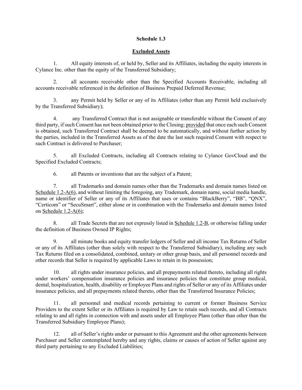 Schedule 1.3 Excluded Assets 1. All equity interests of, or held by, Seller and its Affiliates, including the equity interests in Cylance Inc. other than the equity of the Transferred Subsidiary; 2. all accounts receivable other than the Specified Accounts Receivable, including all accounts receivable referenced in the definition of Business Prepaid Deferred Revenue; 3. any Permit held by Seller or any of its Affiliates (other than any Permit held exclusively by the Transferred Subsidiary); 4. any Transferred Contract that is not assignable or transferable without the Consent of any third party, if such Consent has not been obtained prior to the Closing; provided that once each such Consent is obtained, such Transferred Contract shall be deemed to be automatically, and without further action by the parties, included in the Transferred Assets as of the date the last such required Consent with respect to such Contract is delivered to Purchaser; 5. all Excluded Contracts, including all Contracts relating to Cylance GovCloud and the Specified Excluded Contracts; 6. all Patents or inventions that are the subject of a Patent; 7. all Trademarks and domain names other than the Trademarks and domain names listed on Schedule 1.2-A(6), and without limiting the foregoing, any Trademark, domain name, social media handle, name or identifier of Seller or any of its Affiliates that uses or contains “BlackBerry”, “BB”, “QNX”, “Certicom” or “SecuSmart”, either alone or in combination with the Trademarks and domain names listed on Schedule 1.2-A(6); 8. all Trade Secrets that are not expressly listed in Schedule 1.2-B, or otherwise falling under the definition of Business Owned IP Rights; 9. all minute books and equity transfer ledgers of Seller and all income Tax Returns of Seller or any of its Affiliates (other than solely with respect to the Transferred Subsidiary), including any such Tax Returns filed on a consolidated, combined, unitary or other group basis, and all personnel records and other records that Seller is required by applicable Laws to retain in its possession; 10. all rights under insurance policies, and all prepayments related thereto, including all rights under workers’ compensation insurance policies and insurance policies that constitute group medical, dental, hospitalization, health, disability or Employee Plans and rights of Seller or any of its Affiliates under insurance policies, and all prepayments related thereto, other than the Transferred Insurance Policies; 11. all personnel and medical records pertaining to current or former Business Service Providers to the extent Seller or its Affiliates is required by Law to retain such records, and all Contracts relating to and all rights in connection with and assets under all Employee Plans (other than other than the Transferred Subsidiary Employee Plans); 12. all of Seller’s rights under or pursuant to this Agreement and the other agreements between Purchaser and Seller contemplated hereby and any rights, claims or causes of action of Seller against any third party pertaining to any Excluded Liabilities;