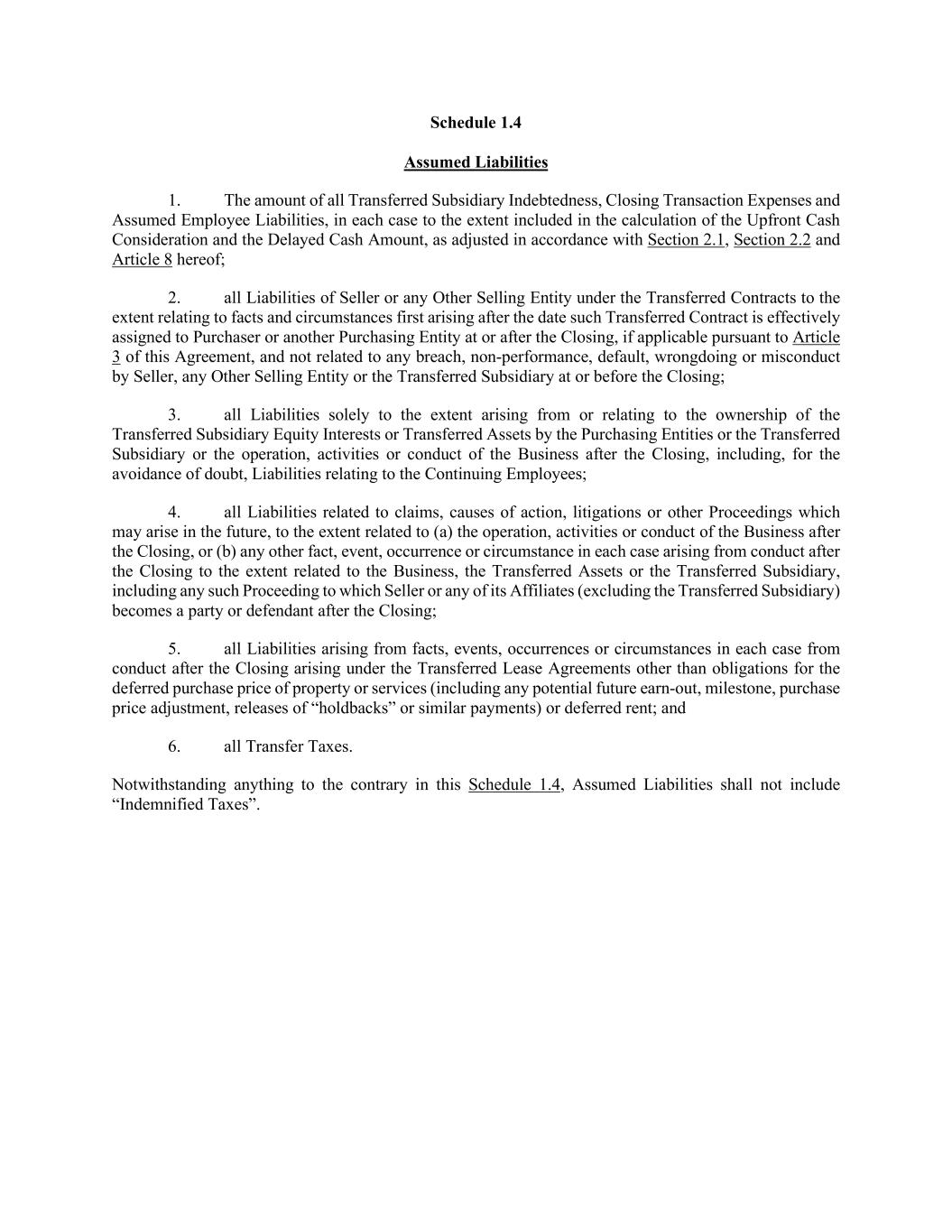 Schedule 1.4 Assumed Liabilities 1. The amount of all Transferred Subsidiary Indebtedness, Closing Transaction Expenses and Assumed Employee Liabilities, in each case to the extent included in the calculation of the Upfront Cash Consideration and the Delayed Cash Amount, as adjusted in accordance with Section 2.1, Section 2.2 and Article 8 hereof; 2. all Liabilities of Seller or any Other Selling Entity under the Transferred Contracts to the extent relating to facts and circumstances first arising after the date such Transferred Contract is effectively assigned to Purchaser or another Purchasing Entity at or after the Closing, if applicable pursuant to Article 3 of this Agreement, and not related to any breach, non-performance, default, wrongdoing or misconduct by Seller, any Other Selling Entity or the Transferred Subsidiary at or before the Closing; 3. all Liabilities solely to the extent arising from or relating to the ownership of the Transferred Subsidiary Equity Interests or Transferred Assets by the Purchasing Entities or the Transferred Subsidiary or the operation, activities or conduct of the Business after the Closing, including, for the avoidance of doubt, Liabilities relating to the Continuing Employees; 4. all Liabilities related to claims, causes of action, litigations or other Proceedings which may arise in the future, to the extent related to (a) the operation, activities or conduct of the Business after the Closing, or (b) any other fact, event, occurrence or circumstance in each case arising from conduct after the Closing to the extent related to the Business, the Transferred Assets or the Transferred Subsidiary, including any such Proceeding to which Seller or any of its Affiliates (excluding the Transferred Subsidiary) becomes a party or defendant after the Closing; 5. all Liabilities arising from facts, events, occurrences or circumstances in each case from conduct after the Closing arising under the Transferred Lease Agreements other than obligations for the deferred purchase price of property or services (including any potential future earn-out, milestone, purchase price adjustment, releases of “holdbacks” or similar payments) or deferred rent; and 6. all Transfer Taxes. Notwithstanding anything to the contrary in this Schedule 1.4, Assumed Liabilities shall not include “Indemnified Taxes”.