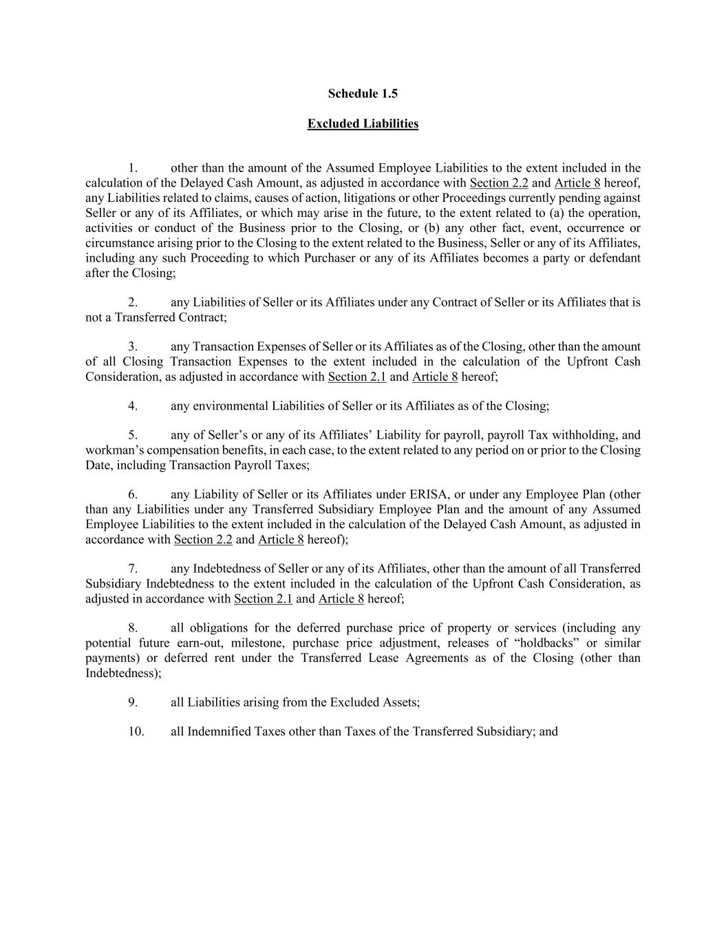 Schedule 1.5 Excluded Liabilities 1. other than the amount of the Assumed Employee Liabilities to the extent included in the calculation of the Delayed Cash Amount, as adjusted in accordance with Section 2.2 and Article 8 hereof, any Liabilities related to claims, causes of action, litigations or other Proceedings currently pending against Seller or any of its Affiliates, or which may arise in the future, to the extent related to (a) the operation, activities or conduct of the Business prior to the Closing, or (b) any other fact, event, occurrence or circumstance arising prior to the Closing to the extent related to the Business, Seller or any of its Affiliates, including any such Proceeding to which Purchaser or any of its Affiliates becomes a party or defendant after the Closing; 2. any Liabilities of Seller or its Affiliates under any Contract of Seller or its Affiliates that is not a Transferred Contract; 3. any Transaction Expenses of Seller or its Affiliates as of the Closing, other than the amount of all Closing Transaction Expenses to the extent included in the calculation of the Upfront Cash Consideration, as adjusted in accordance with Section 2.1 and Article 8 hereof; 4. any environmental Liabilities of Seller or its Affiliates as of the Closing; 5. any of Seller’s or any of its Affiliates’ Liability for payroll, payroll Tax withholding, and workman’s compensation benefits, in each case, to the extent related to any period on or prior to the Closing Date, including Transaction Payroll Taxes; 6. any Liability of Seller or its Affiliates under ERISA, or under any Employee Plan (other than any Liabilities under any Transferred Subsidiary Employee Plan and the amount of any Assumed Employee Liabilities to the extent included in the calculation of the Delayed Cash Amount, as adjusted in accordance with Section 2.2 and Article 8 hereof); 7. any Indebtedness of Seller or any of its Affiliates, other than the amount of all Transferred Subsidiary Indebtedness to the extent included in the calculation of the Upfront Cash Consideration, as adjusted in accordance with Section 2.1 and Article 8 hereof; 8. all obligations for the deferred purchase price of property or services (including any potential future earn-out, milestone, purchase price adjustment, releases of “holdbacks” or similar payments) or deferred rent under the Transferred Lease Agreements as of the Closing (other than Indebtedness); 9. all Liabilities arising from the Excluded Assets; 10. all Indemnified Taxes other than Taxes of the Transferred Subsidiary; and