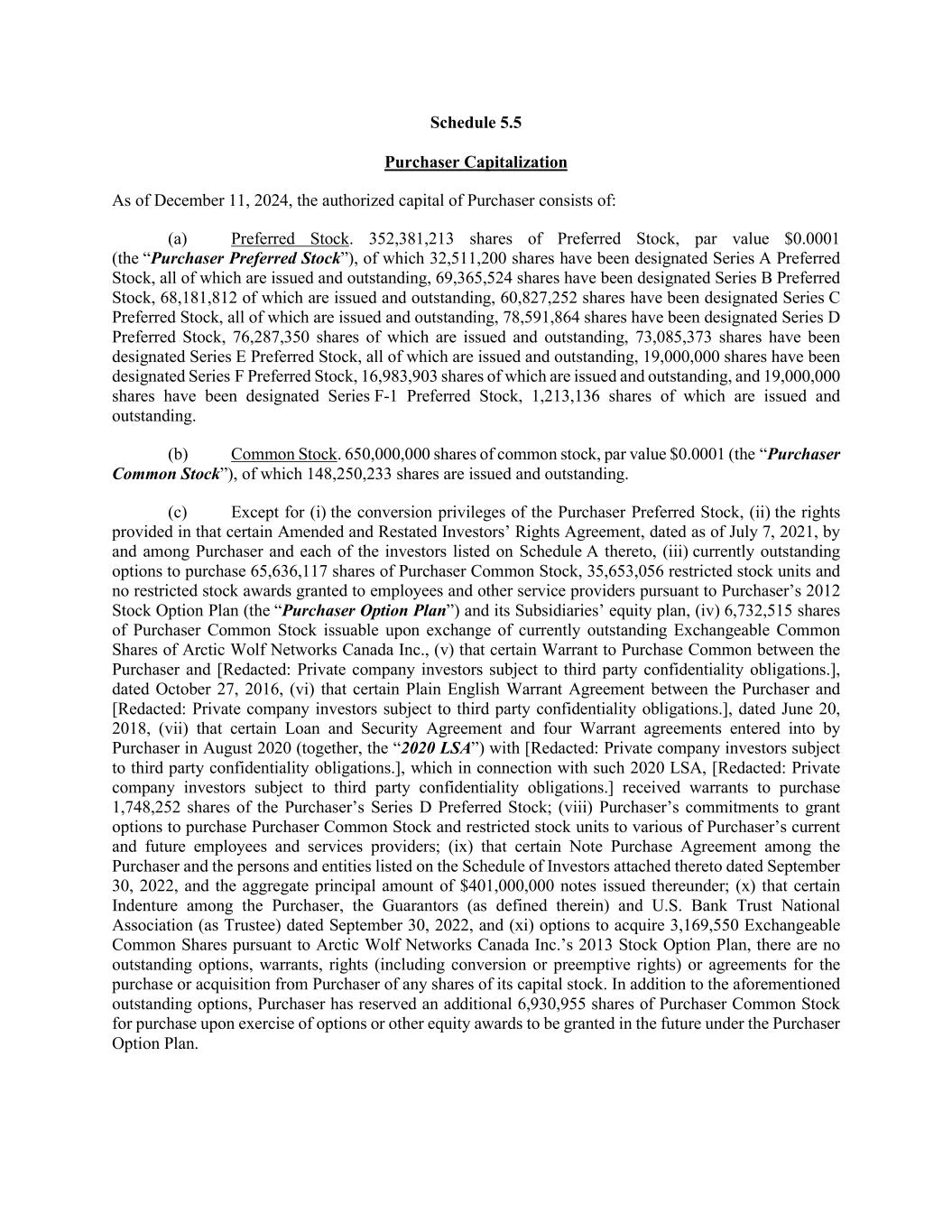 Schedule 5.5 Purchaser Capitalization As of December 11, 2024, the authorized capital of Purchaser consists of: (a) Preferred Stock. 352,381,213 shares of Preferred Stock, par value $0.0001 (the “Purchaser Preferred Stock”), of which 32,511,200 shares have been designated Series A Preferred Stock, all of which are issued and outstanding, 69,365,524 shares have been designated Series B Preferred Stock, 68,181,812 of which are issued and outstanding, 60,827,252 shares have been designated Series C Preferred Stock, all of which are issued and outstanding, 78,591,864 shares have been designated Series D Preferred Stock, 76,287,350 shares of which are issued and outstanding, 73,085,373 shares have been designated Series E Preferred Stock, all of which are issued and outstanding, 19,000,000 shares have been designated Series F Preferred Stock, 16,983,903 shares of which are issued and outstanding, and 19,000,000 shares have been designated Series F-1 Preferred Stock, 1,213,136 shares of which are issued and outstanding. (b) Common Stock. 650,000,000 shares of common stock, par value $0.0001 (the “Purchaser Common Stock”), of which 148,250,233 shares are issued and outstanding. (c) Except for (i) the conversion privileges of the Purchaser Preferred Stock, (ii) the rights provided in that certain Amended and Restated Investors’ Rights Agreement, dated as of July 7, 2021, by and among Purchaser and each of the investors listed on Schedule A thereto, (iii) currently outstanding options to purchase 65,636,117 shares of Purchaser Common Stock, 35,653,056 restricted stock units and no restricted stock awards granted to employees and other service providers pursuant to Purchaser’s 2012 Stock Option Plan (the “Purchaser Option Plan”) and its Subsidiaries’ equity plan, (iv) 6,732,515 shares of Purchaser Common Stock issuable upon exchange of currently outstanding Exchangeable Common Shares of Arctic Wolf Networks Canada Inc., (v) that certain Warrant to Purchase Common between the Purchaser and [Redacted: Private company investors subject to third party confidentiality obligations.], dated October 27, 2016, (vi) that certain Plain English Warrant Agreement between the Purchaser and [Redacted: Private company investors subject to third party confidentiality obligations.], dated June 20, 2018, (vii) that certain Loan and Security Agreement and four Warrant agreements entered into by Purchaser in August 2020 (together, the “2020 LSA”) with [Redacted: Private company investors subject to third party confidentiality obligations.], which in connection with such 2020 LSA, [Redacted: Private company investors subject to third party confidentiality obligations.] received warrants to purchase 1,748,252 shares of the Purchaser’s Series D Preferred Stock; (viii) Purchaser’s commitments to grant options to purchase Purchaser Common Stock and restricted stock units to various of Purchaser’s current and future employees and services providers; (ix) that certain Note Purchase Agreement among the Purchaser and the persons and entities listed on the Schedule of Investors attached thereto dated September 30, 2022, and the aggregate principal amount of $401,000,000 notes issued thereunder; (x) that certain Indenture among the Purchaser, the Guarantors (as defined therein) and U.S. Bank Trust National Association (as Trustee) dated September 30, 2022, and (xi) options to acquire 3,169,550 Exchangeable Common Shares pursuant to Arctic Wolf Networks Canada Inc.’s 2013 Stock Option Plan, there are no outstanding options, warrants, rights (including conversion or preemptive rights) or agreements for the purchase or acquisition from Purchaser of any shares of its capital stock. In addition to the aforementioned outstanding options, Purchaser has reserved an additional 6,930,955 shares of Purchaser Common Stock for purchase upon exercise of options or other equity awards to be granted in the future under the Purchaser Option Plan.