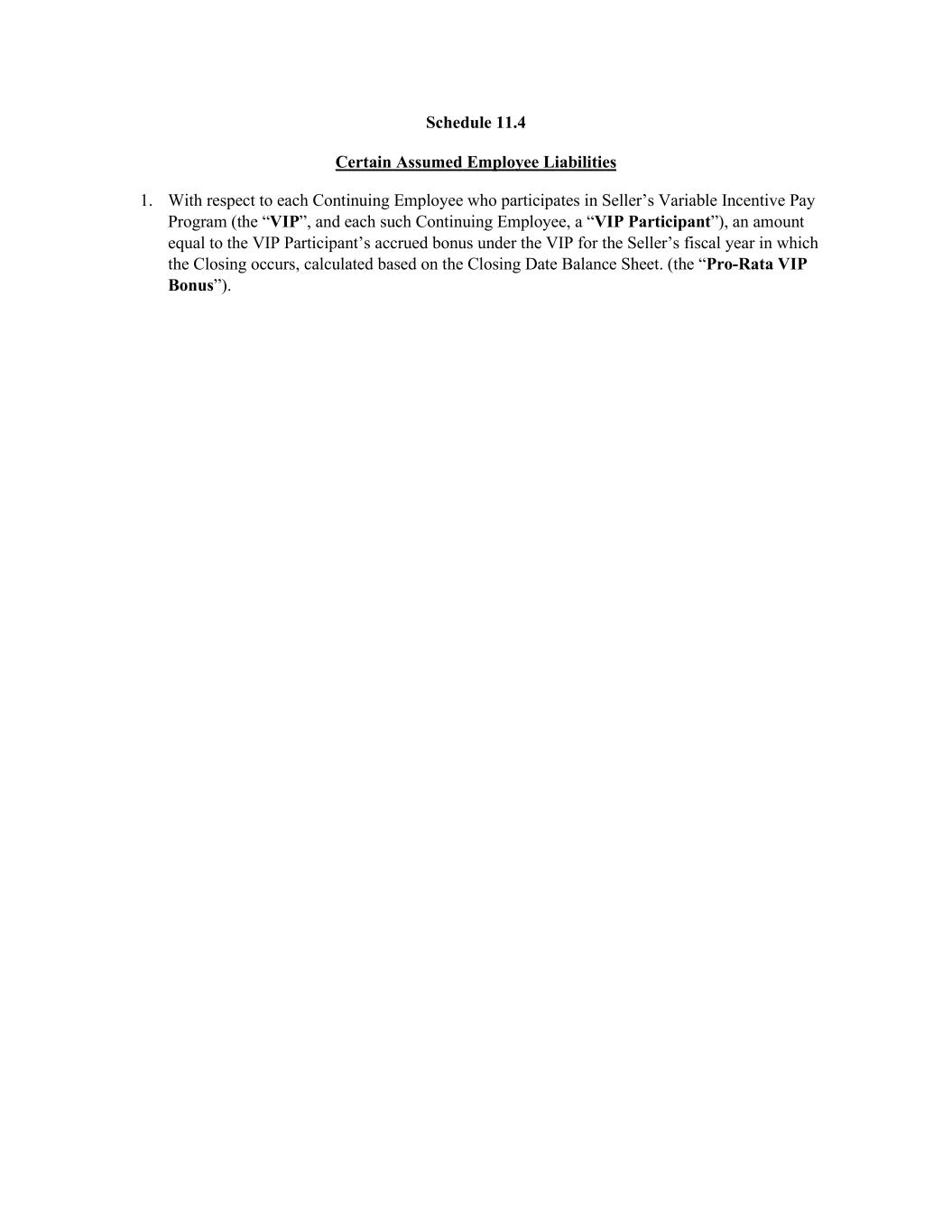 Schedule 11.4 Certain Assumed Employee Liabilities 1. With respect to each Continuing Employee who participates in Seller’s Variable Incentive Pay Program (the “VIP”, and each such Continuing Employee, a “VIP Participant”), an amount equal to the VIP Participant’s accrued bonus under the VIP for the Seller’s fiscal year in which the Closing occurs, calculated based on the Closing Date Balance Sheet. (the “Pro-Rata VIP Bonus”).