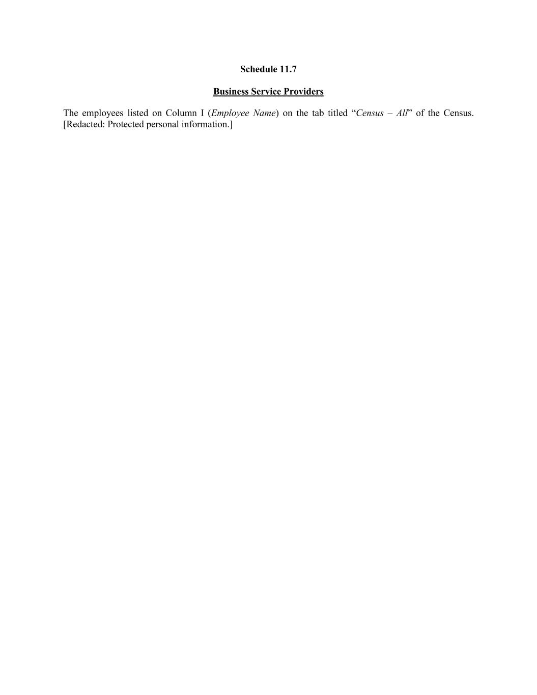 Schedule 11.7 Business Service Providers The employees listed on Column I (Employee Name) on the tab titled “Census – All” of the Census. [Redacted: Protected personal information.]