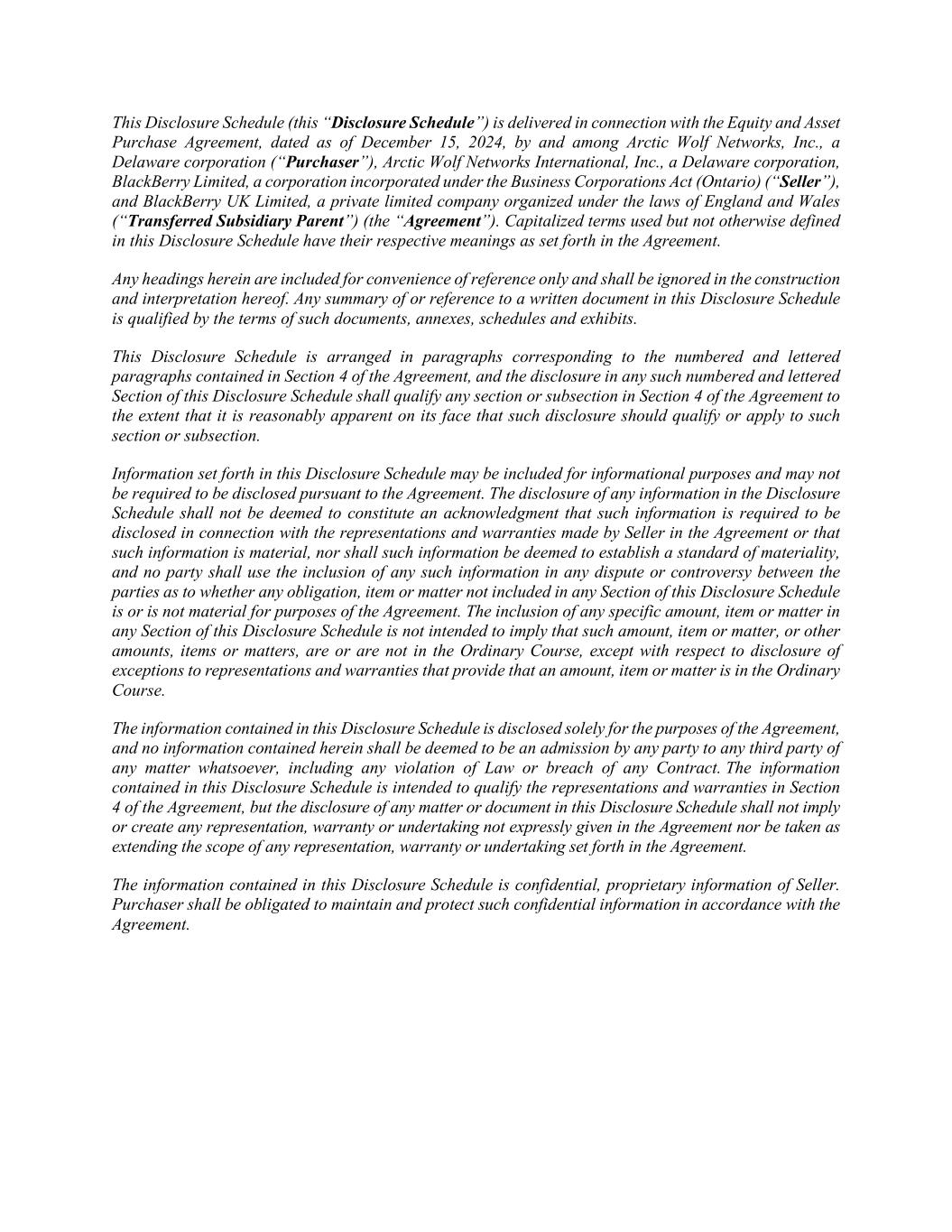 This Disclosure Schedule (this “Disclosure Schedule”) is delivered in connection with the Equity and Asset Purchase Agreement, dated as of December 15, 2024, by and among Arctic Wolf Networks, Inc., a Delaware corporation (“Purchaser”), Arctic Wolf Networks International, Inc., a Delaware corporation, BlackBerry Limited, a corporation incorporated under the Business Corporations Act (Ontario) (“Seller”), and BlackBerry UK Limited, a private limited company organized under the laws of England and Wales (“Transferred Subsidiary Parent”) (the “Agreement”). Capitalized terms used but not otherwise defined in this Disclosure Schedule have their respective meanings as set forth in the Agreement. Any headings herein are included for convenience of reference only and shall be ignored in the construction and interpretation hereof. Any summary of or reference to a written document in this Disclosure Schedule is qualified by the terms of such documents, annexes, schedules and exhibits. This Disclosure Schedule is arranged in paragraphs corresponding to the numbered and lettered paragraphs contained in Section 4 of the Agreement, and the disclosure in any such numbered and lettered Section of this Disclosure Schedule shall qualify any section or subsection in Section 4 of the Agreement to the extent that it is reasonably apparent on its face that such disclosure should qualify or apply to such section or subsection. Information set forth in this Disclosure Schedule may be included for informational purposes and may not be required to be disclosed pursuant to the Agreement. The disclosure of any information in the Disclosure Schedule shall not be deemed to constitute an acknowledgment that such information is required to be disclosed in connection with the representations and warranties made by Seller in the Agreement or that such information is material, nor shall such information be deemed to establish a standard of materiality, and no party shall use the inclusion of any such information in any dispute or controversy between the parties as to whether any obligation, item or matter not included in any Section of this Disclosure Schedule is or is not material for purposes of the Agreement. The inclusion of any specific amount, item or matter in any Section of this Disclosure Schedule is not intended to imply that such amount, item or matter, or other amounts, items or matters, are or are not in the Ordinary Course, except with respect to disclosure of exceptions to representations and warranties that provide that an amount, item or matter is in the Ordinary Course. The information contained in this Disclosure Schedule is disclosed solely for the purposes of the Agreement, and no information contained herein shall be deemed to be an admission by any party to any third party of any matter whatsoever, including any violation of Law or breach of any Contract. The information contained in this Disclosure Schedule is intended to qualify the representations and warranties in Section 4 of the Agreement, but the disclosure of any matter or document in this Disclosure Schedule shall not imply or create any representation, warranty or undertaking not expressly given in the Agreement nor be taken as extending the scope of any representation, warranty or undertaking set forth in the Agreement. The information contained in this Disclosure Schedule is confidential, proprietary information of Seller. Purchaser shall be obligated to maintain and protect such confidential information in accordance with the Agreement.