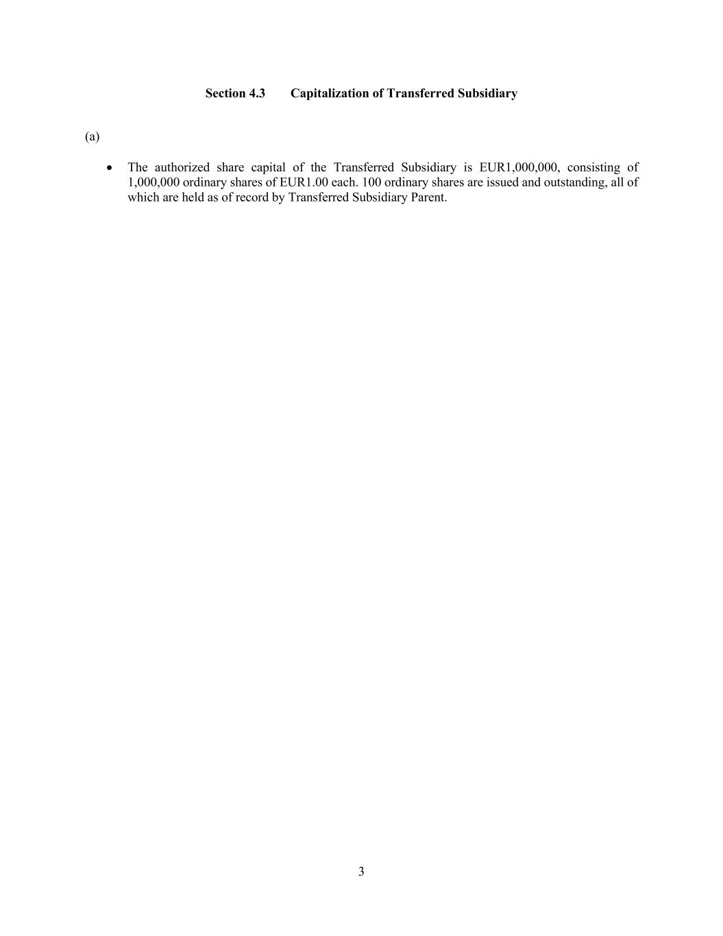 3 Section 4.3 Capitalization of Transferred Subsidiary (a) • The authorized share capital of the Transferred Subsidiary is EUR1,000,000, consisting of 1,000,000 ordinary shares of EUR1.00 each. 100 ordinary shares are issued and outstanding, all of which are held as of record by Transferred Subsidiary Parent.