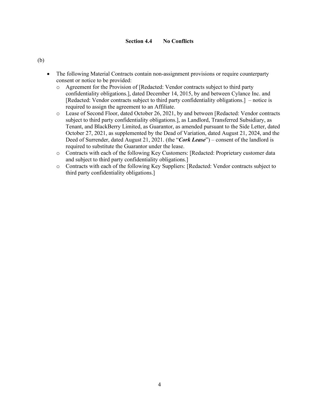 4 Section 4.4 No Conflicts (b) • The following Material Contracts contain non-assignment provisions or require counterparty consent or notice to be provided: o Agreement for the Provision of [Redacted: Vendor contracts subject to third party confidentiality obligations.], dated December 14, 2015, by and between Cylance Inc. and [Redacted: Vendor contracts subject to third party confidentiality obligations.] – notice is required to assign the agreement to an Affiliate. o Lease of Second Floor, dated October 26, 2021, by and between [Redacted: Vendor contracts subject to third party confidentiality obligations.], as Landlord, Transferred Subsidiary, as Tenant, and BlackBerry Limited, as Guarantor, as amended pursuant to the Side Letter, dated October 27, 2021, as supplemented by the Dead of Variation, dated August 21, 2024, and the Deed of Surrender, dated August 21, 2021. (the “Cork Lease”) – consent of the landlord is required to substitute the Guarantor under the lease. o Contracts with each of the following Key Customers: [Redacted: Proprietary customer data and subject to third party confidentiality obligations.] o Contracts with each of the following Key Suppliers: [Redacted: Vendor contracts subject to third party confidentiality obligations.]