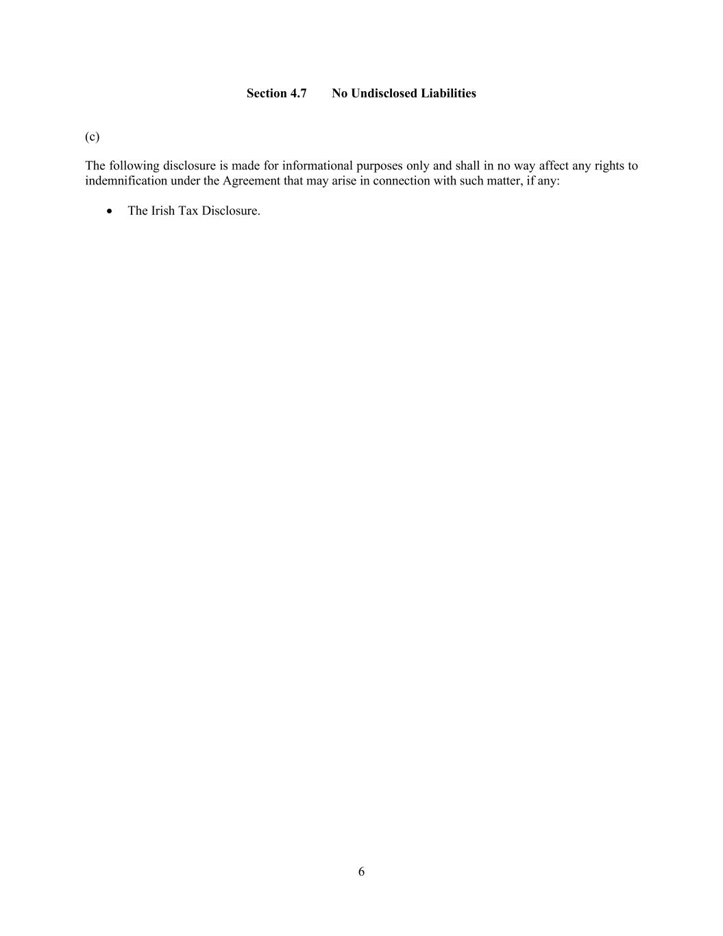 6 Section 4.7 No Undisclosed Liabilities (c) The following disclosure is made for informational purposes only and shall in no way affect any rights to indemnification under the Agreement that may arise in connection with such matter, if any: • The Irish Tax Disclosure.