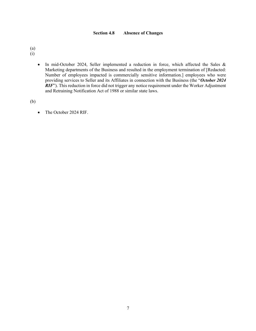 7 Section 4.8 Absence of Changes (a) (i) • In mid-October 2024, Seller implemented a reduction in force, which affected the Sales & Marketing departments of the Business and resulted in the employment termination of [Redacted: Number of employees impacted is commercially sensitive information.] employees who were providing services to Seller and its Affiliates in connection with the Business (the “October 2024 RIF”). This reduction in force did not trigger any notice requirement under the Worker Adjustment and Retraining Notification Act of 1988 or similar state laws. (b) • The October 2024 RIF.