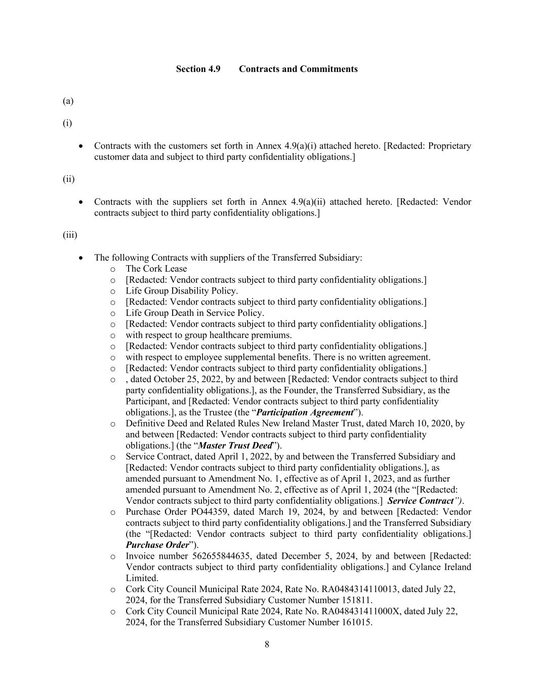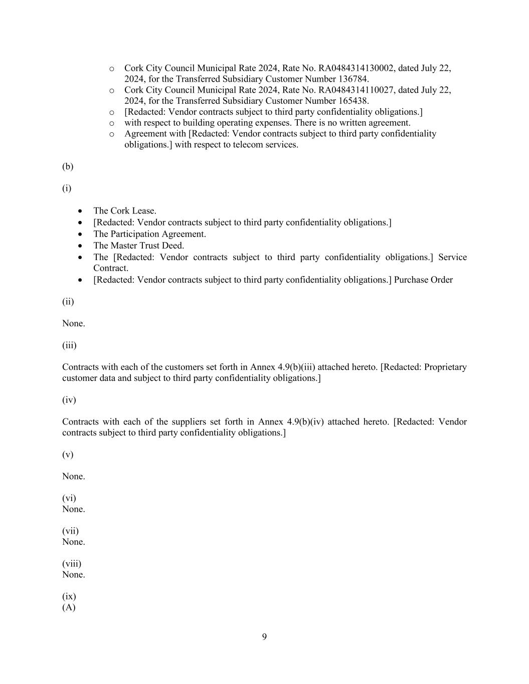 9 o Cork City Council Municipal Rate 2024, Rate No. RA0484314130002, dated July 22, 2024, for the Transferred Subsidiary Customer Number 136784. o Cork City Council Municipal Rate 2024, Rate No. RA0484314110027, dated July 22, 2024, for the Transferred Subsidiary Customer Number 165438. o [Redacted: Vendor contracts subject to third party confidentiality obligations.] o with respect to building operating expenses. There is no written agreement. o Agreement with [Redacted: Vendor contracts subject to third party confidentiality obligations.] with respect to telecom services. (b) (i) • The Cork Lease. • [Redacted: Vendor contracts subject to third party confidentiality obligations.] • The Participation Agreement. • The Master Trust Deed. • The [Redacted: Vendor contracts subject to third party confidentiality obligations.] Service Contract. • [Redacted: Vendor contracts subject to third party confidentiality obligations.] Purchase Order (ii) None. (iii) Contracts with each of the customers set forth in Annex 4.9(b)(iii) attached hereto. [Redacted: Proprietary customer data and subject to third party confidentiality obligations.] (iv) Contracts with each of the suppliers set forth in Annex 4.9(b)(iv) attached hereto. [Redacted: Vendor contracts subject to third party confidentiality obligations.] (v) None. (vi) None. (vii) None. (viii) None. (ix) (A)
