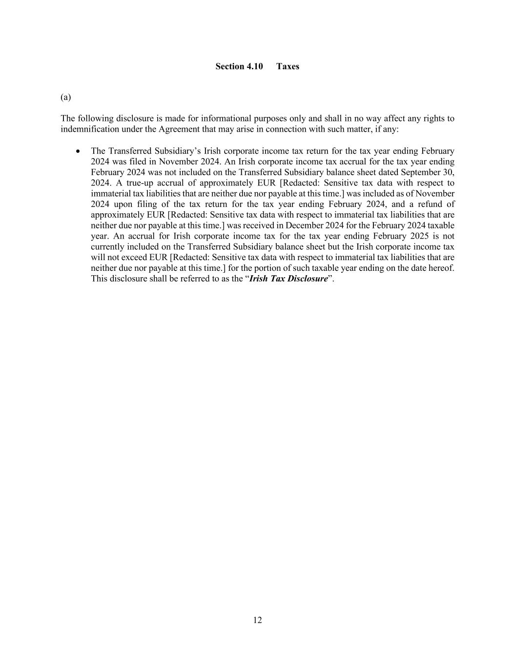 12 Section 4.10 Taxes (a) The following disclosure is made for informational purposes only and shall in no way affect any rights to indemnification under the Agreement that may arise in connection with such matter, if any: • The Transferred Subsidiary’s Irish corporate income tax return for the tax year ending February 2024 was filed in November 2024. An Irish corporate income tax accrual for the tax year ending February 2024 was not included on the Transferred Subsidiary balance sheet dated September 30, 2024. A true-up accrual of approximately EUR [Redacted: Sensitive tax data with respect to immaterial tax liabilities that are neither due nor payable at this time.] was included as of November 2024 upon filing of the tax return for the tax year ending February 2024, and a refund of approximately EUR [Redacted: Sensitive tax data with respect to immaterial tax liabilities that are neither due nor payable at this time.] was received in December 2024 for the February 2024 taxable year. An accrual for Irish corporate income tax for the tax year ending February 2025 is not currently included on the Transferred Subsidiary balance sheet but the Irish corporate income tax will not exceed EUR [Redacted: Sensitive tax data with respect to immaterial tax liabilities that are neither due nor payable at this time.] for the portion of such taxable year ending on the date hereof. This disclosure shall be referred to as the “Irish Tax Disclosure”.