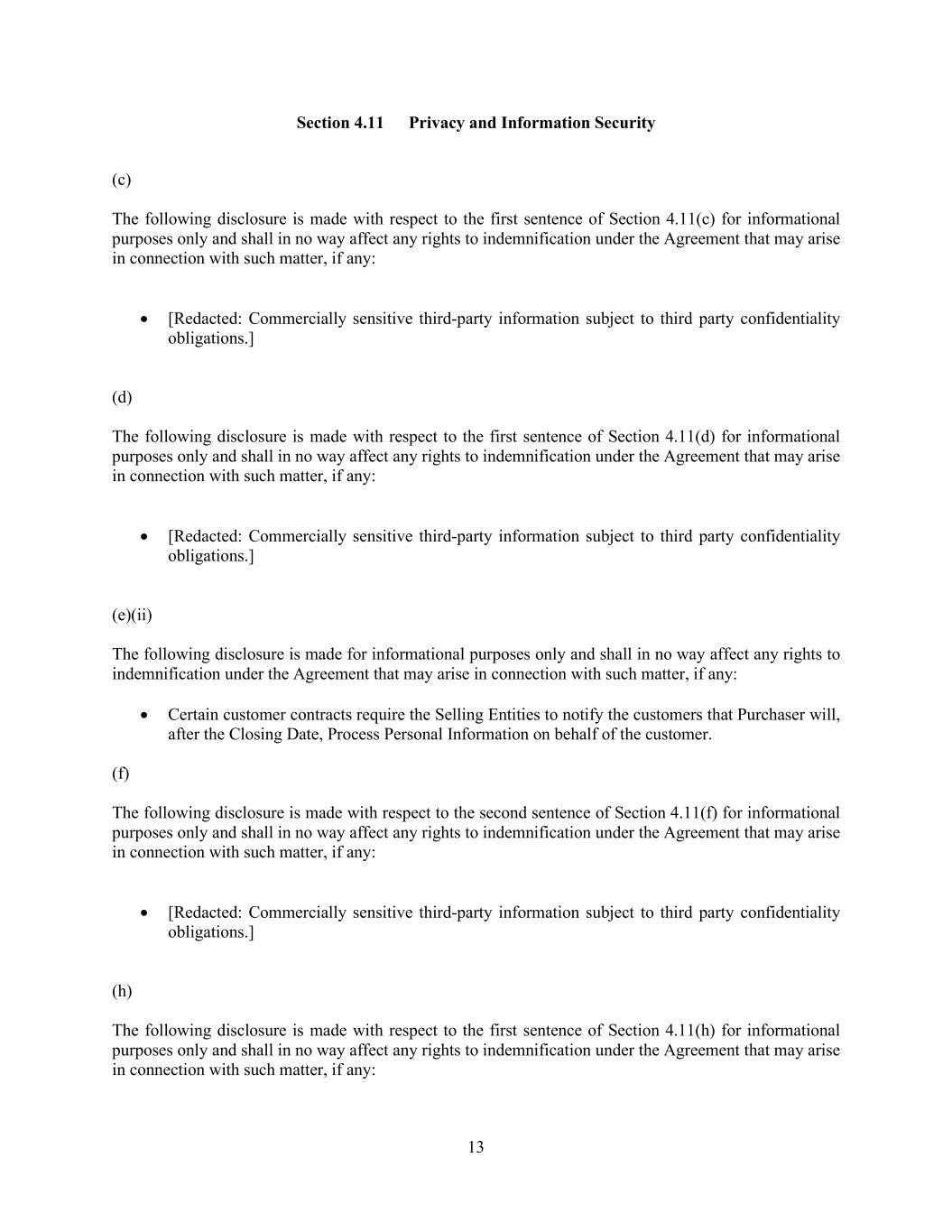 13 Section 4.11 Privacy and Information Security (c) The following disclosure is made with respect to the first sentence of Section 4.11(c) for informational purposes only and shall in no way affect any rights to indemnification under the Agreement that may arise in connection with such matter, if any: • [Redacted: Commercially sensitive third-party information subject to third party confidentiality obligations.] (d) The following disclosure is made with respect to the first sentence of Section 4.11(d) for informational purposes only and shall in no way affect any rights to indemnification under the Agreement that may arise in connection with such matter, if any: • [Redacted: Commercially sensitive third-party information subject to third party confidentiality obligations.] (e)(ii) The following disclosure is made for informational purposes only and shall in no way affect any rights to indemnification under the Agreement that may arise in connection with such matter, if any: • Certain customer contracts require the Selling Entities to notify the customers that Purchaser will, after the Closing Date, Process Personal Information on behalf of the customer. (f) The following disclosure is made with respect to the second sentence of Section 4.11(f) for informational purposes only and shall in no way affect any rights to indemnification under the Agreement that may arise in connection with such matter, if any: • [Redacted: Commercially sensitive third-party information subject to third party confidentiality obligations.] (h) The following disclosure is made with respect to the first sentence of Section 4.11(h) for informational purposes only and shall in no way affect any rights to indemnification under the Agreement that may arise in connection with such matter, if any: