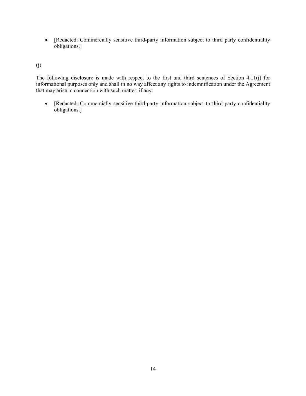 14 • [Redacted: Commercially sensitive third-party information subject to third party confidentiality obligations.] (j) The following disclosure is made with respect to the first and third sentences of Section 4.11(j) for informational purposes only and shall in no way affect any rights to indemnification under the Agreement that may arise in connection with such matter, if any: • [Redacted: Commercially sensitive third-party information subject to third party confidentiality obligations.]