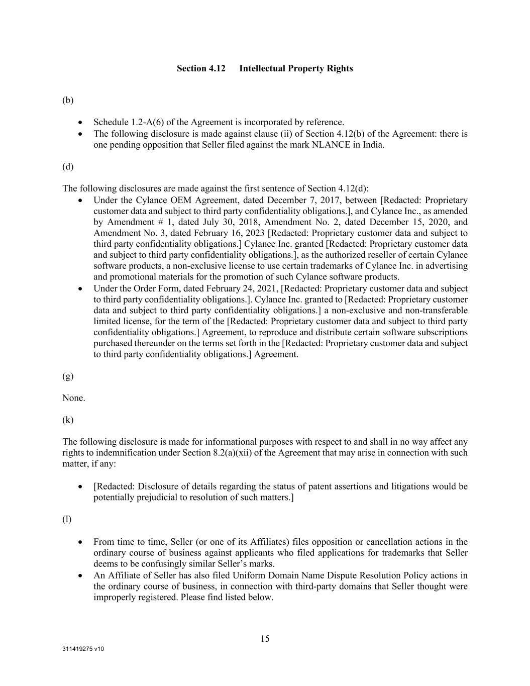 311419275 v10 15 Section 4.12 Intellectual Property Rights (b) • Schedule 1.2-A(6) of the Agreement is incorporated by reference. • The following disclosure is made against clause (ii) of Section 4.12(b) of the Agreement: there is one pending opposition that Seller filed against the mark NLANCE in India. (d) The following disclosures are made against the first sentence of Section 4.12(d): • Under the Cylance OEM Agreement, dated December 7, 2017, between [Redacted: Proprietary customer data and subject to third party confidentiality obligations.], and Cylance Inc., as amended by Amendment # 1, dated July 30, 2018, Amendment No. 2, dated December 15, 2020, and Amendment No. 3, dated February 16, 2023 [Redacted: Proprietary customer data and subject to third party confidentiality obligations.] Cylance Inc. granted [Redacted: Proprietary customer data and subject to third party confidentiality obligations.], as the authorized reseller of certain Cylance software products, a non-exclusive license to use certain trademarks of Cylance Inc. in advertising and promotional materials for the promotion of such Cylance software products. • Under the Order Form, dated February 24, 2021, [Redacted: Proprietary customer data and subject to third party confidentiality obligations.]. Cylance Inc. granted to [Redacted: Proprietary customer data and subject to third party confidentiality obligations.] a non-exclusive and non-transferable limited license, for the term of the [Redacted: Proprietary customer data and subject to third party confidentiality obligations.] Agreement, to reproduce and distribute certain software subscriptions purchased thereunder on the terms set forth in the [Redacted: Proprietary customer data and subject to third party confidentiality obligations.] Agreement. (g) None. (k) The following disclosure is made for informational purposes with respect to and shall in no way affect any rights to indemnification under Section 8.2(a)(xii) of the Agreement that may arise in connection with such matter, if any: • [Redacted: Disclosure of details regarding the status of patent assertions and litigations would be potentially prejudicial to resolution of such matters.] (l) • From time to time, Seller (or one of its Affiliates) files opposition or cancellation actions in the ordinary course of business against applicants who filed applications for trademarks that Seller deems to be confusingly similar Seller’s marks. • An Affiliate of Seller has also filed Uniform Domain Name Dispute Resolution Policy actions in the ordinary course of business, in connection with third-party domains that Seller thought were improperly registered. Please find listed below.