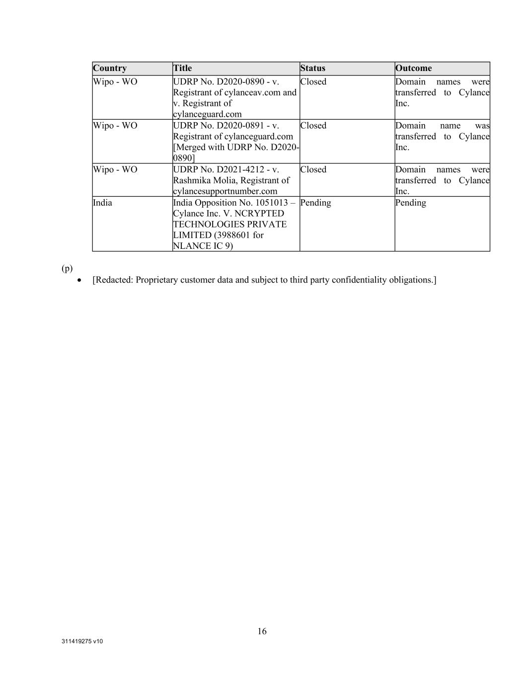311419275 v10 16 Country Title Status Outcome Wipo - WO UDRP No. D2020-0890 - v. Registrant of cylanceav.com and v. Registrant of cylanceguard.com Closed Domain names were transferred to Cylance Inc. Wipo - WO UDRP No. D2020-0891 - v. Registrant of cylanceguard.com [Merged with UDRP No. D2020- 0890] Closed Domain name was transferred to Cylance Inc. Wipo - WO UDRP No. D2021-4212 - v. Rashmika Molia, Registrant of cylancesupportnumber.com Closed Domain names were transferred to Cylance Inc. India India Opposition No. 1051013 – Cylance Inc. V. NCRYPTED TECHNOLOGIES PRIVATE LIMITED (3988601 for NLANCE IC 9) Pending Pending (p) • [Redacted: Proprietary customer data and subject to third party confidentiality obligations.]