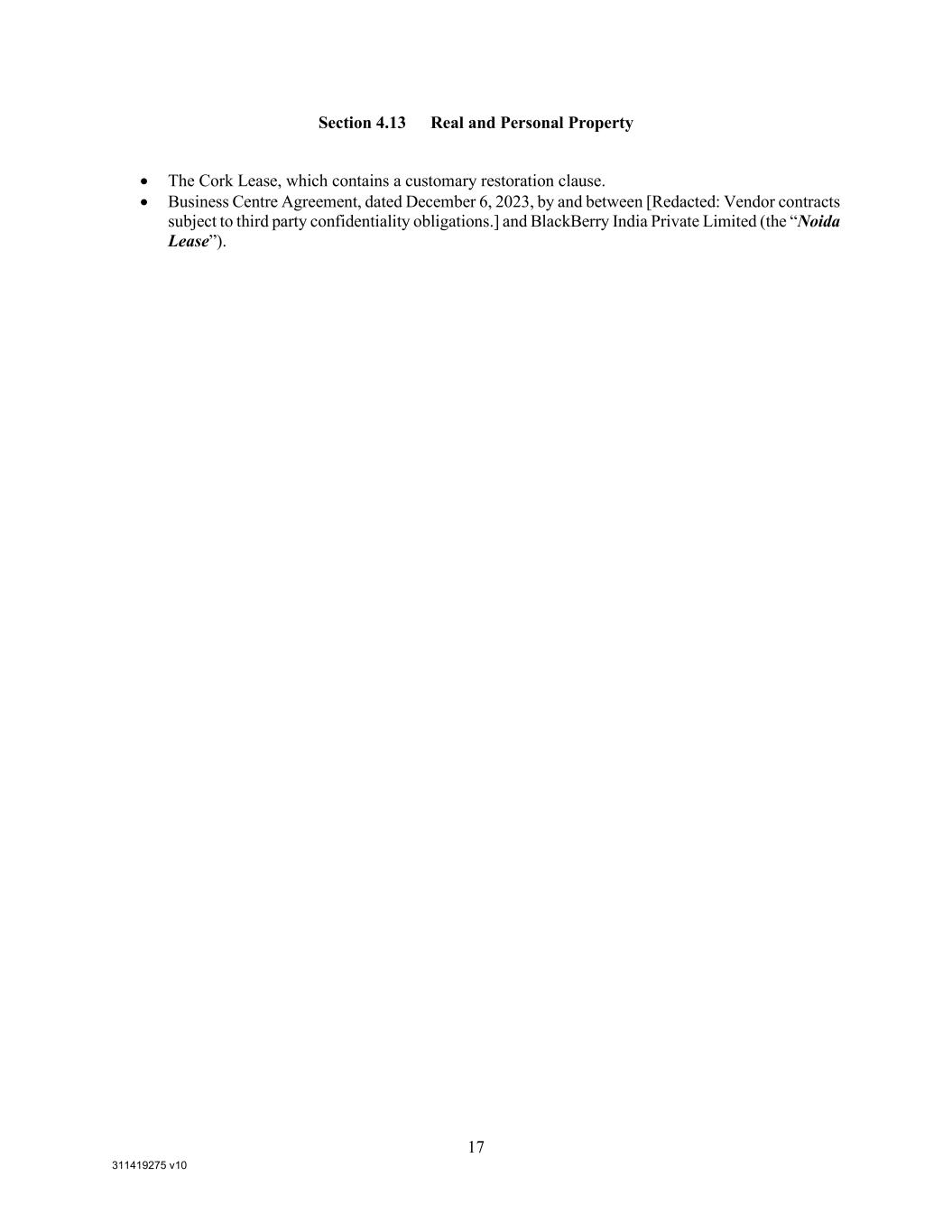 311419275 v10 17 Section 4.13 Real and Personal Property • The Cork Lease, which contains a customary restoration clause. • Business Centre Agreement, dated December 6, 2023, by and between [Redacted: Vendor contracts subject to third party confidentiality obligations.] and BlackBerry India Private Limited (the “Noida Lease”).