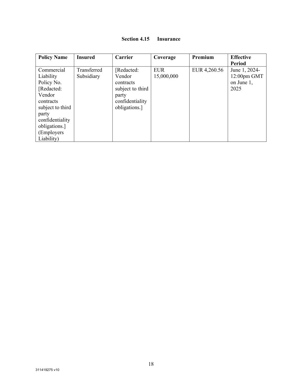 311419275 v10 18 Section 4.15 Insurance Policy Name Insured Carrier Coverage Premium Effective Period Commercial Liability Policy No. [Redacted: Vendor contracts subject to third party confidentiality obligations.] (Employers Liability) Transferred Subsidiary [Redacted: Vendor contracts subject to third party confidentiality obligations.] EUR 15,000,000 EUR 4,260.56 June 1, 2024- 12:00pm GMT on June 1, 2025