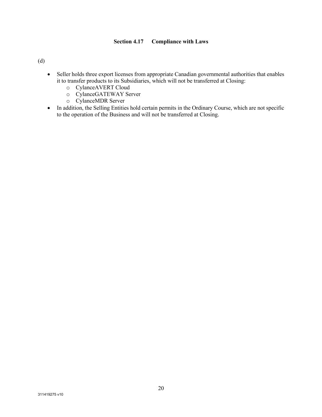 311419275 v10 20 Section 4.17 Compliance with Laws (d) • Seller holds three export licenses from appropriate Canadian governmental authorities that enables it to transfer products to its Subsidiaries, which will not be transferred at Closing: o CylanceAVERT Cloud o CylanceGATEWAY Server o CylanceMDR Server • In addition, the Selling Entities hold certain permits in the Ordinary Course, which are not specific to the operation of the Business and will not be transferred at Closing.