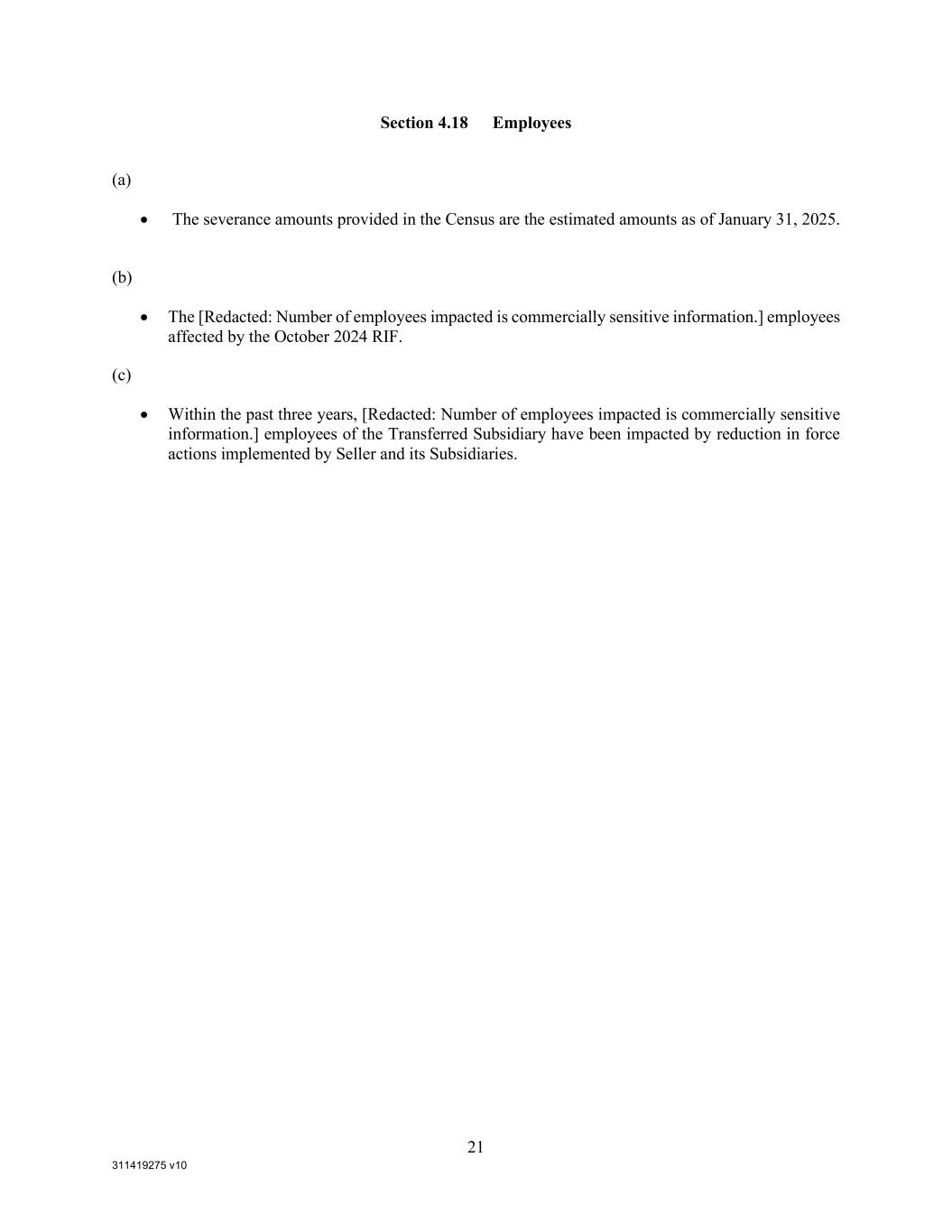 311419275 v10 21 Section 4.18 Employees (a) • The severance amounts provided in the Census are the estimated amounts as of January 31, 2025. (b) • The [Redacted: Number of employees impacted is commercially sensitive information.] employees affected by the October 2024 RIF. (c) • Within the past three years, [Redacted: Number of employees impacted is commercially sensitive information.] employees of the Transferred Subsidiary have been impacted by reduction in force actions implemented by Seller and its Subsidiaries.