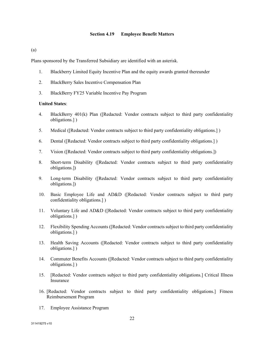 311419275 v10 22 Section 4.19 Employee Benefit Matters (a) Plans sponsored by the Transferred Subsidiary are identified with an asterisk. 1. Blackberry Limited Equity Incentive Plan and the equity awards granted thereunder 2. BlackBerry Sales Incentive Compensation Plan 3. BlackBerry FY25 Variable Incentive Pay Program United States: 4. BlackBerry 401(k) Plan ([Redacted: Vendor contracts subject to third party confidentiality obligations.] ) 5. Medical ([Redacted: Vendor contracts subject to third party confidentiality obligations.] ) 6. Dental ([Redacted: Vendor contracts subject to third party confidentiality obligations.] ) 7. Vision ([Redacted: Vendor contracts subject to third party confidentiality obligations.]) 8. Short-term Disability ([Redacted: Vendor contracts subject to third party confidentiality obligations.]) 9. Long-term Disability ([Redacted: Vendor contracts subject to third party confidentiality obligations.]) 10. Basic Employee Life and AD&D ([Redacted: Vendor contracts subject to third party confidentiality obligations.] ) 11. Voluntary Life and AD&D ([Redacted: Vendor contracts subject to third party confidentiality obligations.] ) 12. Flexibility Spending Accounts ([Redacted: Vendor contracts subject to third party confidentiality obligations.] ) 13. Health Saving Accounts ([Redacted: Vendor contracts subject to third party confidentiality obligations.] ) 14. Commuter Benefits Accounts ([Redacted: Vendor contracts subject to third party confidentiality obligations.] ) 15. [Redacted: Vendor contracts subject to third party confidentiality obligations.] Critical Illness Insurance 16. [Redacted: Vendor contracts subject to third party confidentiality obligations.] Fitness Reimbursement Program 17. Employee Assistance Program