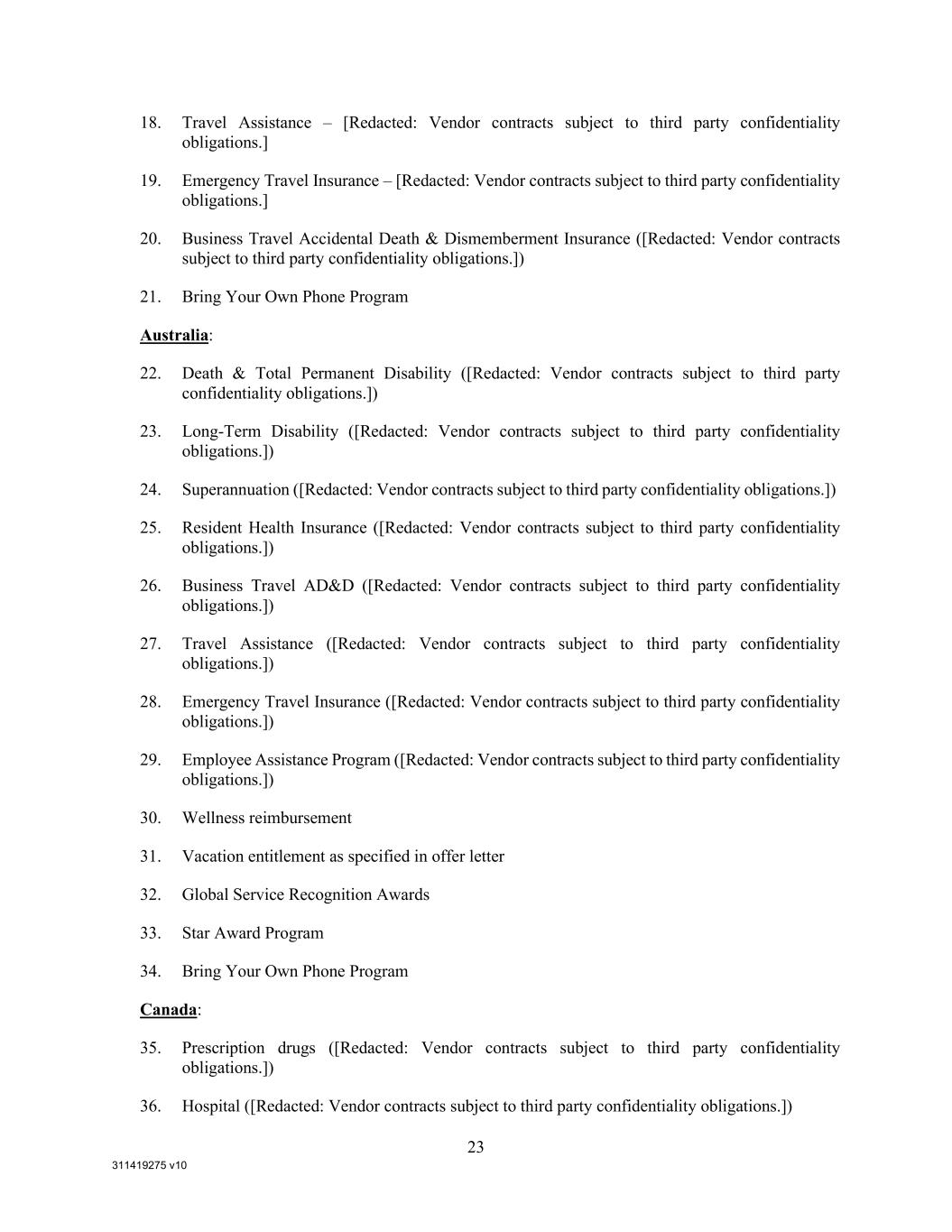 311419275 v10 23 18. Travel Assistance – [Redacted: Vendor contracts subject to third party confidentiality obligations.] 19. Emergency Travel Insurance – [Redacted: Vendor contracts subject to third party confidentiality obligations.] 20. Business Travel Accidental Death & Dismemberment Insurance ([Redacted: Vendor contracts subject to third party confidentiality obligations.]) 21. Bring Your Own Phone Program Australia: 22. Death & Total Permanent Disability ([Redacted: Vendor contracts subject to third party confidentiality obligations.]) 23. Long-Term Disability ([Redacted: Vendor contracts subject to third party confidentiality obligations.]) 24. Superannuation ([Redacted: Vendor contracts subject to third party confidentiality obligations.]) 25. Resident Health Insurance ([Redacted: Vendor contracts subject to third party confidentiality obligations.]) 26. Business Travel AD&D ([Redacted: Vendor contracts subject to third party confidentiality obligations.]) 27. Travel Assistance ([Redacted: Vendor contracts subject to third party confidentiality obligations.]) 28. Emergency Travel Insurance ([Redacted: Vendor contracts subject to third party confidentiality obligations.]) 29. Employee Assistance Program ([Redacted: Vendor contracts subject to third party confidentiality obligations.]) 30. Wellness reimbursement 31. Vacation entitlement as specified in offer letter 32. Global Service Recognition Awards 33. Star Award Program 34. Bring Your Own Phone Program Canada: 35. Prescription drugs ([Redacted: Vendor contracts subject to third party confidentiality obligations.]) 36. Hospital ([Redacted: Vendor contracts subject to third party confidentiality obligations.])
