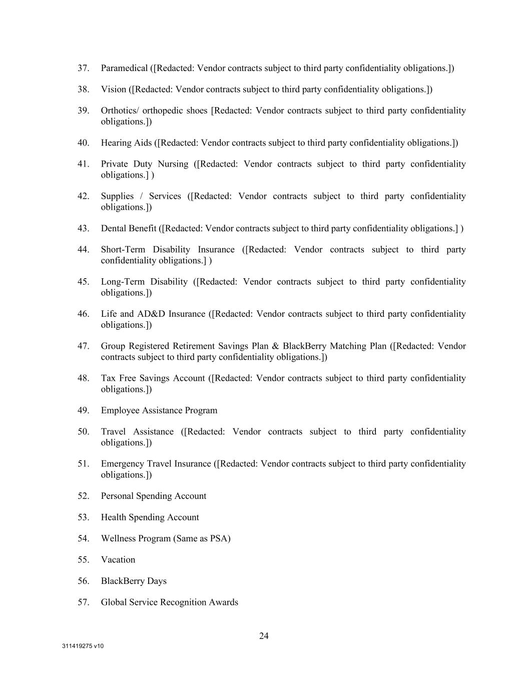 311419275 v10 24 37. Paramedical ([Redacted: Vendor contracts subject to third party confidentiality obligations.]) 38. Vision ([Redacted: Vendor contracts subject to third party confidentiality obligations.]) 39. Orthotics/ orthopedic shoes [Redacted: Vendor contracts subject to third party confidentiality obligations.]) 40. Hearing Aids ([Redacted: Vendor contracts subject to third party confidentiality obligations.]) 41. Private Duty Nursing ([Redacted: Vendor contracts subject to third party confidentiality obligations.] ) 42. Supplies / Services ([Redacted: Vendor contracts subject to third party confidentiality obligations.]) 43. Dental Benefit ([Redacted: Vendor contracts subject to third party confidentiality obligations.] ) 44. Short-Term Disability Insurance ([Redacted: Vendor contracts subject to third party confidentiality obligations.] ) 45. Long-Term Disability ([Redacted: Vendor contracts subject to third party confidentiality obligations.]) 46. Life and AD&D Insurance ([Redacted: Vendor contracts subject to third party confidentiality obligations.]) 47. Group Registered Retirement Savings Plan & BlackBerry Matching Plan ([Redacted: Vendor contracts subject to third party confidentiality obligations.]) 48. Tax Free Savings Account ([Redacted: Vendor contracts subject to third party confidentiality obligations.]) 49. Employee Assistance Program 50. Travel Assistance ([Redacted: Vendor contracts subject to third party confidentiality obligations.]) 51. Emergency Travel Insurance ([Redacted: Vendor contracts subject to third party confidentiality obligations.]) 52. Personal Spending Account 53. Health Spending Account 54. Wellness Program (Same as PSA) 55. Vacation 56. BlackBerry Days 57. Global Service Recognition Awards