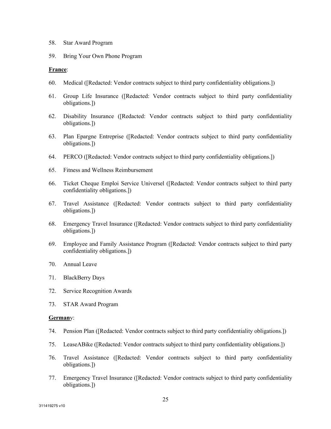 311419275 v10 25 58. Star Award Program 59. Bring Your Own Phone Program France: 60. Medical ([Redacted: Vendor contracts subject to third party confidentiality obligations.]) 61. Group Life Insurance ([Redacted: Vendor contracts subject to third party confidentiality obligations.]) 62. Disability Insurance ([Redacted: Vendor contracts subject to third party confidentiality obligations.]) 63. Plan Epargne Entreprise ([Redacted: Vendor contracts subject to third party confidentiality obligations.]) 64. PERCO ([Redacted: Vendor contracts subject to third party confidentiality obligations.]) 65. Fitness and Wellness Reimbursement 66. Ticket Cheque Emploi Service Universel ([Redacted: Vendor contracts subject to third party confidentiality obligations.]) 67. Travel Assistance ([Redacted: Vendor contracts subject to third party confidentiality obligations.]) 68. Emergency Travel Insurance ([Redacted: Vendor contracts subject to third party confidentiality obligations.]) 69. Employee and Family Assistance Program ([Redacted: Vendor contracts subject to third party confidentiality obligations.]) 70. Annual Leave 71. BlackBerry Days 72. Service Recognition Awards 73. STAR Award Program Germany: 74. Pension Plan ([Redacted: Vendor contracts subject to third party confidentiality obligations.]) 75. LeaseABike ([Redacted: Vendor contracts subject to third party confidentiality obligations.]) 76. Travel Assistance ([Redacted: Vendor contracts subject to third party confidentiality obligations.]) 77. Emergency Travel Insurance ([Redacted: Vendor contracts subject to third party confidentiality obligations.])
