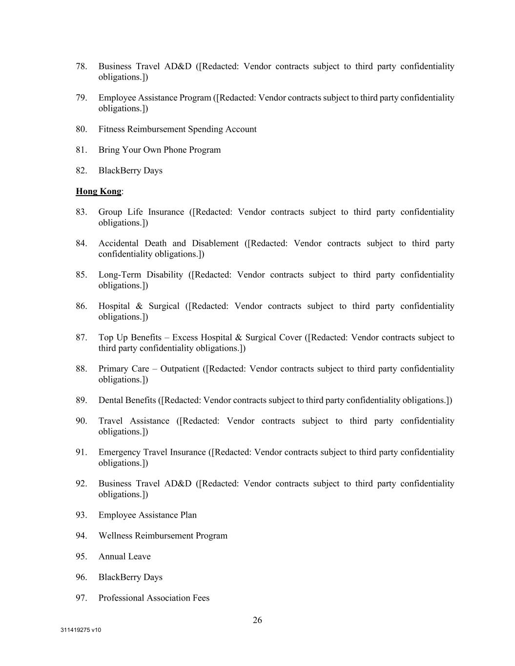311419275 v10 26 78. Business Travel AD&D ([Redacted: Vendor contracts subject to third party confidentiality obligations.]) 79. Employee Assistance Program ([Redacted: Vendor contracts subject to third party confidentiality obligations.]) 80. Fitness Reimbursement Spending Account 81. Bring Your Own Phone Program 82. BlackBerry Days Hong Kong: 83. Group Life Insurance ([Redacted: Vendor contracts subject to third party confidentiality obligations.]) 84. Accidental Death and Disablement ([Redacted: Vendor contracts subject to third party confidentiality obligations.]) 85. Long-Term Disability ([Redacted: Vendor contracts subject to third party confidentiality obligations.]) 86. Hospital & Surgical ([Redacted: Vendor contracts subject to third party confidentiality obligations.]) 87. Top Up Benefits – Excess Hospital & Surgical Cover ([Redacted: Vendor contracts subject to third party confidentiality obligations.]) 88. Primary Care – Outpatient ([Redacted: Vendor contracts subject to third party confidentiality obligations.]) 89. Dental Benefits ([Redacted: Vendor contracts subject to third party confidentiality obligations.]) 90. Travel Assistance ([Redacted: Vendor contracts subject to third party confidentiality obligations.]) 91. Emergency Travel Insurance ([Redacted: Vendor contracts subject to third party confidentiality obligations.]) 92. Business Travel AD&D ([Redacted: Vendor contracts subject to third party confidentiality obligations.]) 93. Employee Assistance Plan 94. Wellness Reimbursement Program 95. Annual Leave 96. BlackBerry Days 97. Professional Association Fees