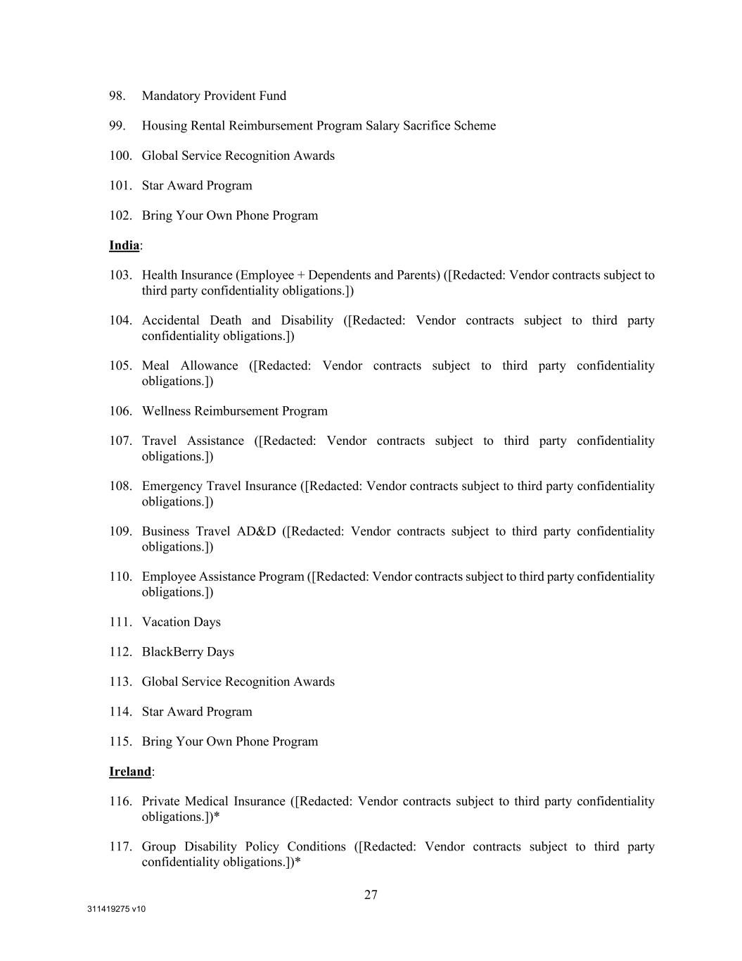 311419275 v10 27 98. Mandatory Provident Fund 99. Housing Rental Reimbursement Program Salary Sacrifice Scheme 100. Global Service Recognition Awards 101. Star Award Program 102. Bring Your Own Phone Program India: 103. Health Insurance (Employee + Dependents and Parents) ([Redacted: Vendor contracts subject to third party confidentiality obligations.]) 104. Accidental Death and Disability ([Redacted: Vendor contracts subject to third party confidentiality obligations.]) 105. Meal Allowance ([Redacted: Vendor contracts subject to third party confidentiality obligations.]) 106. Wellness Reimbursement Program 107. Travel Assistance ([Redacted: Vendor contracts subject to third party confidentiality obligations.]) 108. Emergency Travel Insurance ([Redacted: Vendor contracts subject to third party confidentiality obligations.]) 109. Business Travel AD&D ([Redacted: Vendor contracts subject to third party confidentiality obligations.]) 110. Employee Assistance Program ([Redacted: Vendor contracts subject to third party confidentiality obligations.]) 111. Vacation Days 112. BlackBerry Days 113. Global Service Recognition Awards 114. Star Award Program 115. Bring Your Own Phone Program Ireland: 116. Private Medical Insurance ([Redacted: Vendor contracts subject to third party confidentiality obligations.])* 117. Group Disability Policy Conditions ([Redacted: Vendor contracts subject to third party confidentiality obligations.])*