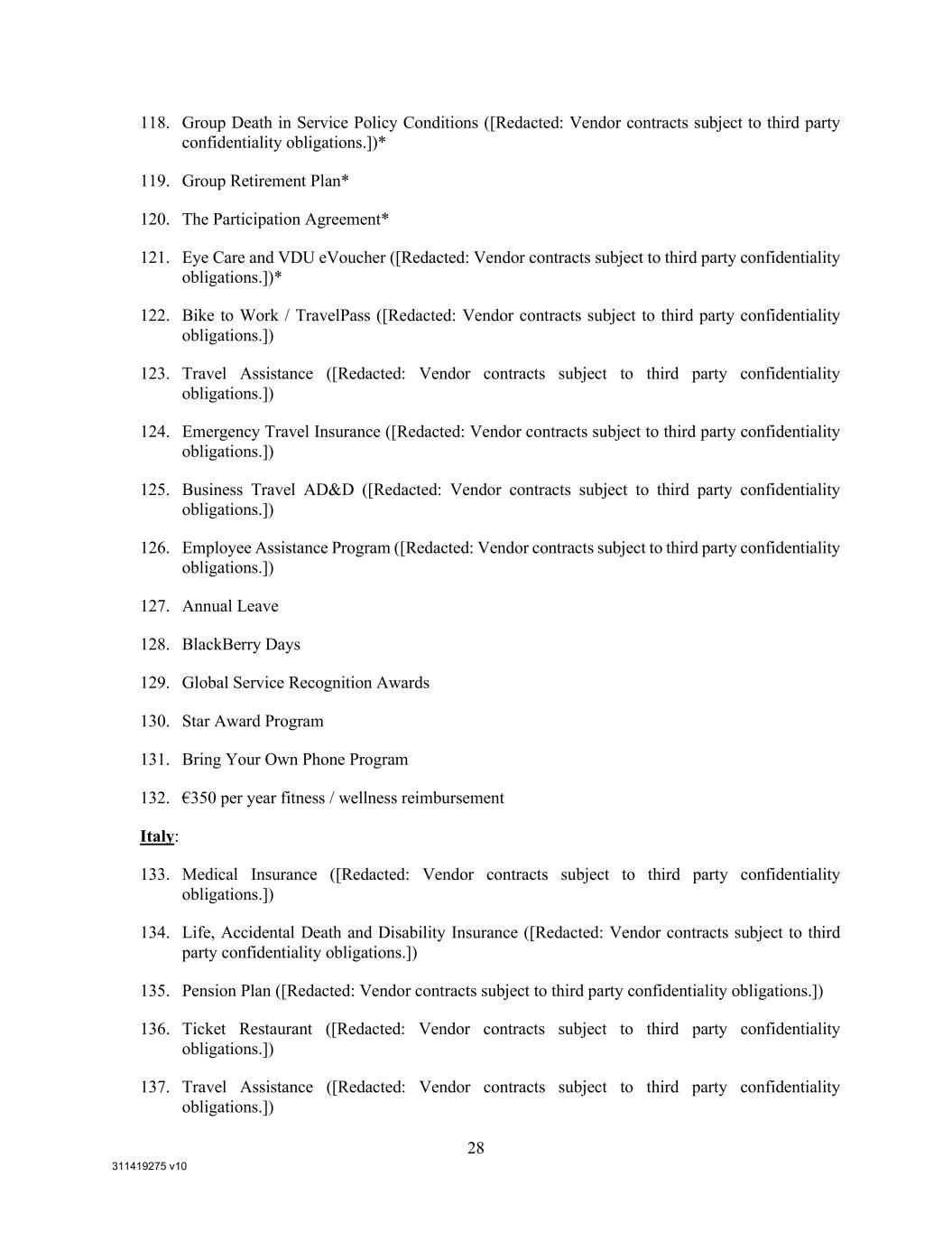 311419275 v10 28 118. Group Death in Service Policy Conditions ([Redacted: Vendor contracts subject to third party confidentiality obligations.])* 119. Group Retirement Plan* 120. The Participation Agreement* 121. Eye Care and VDU eVoucher ([Redacted: Vendor contracts subject to third party confidentiality obligations.])* 122. Bike to Work / TravelPass ([Redacted: Vendor contracts subject to third party confidentiality obligations.]) 123. Travel Assistance ([Redacted: Vendor contracts subject to third party confidentiality obligations.]) 124. Emergency Travel Insurance ([Redacted: Vendor contracts subject to third party confidentiality obligations.]) 125. Business Travel AD&D ([Redacted: Vendor contracts subject to third party confidentiality obligations.]) 126. Employee Assistance Program ([Redacted: Vendor contracts subject to third party confidentiality obligations.]) 127. Annual Leave 128. BlackBerry Days 129. Global Service Recognition Awards 130. Star Award Program 131. Bring Your Own Phone Program 132. €350 per year fitness / wellness reimbursement Italy: 133. Medical Insurance ([Redacted: Vendor contracts subject to third party confidentiality obligations.]) 134. Life, Accidental Death and Disability Insurance ([Redacted: Vendor contracts subject to third party confidentiality obligations.]) 135. Pension Plan ([Redacted: Vendor contracts subject to third party confidentiality obligations.]) 136. Ticket Restaurant ([Redacted: Vendor contracts subject to third party confidentiality obligations.]) 137. Travel Assistance ([Redacted: Vendor contracts subject to third party confidentiality obligations.])