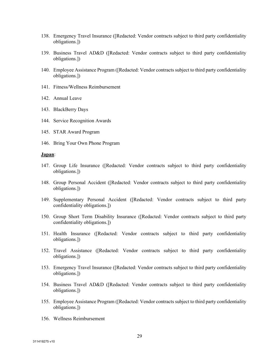 311419275 v10 29 138. Emergency Travel Insurance ([Redacted: Vendor contracts subject to third party confidentiality obligations.]) 139. Business Travel AD&D ([Redacted: Vendor contracts subject to third party confidentiality obligations.]) 140. Employee Assistance Program ([Redacted: Vendor contracts subject to third party confidentiality obligations.]) 141. Fitness/Wellness Reimbursement 142. Annual Leave 143. BlackBerry Days 144. Service Recognition Awards 145. STAR Award Program 146. Bring Your Own Phone Program Japan: 147. Group Life Insurance ([Redacted: Vendor contracts subject to third party confidentiality obligations.]) 148. Group Personal Accident ([Redacted: Vendor contracts subject to third party confidentiality obligations.]) 149. Supplementary Personal Accident ([Redacted: Vendor contracts subject to third party confidentiality obligations.]) 150. Group Short Term Disability Insurance ([Redacted: Vendor contracts subject to third party confidentiality obligations.]) 151. Health Insurance ([Redacted: Vendor contracts subject to third party confidentiality obligations.]) 152. Travel Assistance ([Redacted: Vendor contracts subject to third party confidentiality obligations.]) 153. Emergency Travel Insurance ([Redacted: Vendor contracts subject to third party confidentiality obligations.]) 154. Business Travel AD&D ([Redacted: Vendor contracts subject to third party confidentiality obligations.]) 155. Employee Assistance Program ([Redacted: Vendor contracts subject to third party confidentiality obligations.]) 156. Wellness Reimbursement