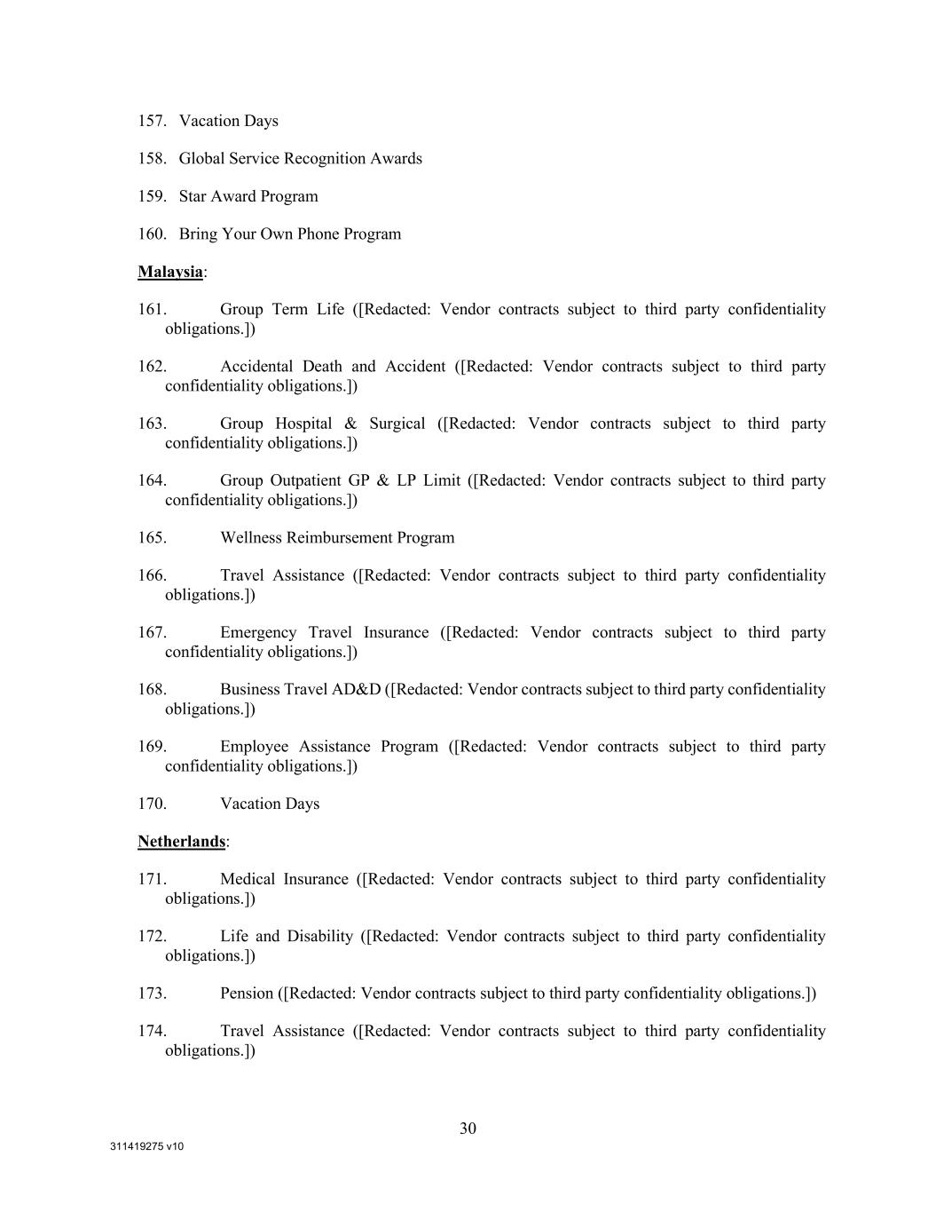 311419275 v10 30 157. Vacation Days 158. Global Service Recognition Awards 159. Star Award Program 160. Bring Your Own Phone Program Malaysia: 161. Group Term Life ([Redacted: Vendor contracts subject to third party confidentiality obligations.]) 162. Accidental Death and Accident ([Redacted: Vendor contracts subject to third party confidentiality obligations.]) 163. Group Hospital & Surgical ([Redacted: Vendor contracts subject to third party confidentiality obligations.]) 164. Group Outpatient GP & LP Limit ([Redacted: Vendor contracts subject to third party confidentiality obligations.]) 165. Wellness Reimbursement Program 166. Travel Assistance ([Redacted: Vendor contracts subject to third party confidentiality obligations.]) 167. Emergency Travel Insurance ([Redacted: Vendor contracts subject to third party confidentiality obligations.]) 168. Business Travel AD&D ([Redacted: Vendor contracts subject to third party confidentiality obligations.]) 169. Employee Assistance Program ([Redacted: Vendor contracts subject to third party confidentiality obligations.]) 170. Vacation Days Netherlands: 171. Medical Insurance ([Redacted: Vendor contracts subject to third party confidentiality obligations.]) 172. Life and Disability ([Redacted: Vendor contracts subject to third party confidentiality obligations.]) 173. Pension ([Redacted: Vendor contracts subject to third party confidentiality obligations.]) 174. Travel Assistance ([Redacted: Vendor contracts subject to third party confidentiality obligations.])
