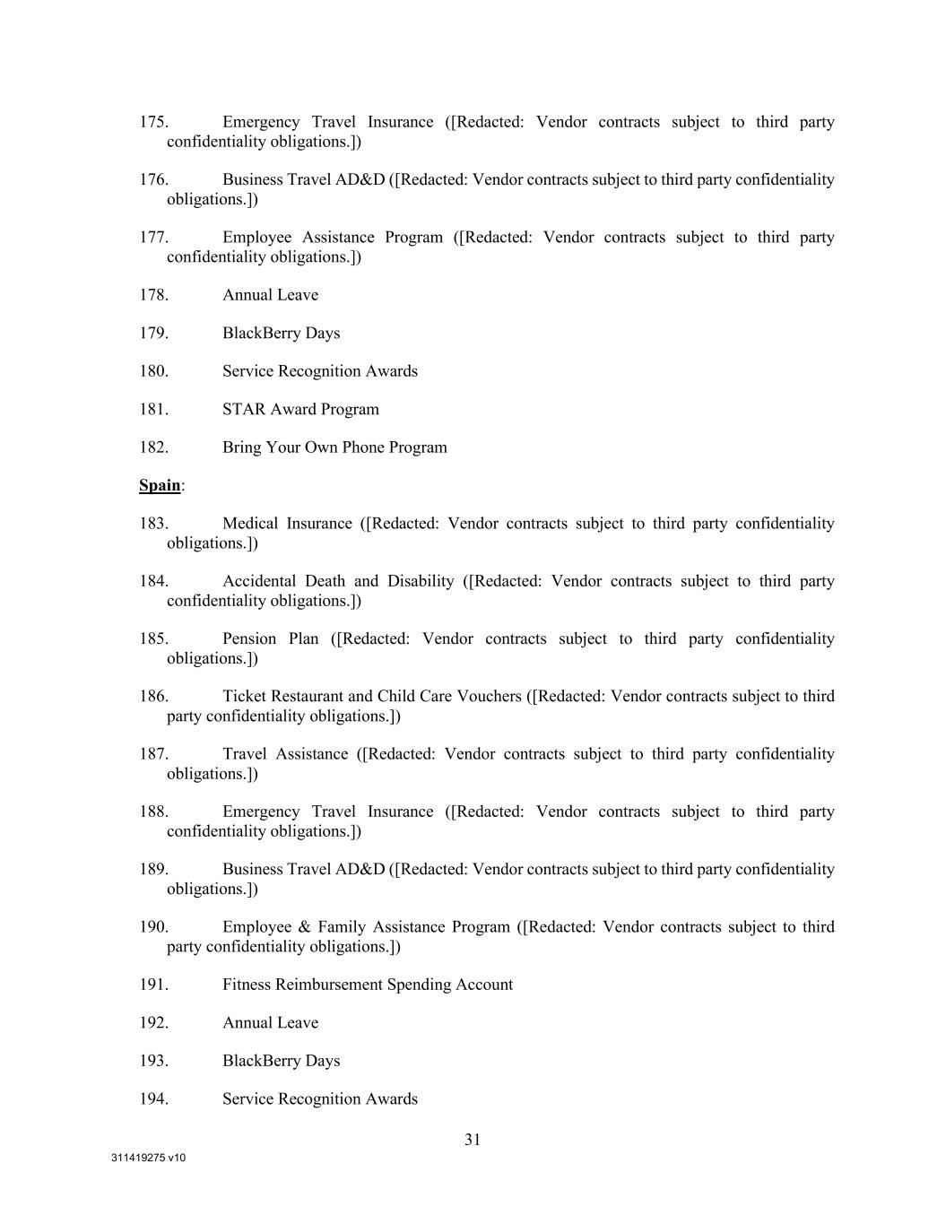 311419275 v10 31 175. Emergency Travel Insurance ([Redacted: Vendor contracts subject to third party confidentiality obligations.]) 176. Business Travel AD&D ([Redacted: Vendor contracts subject to third party confidentiality obligations.]) 177. Employee Assistance Program ([Redacted: Vendor contracts subject to third party confidentiality obligations.]) 178. Annual Leave 179. BlackBerry Days 180. Service Recognition Awards 181. STAR Award Program 182. Bring Your Own Phone Program Spain: 183. Medical Insurance ([Redacted: Vendor contracts subject to third party confidentiality obligations.]) 184. Accidental Death and Disability ([Redacted: Vendor contracts subject to third party confidentiality obligations.]) 185. Pension Plan ([Redacted: Vendor contracts subject to third party confidentiality obligations.]) 186. Ticket Restaurant and Child Care Vouchers ([Redacted: Vendor contracts subject to third party confidentiality obligations.]) 187. Travel Assistance ([Redacted: Vendor contracts subject to third party confidentiality obligations.]) 188. Emergency Travel Insurance ([Redacted: Vendor contracts subject to third party confidentiality obligations.]) 189. Business Travel AD&D ([Redacted: Vendor contracts subject to third party confidentiality obligations.]) 190. Employee & Family Assistance Program ([Redacted: Vendor contracts subject to third party confidentiality obligations.]) 191. Fitness Reimbursement Spending Account 192. Annual Leave 193. BlackBerry Days 194. Service Recognition Awards