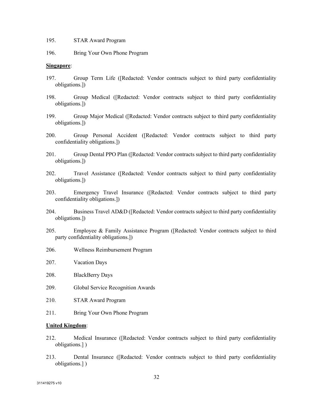 311419275 v10 32 195. STAR Award Program 196. Bring Your Own Phone Program Singapore: 197. Group Term Life ([Redacted: Vendor contracts subject to third party confidentiality obligations.]) 198. Group Medical ([Redacted: Vendor contracts subject to third party confidentiality obligations.]) 199. Group Major Medical ([Redacted: Vendor contracts subject to third party confidentiality obligations.]) 200. Group Personal Accident ([Redacted: Vendor contracts subject to third party confidentiality obligations.]) 201. Group Dental PPO Plan ([Redacted: Vendor contracts subject to third party confidentiality obligations.]) 202. Travel Assistance ([Redacted: Vendor contracts subject to third party confidentiality obligations.]) 203. Emergency Travel Insurance ([Redacted: Vendor contracts subject to third party confidentiality obligations.]) 204. Business Travel AD&D ([Redacted: Vendor contracts subject to third party confidentiality obligations.]) 205. Employee & Family Assistance Program ([Redacted: Vendor contracts subject to third party confidentiality obligations.]) 206. Wellness Reimbursement Program 207. Vacation Days 208. BlackBerry Days 209. Global Service Recognition Awards 210. STAR Award Program 211. Bring Your Own Phone Program United Kingdom: 212. Medical Insurance ([Redacted: Vendor contracts subject to third party confidentiality obligations.] ) 213. Dental Insurance ([Redacted: Vendor contracts subject to third party confidentiality obligations.] )