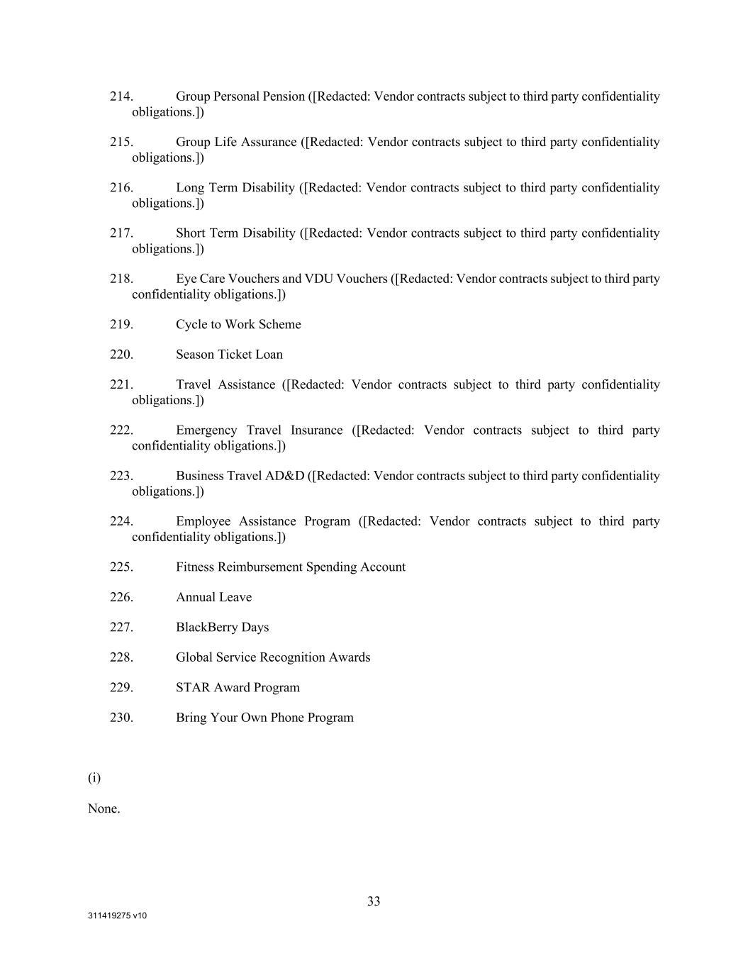 311419275 v10 33 214. Group Personal Pension ([Redacted: Vendor contracts subject to third party confidentiality obligations.]) 215. Group Life Assurance ([Redacted: Vendor contracts subject to third party confidentiality obligations.]) 216. Long Term Disability ([Redacted: Vendor contracts subject to third party confidentiality obligations.]) 217. Short Term Disability ([Redacted: Vendor contracts subject to third party confidentiality obligations.]) 218. Eye Care Vouchers and VDU Vouchers ([Redacted: Vendor contracts subject to third party confidentiality obligations.]) 219. Cycle to Work Scheme 220. Season Ticket Loan 221. Travel Assistance ([Redacted: Vendor contracts subject to third party confidentiality obligations.]) 222. Emergency Travel Insurance ([Redacted: Vendor contracts subject to third party confidentiality obligations.]) 223. Business Travel AD&D ([Redacted: Vendor contracts subject to third party confidentiality obligations.]) 224. Employee Assistance Program ([Redacted: Vendor contracts subject to third party confidentiality obligations.]) 225. Fitness Reimbursement Spending Account 226. Annual Leave 227. BlackBerry Days 228. Global Service Recognition Awards 229. STAR Award Program 230. Bring Your Own Phone Program (i) None.