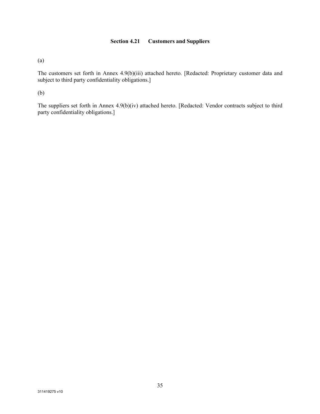 311419275 v10 35 Section 4.21 Customers and Suppliers (a) The customers set forth in Annex 4.9(b)(iii) attached hereto. [Redacted: Proprietary customer data and subject to third party confidentiality obligations.] (b) The suppliers set forth in Annex 4.9(b)(iv) attached hereto. [Redacted: Vendor contracts subject to third party confidentiality obligations.]