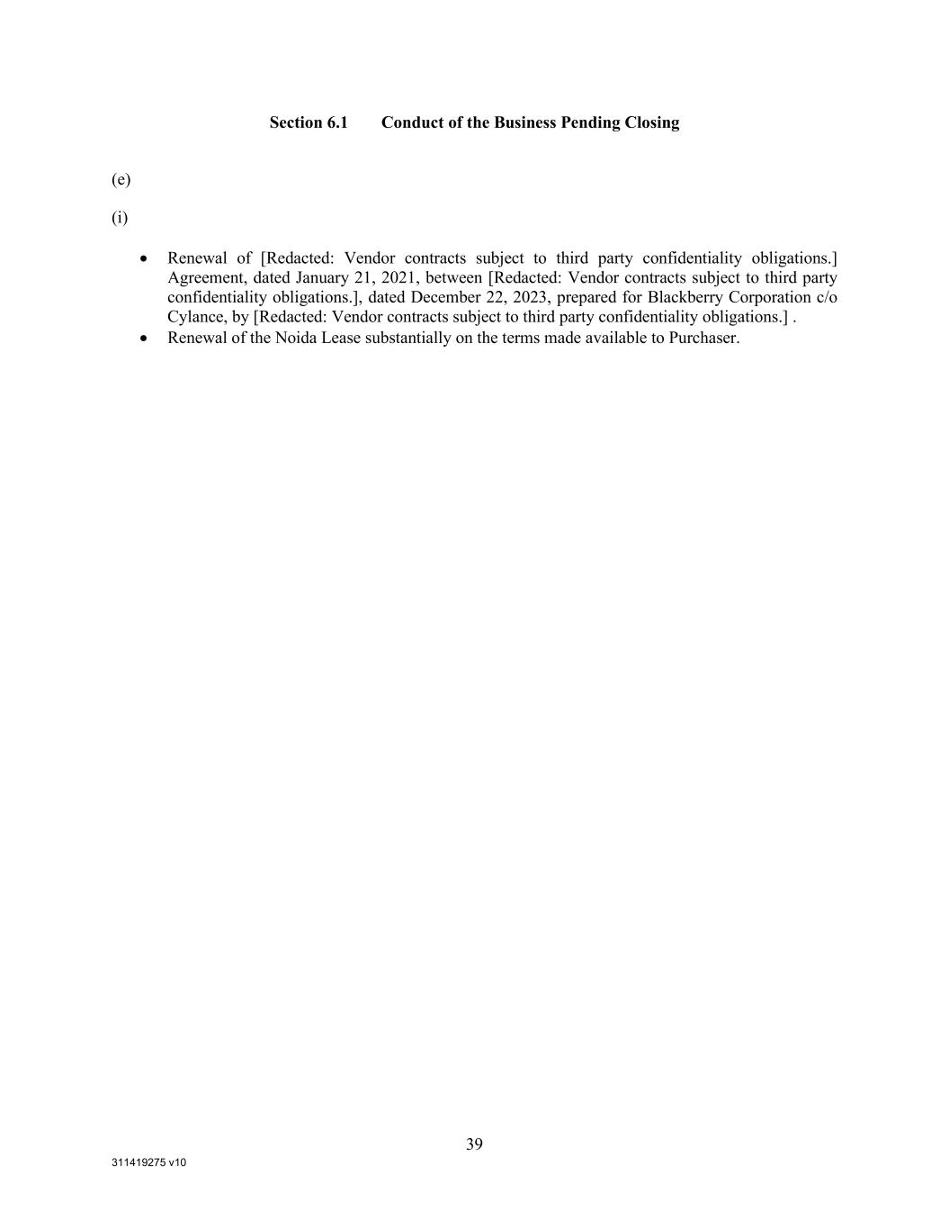 311419275 v10 39 Section 6.1 Conduct of the Business Pending Closing (e) (i) • Renewal of [Redacted: Vendor contracts subject to third party confidentiality obligations.] Agreement, dated January 21, 2021, between [Redacted: Vendor contracts subject to third party confidentiality obligations.], dated December 22, 2023, prepared for Blackberry Corporation c/o Cylance, by [Redacted: Vendor contracts subject to third party confidentiality obligations.] . • Renewal of the Noida Lease substantially on the terms made available to Purchaser.