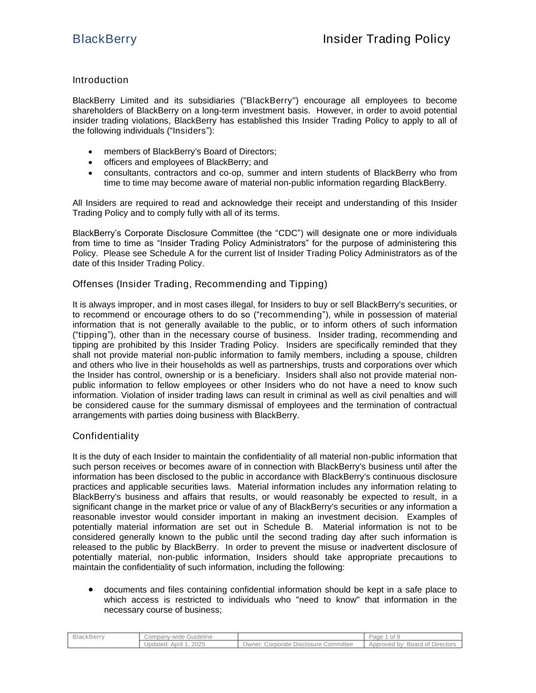 BlackBerry Insider Trading Policy BlackBerry Company-wide Guideline Page 1 of 8 Updated: April 1, 2025 Owner: Corporate Disclosure Committee Approved by: Board of Directors Introduction BlackBerry Limited and its subsidiaries ("BlackBerry") encourage all employees to become shareholders of BlackBerry on a long-term investment basis. However, in order to avoid potential insider trading violations, BlackBerry has established this Insider Trading Policy to apply to all of the following individuals (“Insiders”): • members of BlackBerry's Board of Directors; • officers and employees of BlackBerry; and • consultants, contractors and co-op, summer and intern students of BlackBerry who from time to time may become aware of material non-public information regarding BlackBerry. All Insiders are required to read and acknowledge their receipt and understanding of this Insider Trading Policy and to comply fully with all of its terms. BlackBerry’s Corporate Disclosure Committee (the “CDC”) will designate one or more individuals from time to time as “Insider Trading Policy Administrators” for the purpose of administering this Policy. Please see Schedule A for the current list of Insider Trading Policy Administrators as of the date of this Insider Trading Policy. Offenses (Insider Trading, Recommending and Tipping) It is always improper, and in most cases illegal, for Insiders to buy or sell BlackBerry's securities, or to recommend or encourage others to do so (“recommending”), while in possession of material information that is not generally available to the public, or to inform others of such information (“tipping”), other than in the necessary course of business. Insider trading, recommending and tipping are prohibited by this Insider Trading Policy. Insiders are specifically reminded that they shall not provide material non-public information to family members, including a spouse, children and others who live in their households as well as partnerships, trusts and corporations over which the Insider has control, ownership or is a beneficiary. Insiders shall also not provide material non- public information to fellow employees or other Insiders who do not have a need to know such information. Violation of insider trading laws can result in criminal as well as civil penalties and will be considered cause for the summary dismissal of employees and the termination of contractual arrangements with parties doing business with BlackBerry. Confidentiality It is the duty of each Insider to maintain the confidentiality of all material non-public information that such person receives or becomes aware of in connection with BlackBerry's business until after the information has been disclosed to the public in accordance with BlackBerry's continuous disclosure practices and applicable securities laws. Material information includes any information relating to BlackBerry's business and affairs that results, or would reasonably be expected to result, in a significant change in the market price or value of any of BlackBerry's securities or any information a reasonable investor would consider important in making an investment decision. Examples of potentially material information are set out in Schedule B. Material information is not to be considered generally known to the public until the second trading day after such information is released to the public by BlackBerry. In order to prevent the misuse or inadvertent disclosure of potentially material, non-public information, Insiders should take appropriate precautions to maintain the confidentiality of such information, including the following: • documents and files containing confidential information should be kept in a safe place to which access is restricted to individuals who "need to know" that information in the necessary course of business;