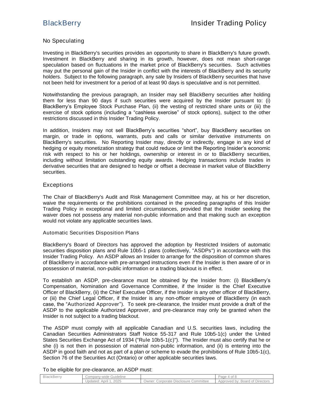BlackBerry Insider Trading Policy BlackBerry Company-wide Guideline Page 4 of 8 Updated: April 1, 2025 Owner: Corporate Disclosure Committee Approved by: Board of Directors No Speculating Investing in BlackBerry's securities provides an opportunity to share in BlackBerry's future growth. Investment in BlackBerry and sharing in its growth, however, does not mean short-range speculation based on fluctuations in the market price of BlackBerry's securities. Such activities may put the personal gain of the Insider in conflict with the interests of BlackBerry and its security holders. Subject to the following paragraph, any sale by Insiders of BlackBerry securities that have not been held for investment for a period of at least 90 days is speculative and is not permitted. Notwithstanding the previous paragraph, an Insider may sell BlackBerry securities after holding them for less than 90 days if such securities were acquired by the Insider pursuant to: (i) BlackBerry’s Employee Stock Purchase Plan, (ii) the vesting of restricted share units or (iii) the exercise of stock options (including a “cashless exercise” of stock options), subject to the other restrictions discussed in this Insider Trading Policy. In addition, Insiders may not sell BlackBerry’s securities “short”, buy BlackBerry securities on margin, or trade in options, warrants, puts and calls or similar derivative instruments on BlackBerry's securities. No Reporting Insider may, directly or indirectly, engage in any kind of hedging or equity monetization strategy that could reduce or limit the Reporting Insider’s economic risk with respect to his or her holdings, ownership or interest in or to BlackBerry securities, including without limitation outstanding equity awards. Hedging transactions include trades in derivative securities that are designed to hedge or offset a decrease in market value of BlackBerry securities. Exceptions The Chair of BlackBerry's Audit and Risk Management Committee may, at his or her discretion, waive the requirements or the prohibitions contained in the preceding paragraphs of this Insider Trading Policy in exceptional and limited circumstances, provided that the Insider seeking the waiver does not possess any material non-public information and that making such an exception would not violate any applicable securities laws. Automatic Securities Disposition Plans BlackBerry's Board of Directors has approved the adoption by Restricted Insiders of automatic securities disposition plans and Rule 10b5-1 plans (collectively, "ASDPs") in accordance with this Insider Trading Policy. An ASDP allows an Insider to arrange for the disposition of common shares of BlackBerry in accordance with pre-arranged instructions even if the Insider is then aware of or in possession of material, non-public information or a trading blackout is in effect. To establish an ASDP, pre-clearance must be obtained by the Insider from: (i) BlackBerry’s Compensation, Nomination and Governance Committee, if the Insider is the Chief Executive Officer of BlackBerry, (ii) the Chief Executive Officer, if the Insider is any other officer of BlackBerry, or (iii) the Chief Legal Officer, if the Insider is any non-officer employee of BlackBerry (in each case, the “Authorized Approver”). To seek pre-clearance, the Insider must provide a draft of the ASDP to the applicable Authorized Approver, and pre-clearance may only be granted when the Insider is not subject to a trading blackout. The ASDP must comply with all applicable Canadian and U.S. securities laws, including the Canadian Securities Administrators Staff Notice 55-317 and Rule 10b5-1(c) under the United States Securities Exchange Act of 1934 ("Rule 10b5-1(c)"). The Insider must also certify that he or she (i) is not then in possession of material non-public information, and (ii) is entering into the ASDP in good faith and not as part of a plan or scheme to evade the prohibitions of Rule 10b5-1(c), Section 76 of the Securities Act (Ontario) or other applicable securities laws. To be eligible for pre-clearance, an ASDP must: