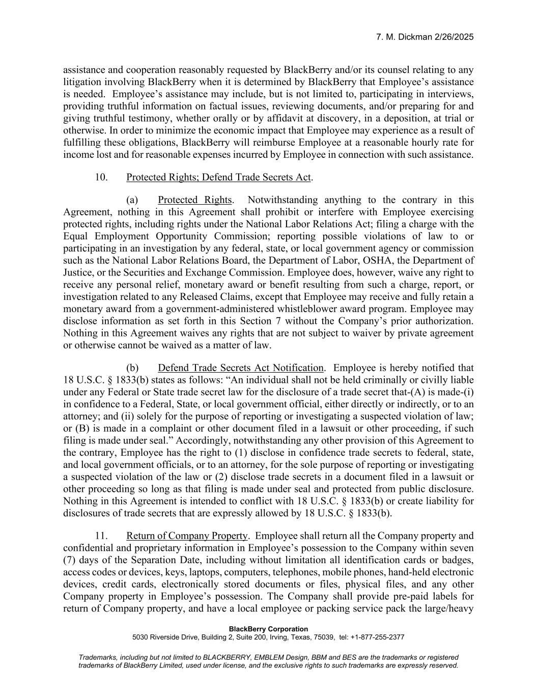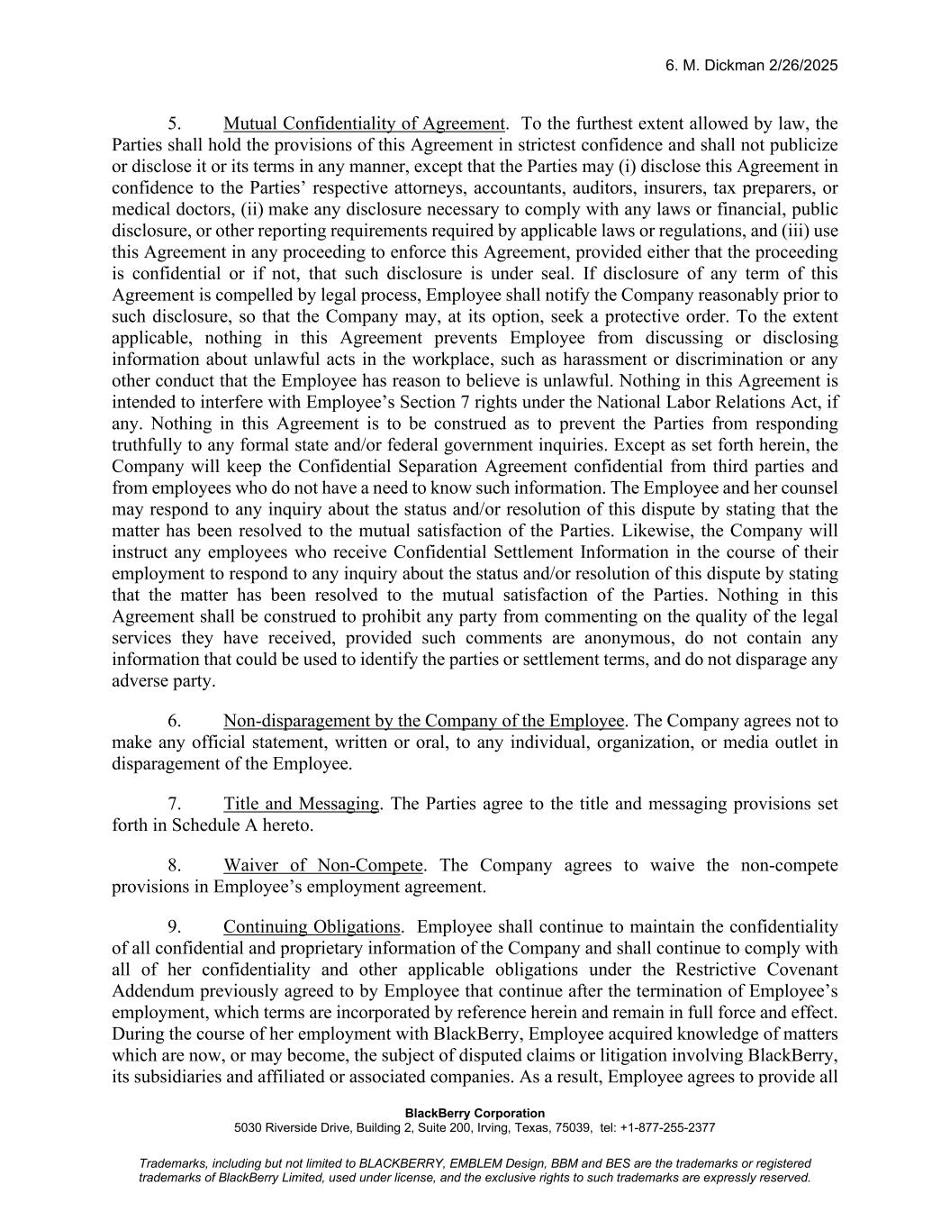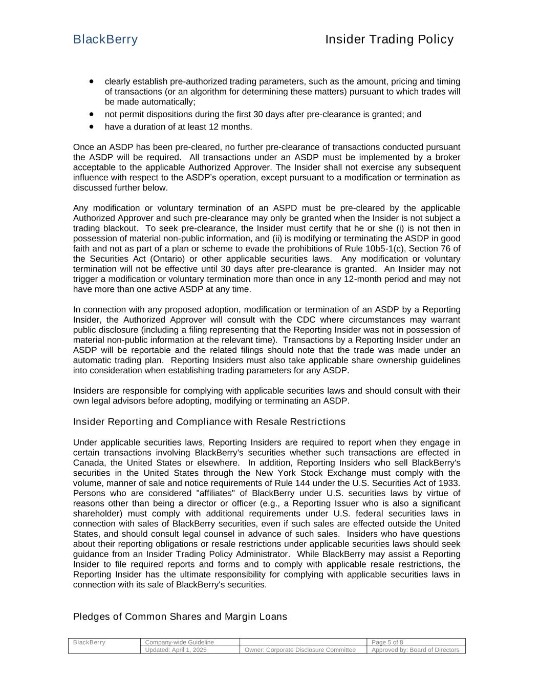 BlackBerry Insider Trading Policy BlackBerry Company-wide Guideline Page 5 of 8 Updated: April 1, 2025 Owner: Corporate Disclosure Committee Approved by: Board of Directors • clearly establish pre-authorized trading parameters, such as the amount, pricing and timing of transactions (or an algorithm for determining these matters) pursuant to which trades will be made automatically; • not permit dispositions during the first 30 days after pre-clearance is granted; and • have a duration of at least 12 months. Once an ASDP has been pre-cleared, no further pre-clearance of transactions conducted pursuant the ASDP will be required. All transactions under an ASDP must be implemented by a broker acceptable to the applicable Authorized Approver. The Insider shall not exercise any subsequent influence with respect to the ASDP’s operation, except pursuant to a modification or termination as discussed further below. Any modification or voluntary termination of an ASPD must be pre-cleared by the applicable Authorized Approver and such pre-clearance may only be granted when the Insider is not subject a trading blackout. To seek pre-clearance, the Insider must certify that he or she (i) is not then in possession of material non-public information, and (ii) is modifying or terminating the ASDP in good faith and not as part of a plan or scheme to evade the prohibitions of Rule 10b5-1(c), Section 76 of the Securities Act (Ontario) or other applicable securities laws. Any modification or voluntary termination will not be effective until 30 days after pre-clearance is granted. An Insider may not trigger a modification or voluntary termination more than once in any 12-month period and may not have more than one active ASDP at any time. In connection with any proposed adoption, modification or termination of an ASDP by a Reporting Insider, the Authorized Approver will consult with the CDC where circumstances may warrant public disclosure (including a filing representing that the Reporting Insider was not in possession of material non-public information at the relevant time). Transactions by a Reporting Insider under an ASDP will be reportable and the related filings should note that the trade was made under an automatic trading plan. Reporting Insiders must also take applicable share ownership guidelines into consideration when establishing trading parameters for any ASDP. Insiders are responsible for complying with applicable securities laws and should consult with their own legal advisors before adopting, modifying or terminating an ASDP. Insider Reporting and Compliance with Resale Restrictions Under applicable securities laws, Reporting Insiders are required to report when they engage in certain transactions involving BlackBerry's securities whether such transactions are effected in Canada, the United States or elsewhere. In addition, Reporting Insiders who sell BlackBerry's securities in the United States through the New York Stock Exchange must comply with the volume, manner of sale and notice requirements of Rule 144 under the U.S. Securities Act of 1933. Persons who are considered "affiliates" of BlackBerry under U.S. securities laws by virtue of reasons other than being a director or officer (e.g., a Reporting Issuer who is also a significant shareholder) must comply with additional requirements under U.S. federal securities laws in connection with sales of BlackBerry securities, even if such sales are effected outside the United States, and should consult legal counsel in advance of such sales. Insiders who have questions about their reporting obligations or resale restrictions under applicable securities laws should seek guidance from an Insider Trading Policy Administrator. While BlackBerry may assist a Reporting Insider to file required reports and forms and to comply with applicable resale restrictions, the Reporting Insider has the ultimate responsibility for complying with applicable securities laws in connection with its sale of BlackBerry's securities. Pledges of Common Shares and Margin Loans