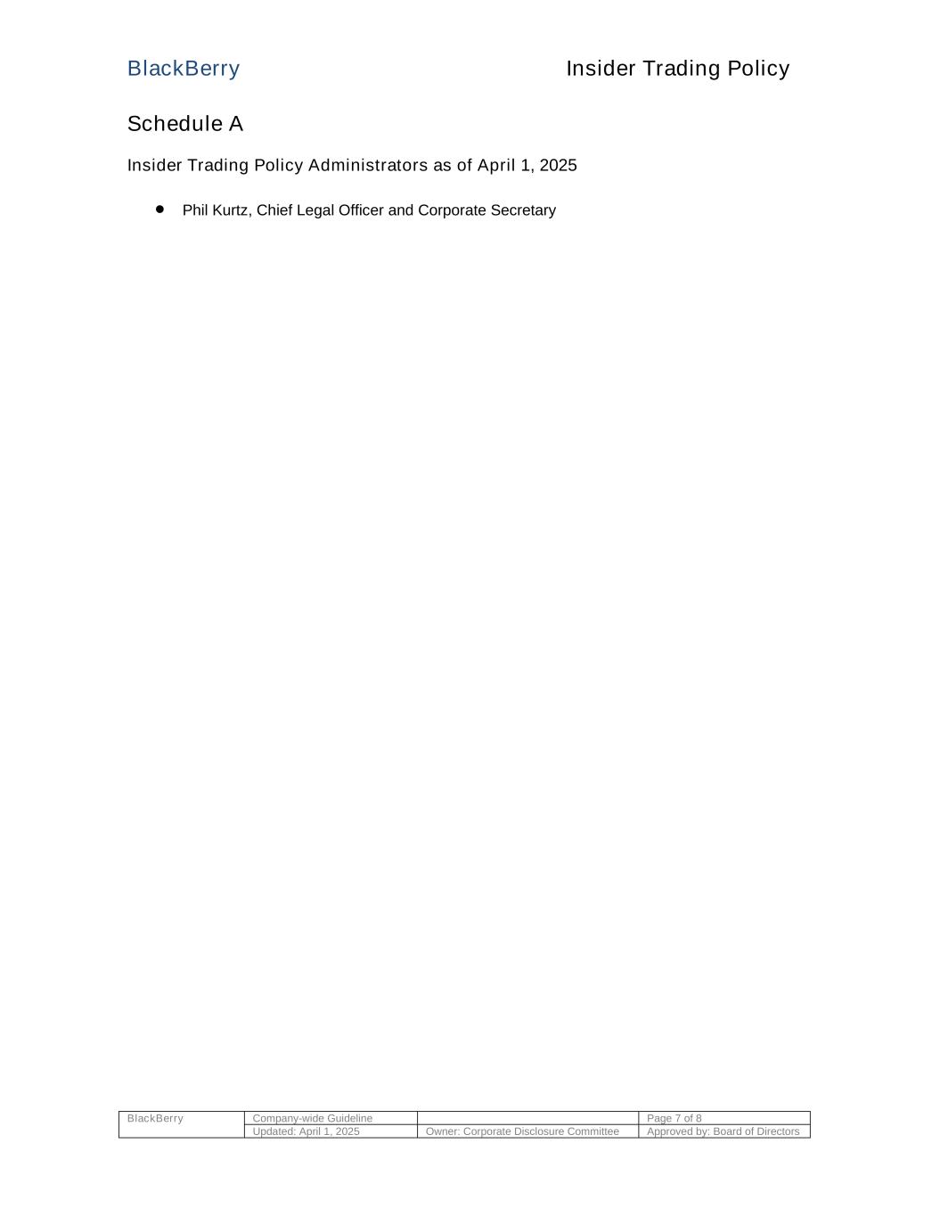 BlackBerry Insider Trading Policy BlackBerry Company-wide Guideline Page 7 of 8 Updated: April 1, 2025 Owner: Corporate Disclosure Committee Approved by: Board of Directors Schedule A Insider Trading Policy Administrators as of April 1, 2025 • Phil Kurtz, Chief Legal Officer and Corporate Secretary
