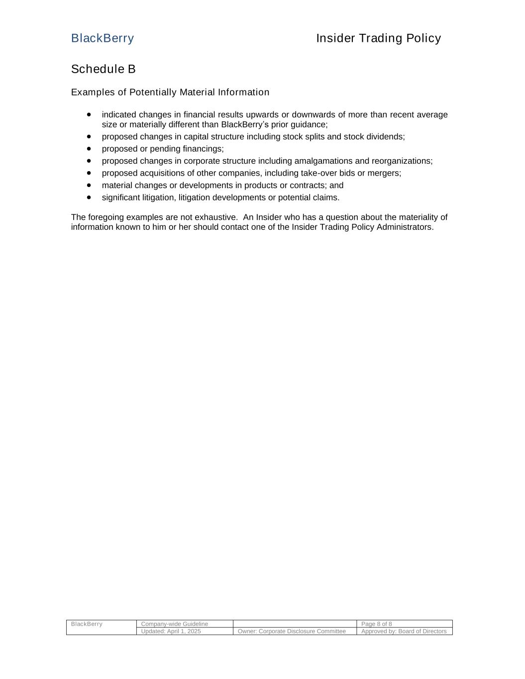 BlackBerry Insider Trading Policy BlackBerry Company-wide Guideline Page 8 of 8 Updated: April 1, 2025 Owner: Corporate Disclosure Committee Approved by: Board of Directors Schedule B Examples of Potentially Material Information • indicated changes in financial results upwards or downwards of more than recent average size or materially different than BlackBerry’s prior guidance; • proposed changes in capital structure including stock splits and stock dividends; • proposed or pending financings; • proposed changes in corporate structure including amalgamations and reorganizations; • proposed acquisitions of other companies, including take-over bids or mergers; • material changes or developments in products or contracts; and • significant litigation, litigation developments or potential claims. The foregoing examples are not exhaustive. An Insider who has a question about the materiality of information known to him or her should contact one of the Insider Trading Policy Administrators.