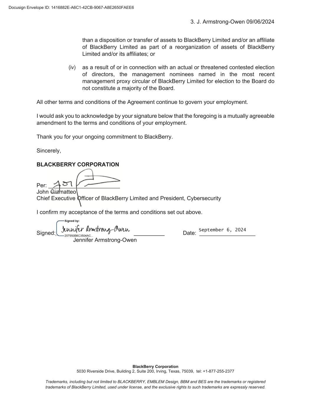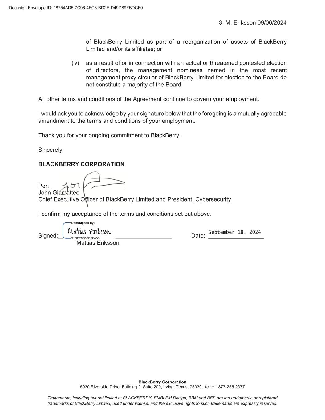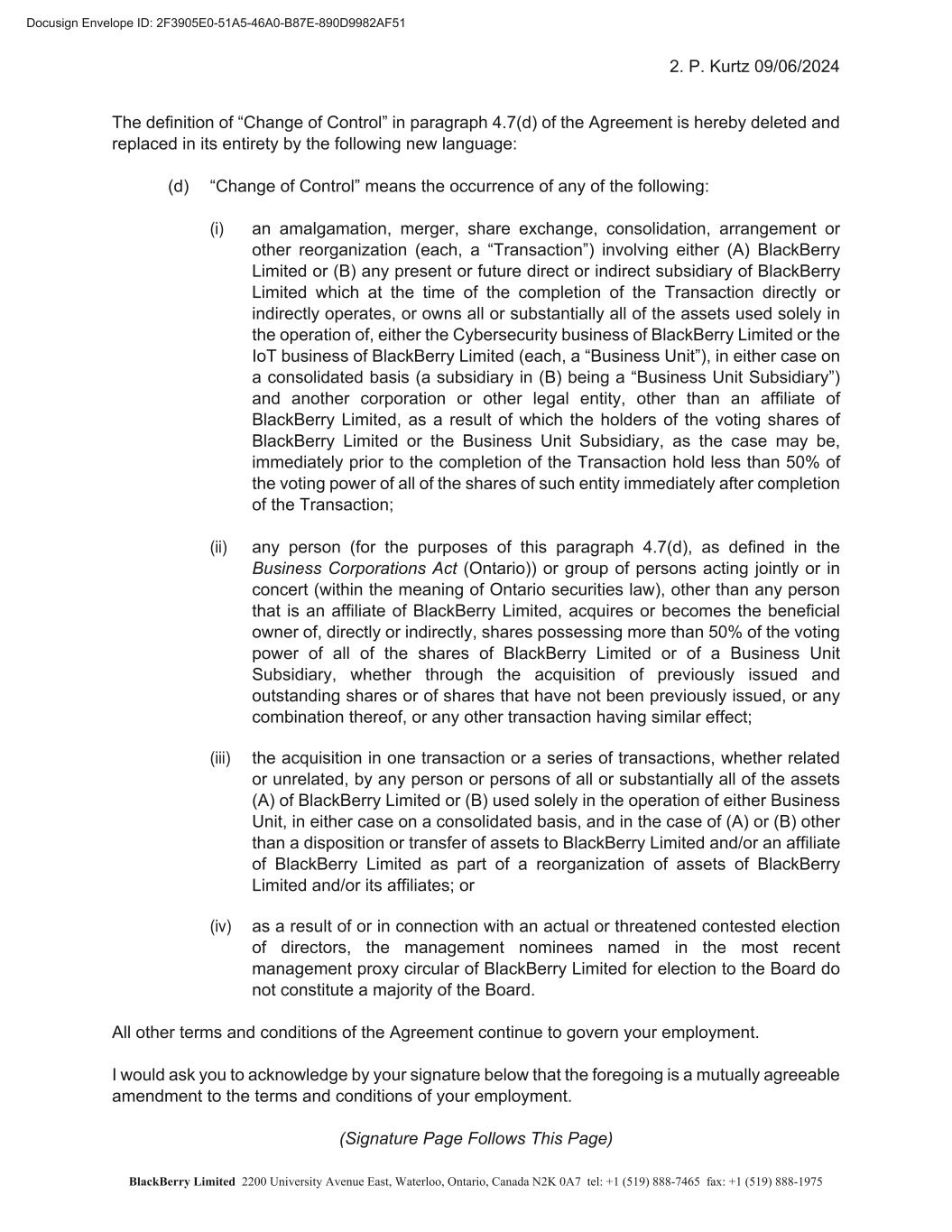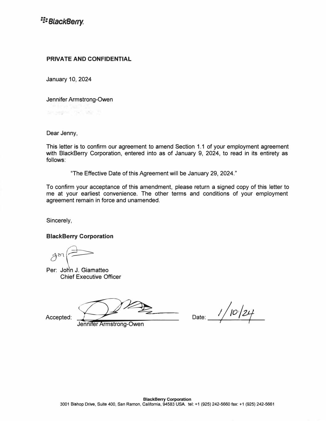 BlackBerry Insider Trading Policy BlackBerry Company-wide Guideline Page 3 of 8 Updated: April 1, 2025 Owner: Corporate Disclosure Committee Approved by: Board of Directors Trading Blackouts BlackBerry imposes a regular trading blackout period which applies to, among others, BlackBerry’s Board of Directors and BlackBerry’s officers who are required to report their securities transactions under applicable securities legislation (“Reporting Insiders”), members of the CDC, and other Insiders determined by the CDC, together with any of their executive assistants (collectively, “Restricted Insiders”). During a regular or special trading blackout, a Restricted Insider may not buy or sell BlackBerry's securities (or the securities of another public company, as applicable) and may not modify their enrollment in or withdraw from the Employee Stock Purchase Plan. The regular trading blackout period begins two weeks prior to the end of a fiscal quarter or fiscal year and ends at 9:00 am EST on the second trading day after the public release of quarter or year-end results. An Insider Trading Policy Administrator will notify by email all persons who are Restricted Insiders under this Insider Trading Policy of such status. Special trading blackouts relating to the securities of BlackBerry or another public company may also be imposed by the CDC or the Board of Directors as a result of special circumstances relating to BlackBerry or the other public company. A special trading blackout may apply to all Insiders or certain Insiders (e.g., Restricted Insiders or persons at BlackBerry who are privy to material, non-public information about a specific matter). An Insider Trading Policy Administrator will notify affected Insiders if a special trading blackout has been imposed and its duration, if known. Affected Insiders will also be notified by email when the trading blackout is lifted. The prohibition on trading by a Restricted Insider during a regular or special trading blackout does not include the sale of common shares under an automatic securities disposition plan adopted by the Insider and pre-cleared by BlackBerry's Board of Directors under the procedures set forth below under "Automatic Securities Disposition Plans". The CDC may also impose other, less formal restrictions on trading pursuant to its Company Acquisition Policy or otherwise. Pre-Clearance Requirement When a trading blackout is not in effect, and in order to avoid any appearance of impropriety, all Restricted Insiders are required to clear, in advance, any trading of BlackBerry's securities in accordance with the instructions contained in the email advising Restricted Insiders that a quarterly regular or special trading blackout has been lifted. This requirement is necessary to confirm that such Restricted Insiders are not in possession of material non-public information (favourable or unfavourable) concerning BlackBerry that has not been publicly disclosed. The CDC may also impose a special pre-clearance requirement on other Insiders from time to time as a result of special circumstances relating to BlackBerry. This special pre-clearance requirement may apply to all Insiders or certain Insiders (e.g., Restricted Insiders or persons at BlackBerry who are aware of material, non-public information about a specific matter). An Insider Trading Policy Administrator will notify affected Insiders of the imposition of a special pre-clearance requirement and its duration, if known. Affected Insiders will also be notified by email when the pre-clearance requirement is lifted, if the duration was not stated at the outset. All Restricted Insiders, even those who believe they are unaware of any material non-public information, must comply with the pre- clearance requirement. Unless otherwise stated, clearance is effective only on the day on which the Restricted Insider is informed by the Insider Trading Policy Administrator that a trade may be effected, and the next trading day thereafter. An Insider Trading Policy Administrator must obtain the approval of the Chief Financial Officer or the Chief Legal Officer prior to pre-clearing a trade by a Reporting Insider or member of the CDC, provided that no person may pre-clear his or her own trade. As noted below, under "Automatic Securities Disposition Plans", additional pre-clearance requirements apply in connection with the adoption by an Insider of an automatic securities disposition plan, but once such a plan is established, trades under the plan do not require further pre-clearance.