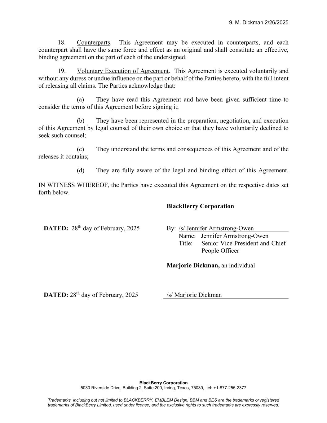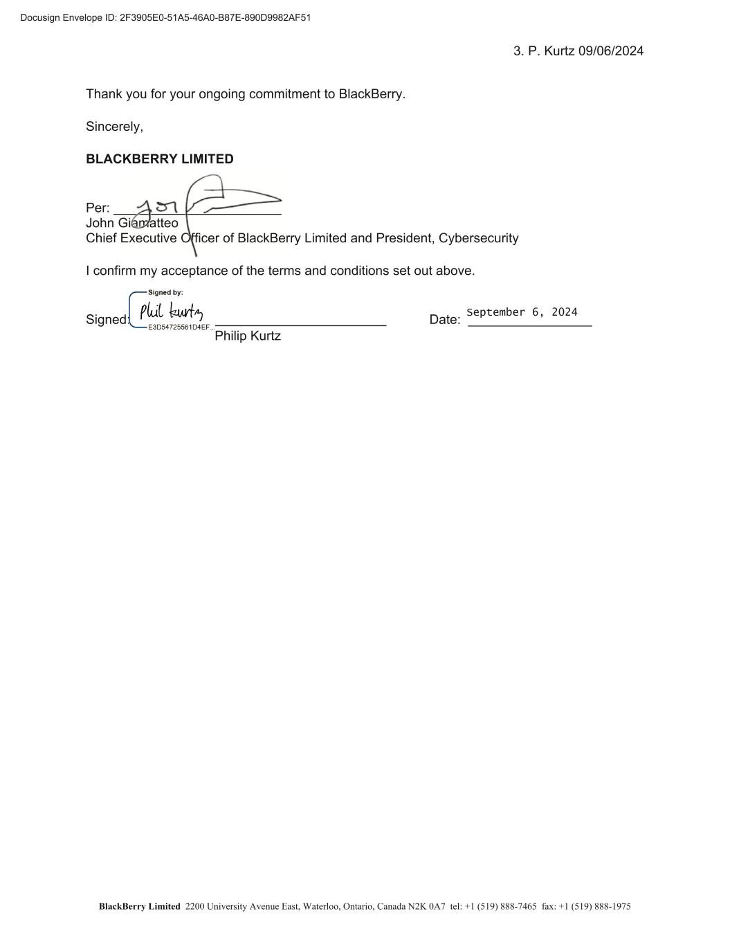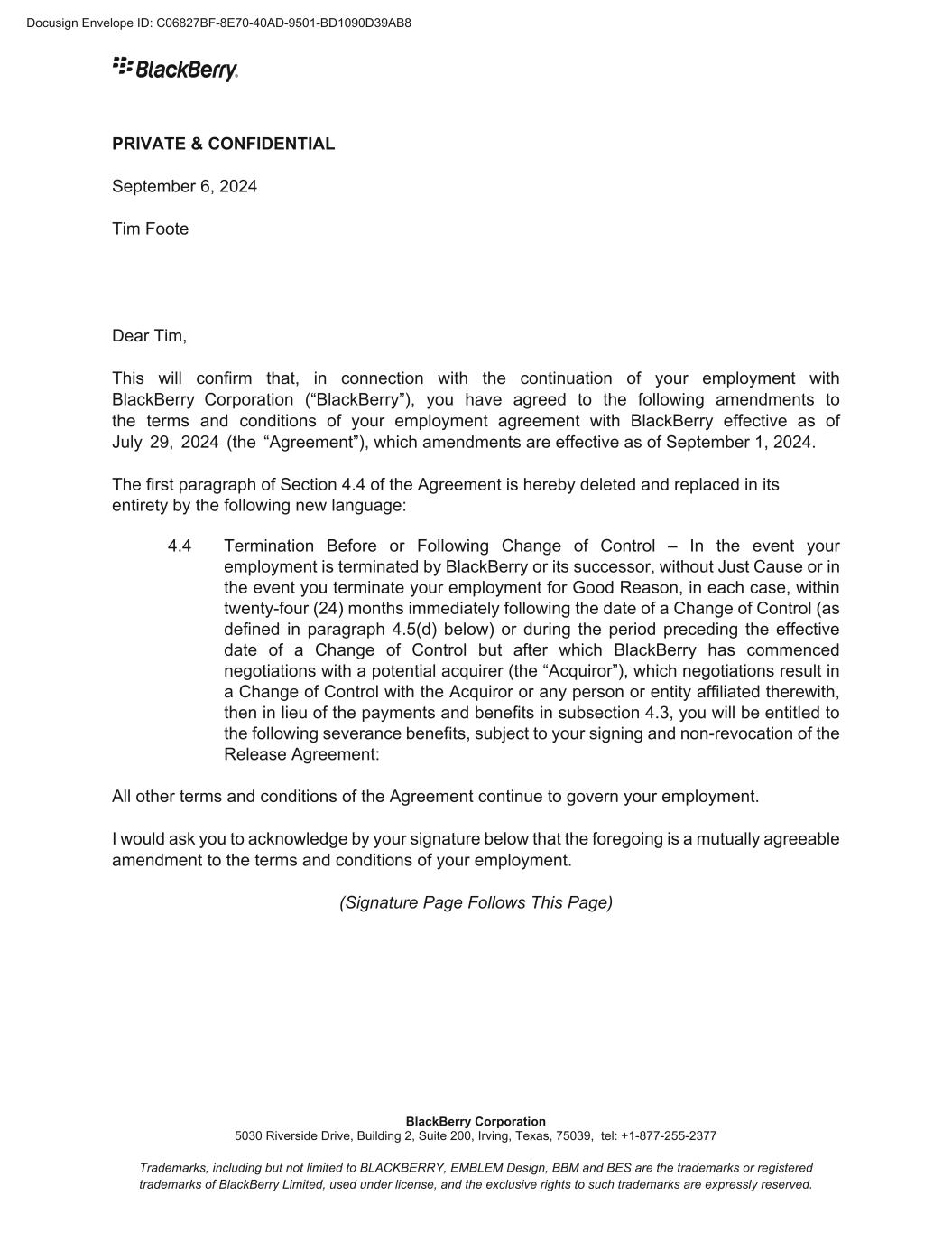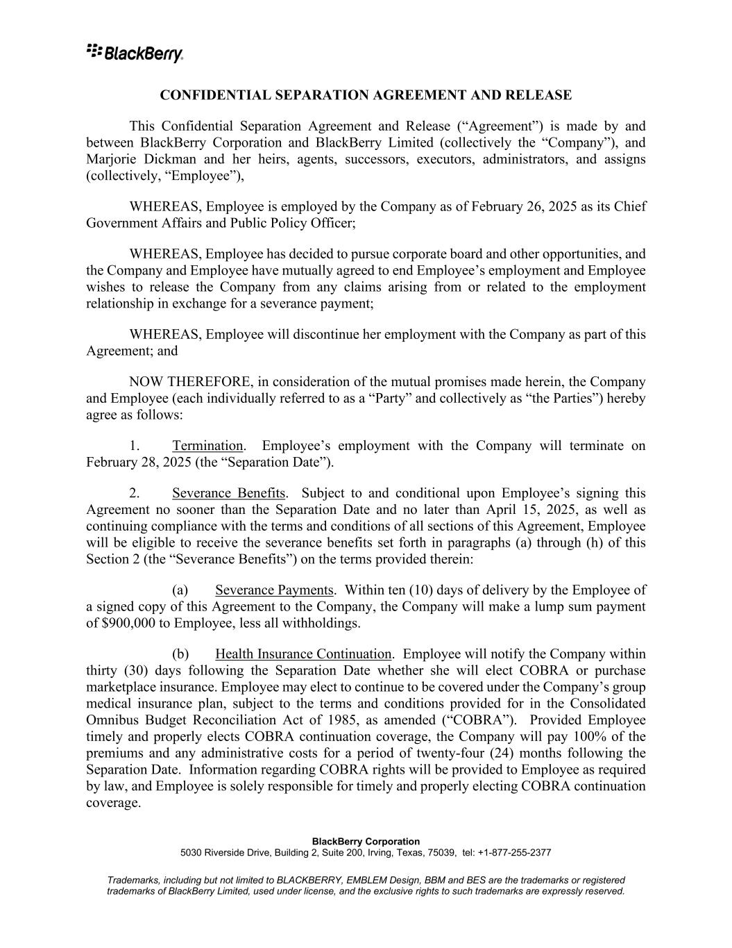 BlackBerry Insider Trading Policy BlackBerry Company-wide Guideline Page 3 of 8 Updated: April 1, 2025 Owner: Corporate Disclosure Committee Approved by: Board of Directors Trading Blackouts BlackBerry imposes a regular trading blackout period which applies to, among others, BlackBerry’s Board of Directors and BlackBerry’s officers who are required to report their securities transactions under applicable securities legislation (“Reporting Insiders”), members of the CDC, and other Insiders determined by the CDC, together with any of their executive assistants (collectively, “Restricted Insiders”). During a regular or special trading blackout, a Restricted Insider may not buy or sell BlackBerry's securities (or the securities of another public company, as applicable) and may not modify their enrollment in or withdraw from the Employee Stock Purchase Plan. The regular trading blackout period begins two weeks prior to the end of a fiscal quarter or fiscal year and ends at 9:00 am EST on the second trading day after the public release of quarter or year-end results. An Insider Trading Policy Administrator will notify by email all persons who are Restricted Insiders under this Insider Trading Policy of such status. Special trading blackouts relating to the securities of BlackBerry or another public company may also be imposed by the CDC or the Board of Directors as a result of special circumstances relating to BlackBerry or the other public company. A special trading blackout may apply to all Insiders or certain Insiders (e.g., Restricted Insiders or persons at BlackBerry who are privy to material, non-public information about a specific matter). An Insider Trading Policy Administrator will notify affected Insiders if a special trading blackout has been imposed and its duration, if known. Affected Insiders will also be notified by email when the trading blackout is lifted. The prohibition on trading by a Restricted Insider during a regular or special trading blackout does not include the sale of common shares under an automatic securities disposition plan adopted by the Insider and pre-cleared by BlackBerry's Board of Directors under the procedures set forth below under "Automatic Securities Disposition Plans". The CDC may also impose other, less formal restrictions on trading pursuant to its Company Acquisition Policy or otherwise. Pre-Clearance Requirement When a trading blackout is not in effect, and in order to avoid any appearance of impropriety, all Restricted Insiders are required to clear, in advance, any trading of BlackBerry's securities in accordance with the instructions contained in the email advising Restricted Insiders that a quarterly regular or special trading blackout has been lifted. This requirement is necessary to confirm that such Restricted Insiders are not in possession of material non-public information (favourable or unfavourable) concerning BlackBerry that has not been publicly disclosed. The CDC may also impose a special pre-clearance requirement on other Insiders from time to time as a result of special circumstances relating to BlackBerry. This special pre-clearance requirement may apply to all Insiders or certain Insiders (e.g., Restricted Insiders or persons at BlackBerry who are aware of material, non-public information about a specific matter). An Insider Trading Policy Administrator will notify affected Insiders of the imposition of a special pre-clearance requirement and its duration, if known. Affected Insiders will also be notified by email when the pre-clearance requirement is lifted, if the duration was not stated at the outset. All Restricted Insiders, even those who believe they are unaware of any material non-public information, must comply with the pre- clearance requirement. Unless otherwise stated, clearance is effective only on the day on which the Restricted Insider is informed by the Insider Trading Policy Administrator that a trade may be effected, and the next trading day thereafter. An Insider Trading Policy Administrator must obtain the approval of the Chief Financial Officer or the Chief Legal Officer prior to pre-clearing a trade by a Reporting Insider or member of the CDC, provided that no person may pre-clear his or her own trade. As noted below, under "Automatic Securities Disposition Plans", additional pre-clearance requirements apply in connection with the adoption by an Insider of an automatic securities disposition plan, but once such a plan is established, trades under the plan do not require further pre-clearance.