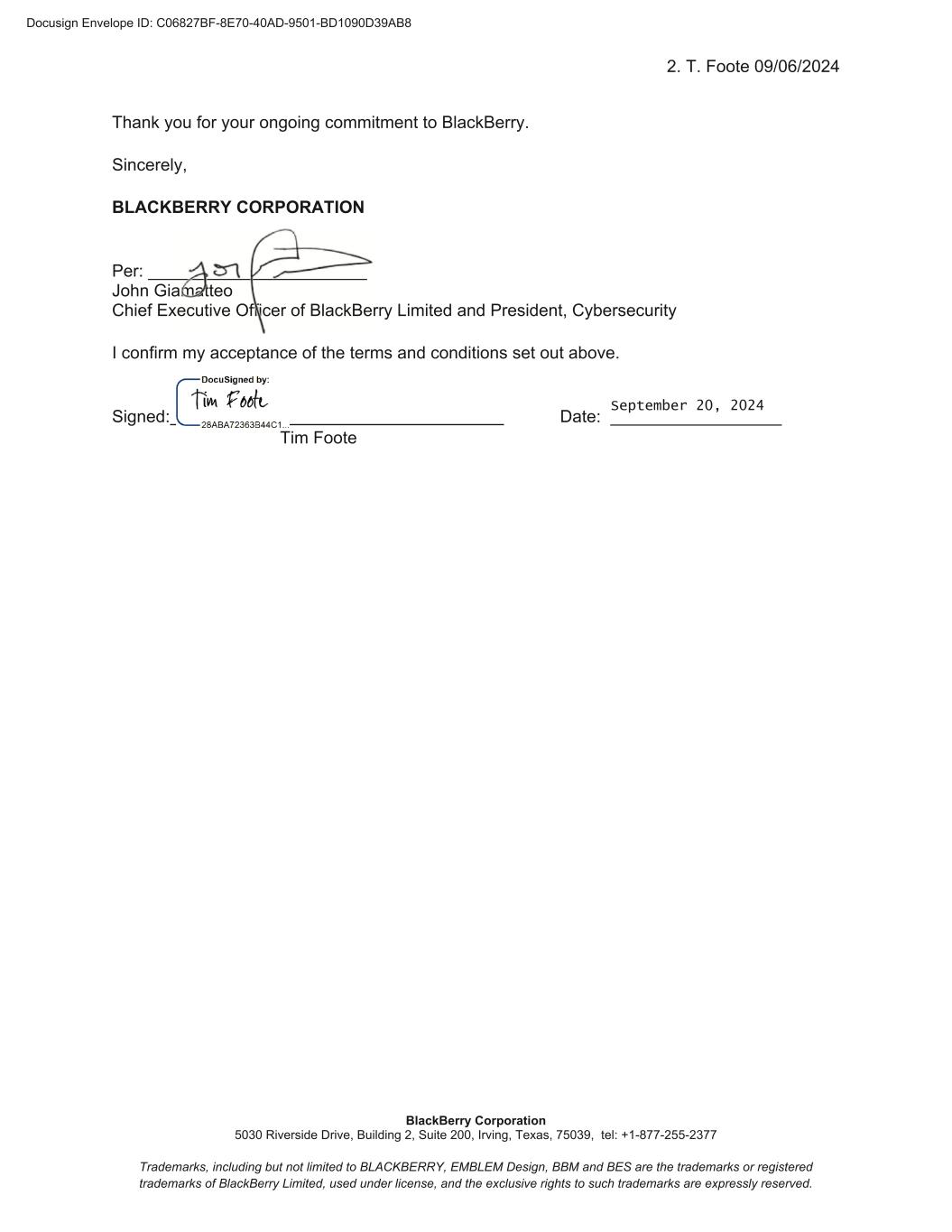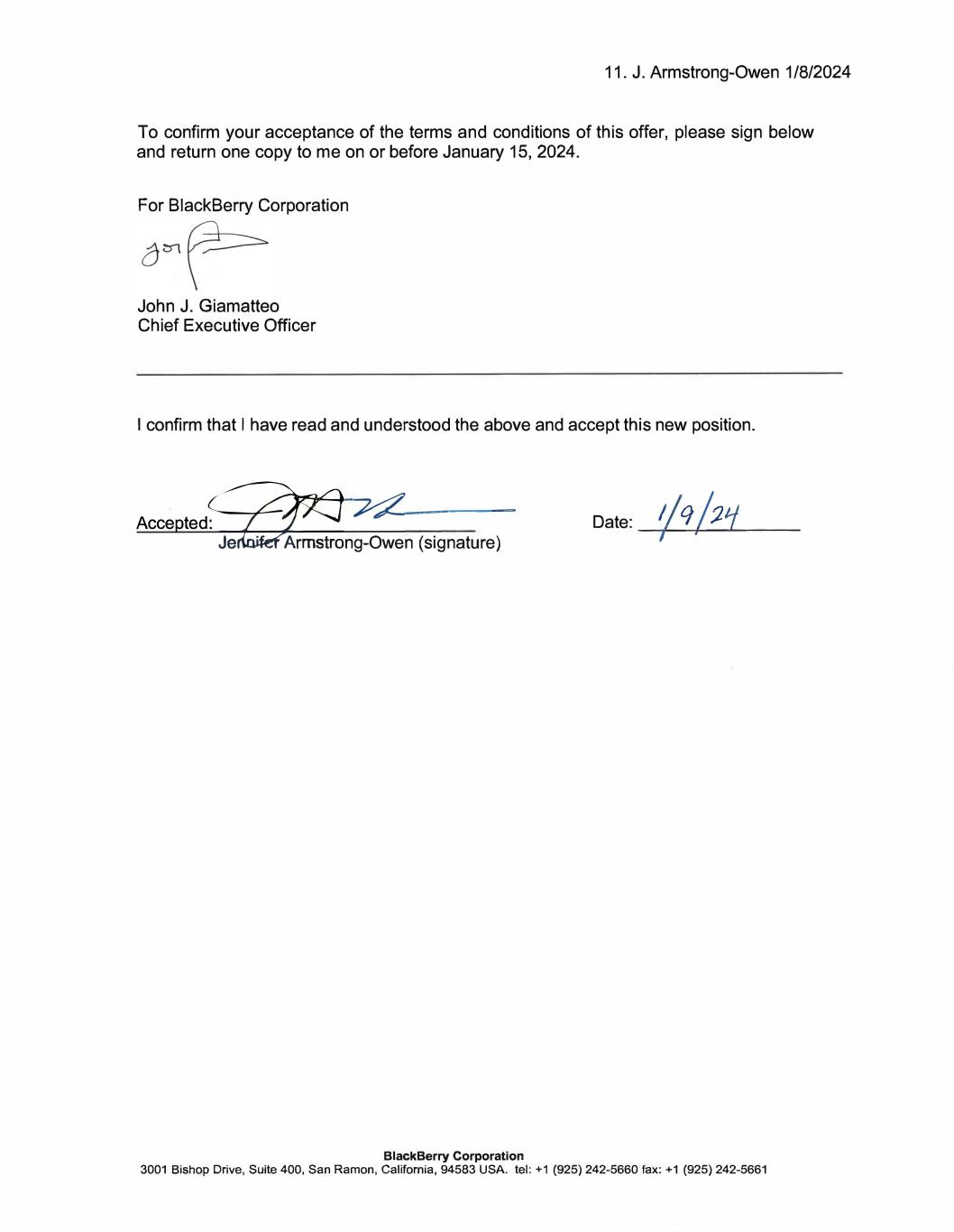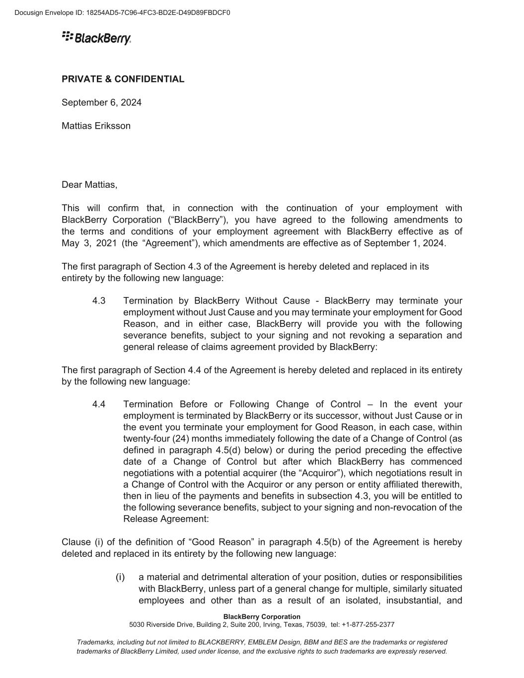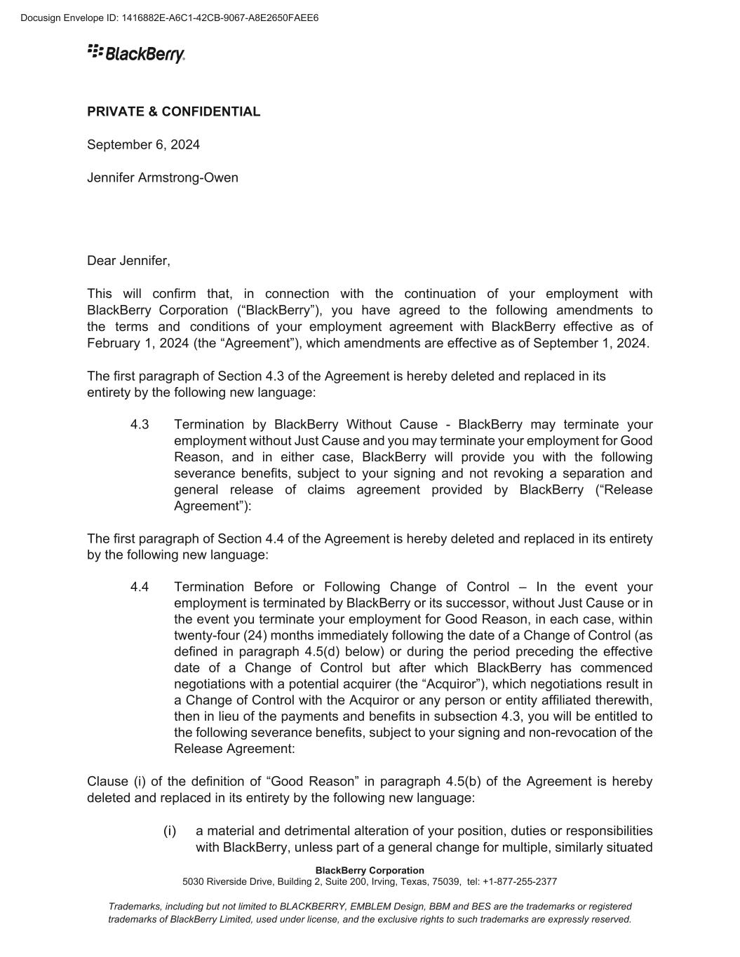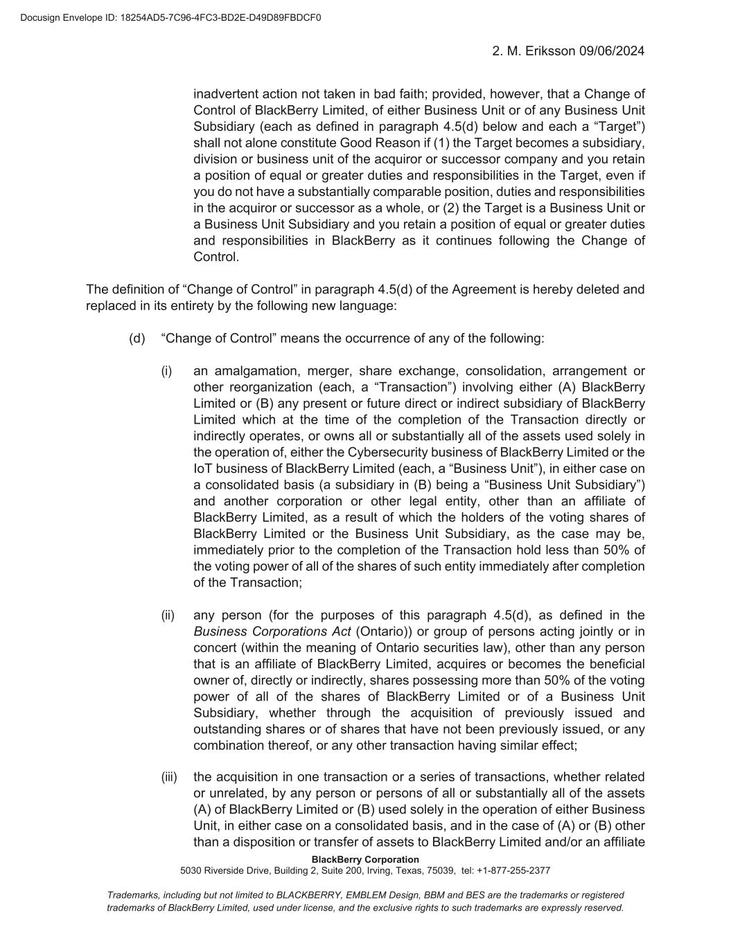 BlackBerry Insider Trading Policy BlackBerry Company-wide Guideline Page 3 of 8 Updated: April 1, 2025 Owner: Corporate Disclosure Committee Approved by: Board of Directors Trading Blackouts BlackBerry imposes a regular trading blackout period which applies to, among others, BlackBerry’s Board of Directors and BlackBerry’s officers who are required to report their securities transactions under applicable securities legislation (“Reporting Insiders”), members of the CDC, and other Insiders determined by the CDC, together with any of their executive assistants (collectively, “Restricted Insiders”). During a regular or special trading blackout, a Restricted Insider may not buy or sell BlackBerry's securities (or the securities of another public company, as applicable) and may not modify their enrollment in or withdraw from the Employee Stock Purchase Plan. The regular trading blackout period begins two weeks prior to the end of a fiscal quarter or fiscal year and ends at 9:00 am EST on the second trading day after the public release of quarter or year-end results. An Insider Trading Policy Administrator will notify by email all persons who are Restricted Insiders under this Insider Trading Policy of such status. Special trading blackouts relating to the securities of BlackBerry or another public company may also be imposed by the CDC or the Board of Directors as a result of special circumstances relating to BlackBerry or the other public company. A special trading blackout may apply to all Insiders or certain Insiders (e.g., Restricted Insiders or persons at BlackBerry who are privy to material, non-public information about a specific matter). An Insider Trading Policy Administrator will notify affected Insiders if a special trading blackout has been imposed and its duration, if known. Affected Insiders will also be notified by email when the trading blackout is lifted. The prohibition on trading by a Restricted Insider during a regular or special trading blackout does not include the sale of common shares under an automatic securities disposition plan adopted by the Insider and pre-cleared by BlackBerry's Board of Directors under the procedures set forth below under "Automatic Securities Disposition Plans". The CDC may also impose other, less formal restrictions on trading pursuant to its Company Acquisition Policy or otherwise. Pre-Clearance Requirement When a trading blackout is not in effect, and in order to avoid any appearance of impropriety, all Restricted Insiders are required to clear, in advance, any trading of BlackBerry's securities in accordance with the instructions contained in the email advising Restricted Insiders that a quarterly regular or special trading blackout has been lifted. This requirement is necessary to confirm that such Restricted Insiders are not in possession of material non-public information (favourable or unfavourable) concerning BlackBerry that has not been publicly disclosed. The CDC may also impose a special pre-clearance requirement on other Insiders from time to time as a result of special circumstances relating to BlackBerry. This special pre-clearance requirement may apply to all Insiders or certain Insiders (e.g., Restricted Insiders or persons at BlackBerry who are aware of material, non-public information about a specific matter). An Insider Trading Policy Administrator will notify affected Insiders of the imposition of a special pre-clearance requirement and its duration, if known. Affected Insiders will also be notified by email when the pre-clearance requirement is lifted, if the duration was not stated at the outset. All Restricted Insiders, even those who believe they are unaware of any material non-public information, must comply with the pre- clearance requirement. Unless otherwise stated, clearance is effective only on the day on which the Restricted Insider is informed by the Insider Trading Policy Administrator that a trade may be effected, and the next trading day thereafter. An Insider Trading Policy Administrator must obtain the approval of the Chief Financial Officer or the Chief Legal Officer prior to pre-clearing a trade by a Reporting Insider or member of the CDC, provided that no person may pre-clear his or her own trade. As noted below, under "Automatic Securities Disposition Plans", additional pre-clearance requirements apply in connection with the adoption by an Insider of an automatic securities disposition plan, but once such a plan is established, trades under the plan do not require further pre-clearance.