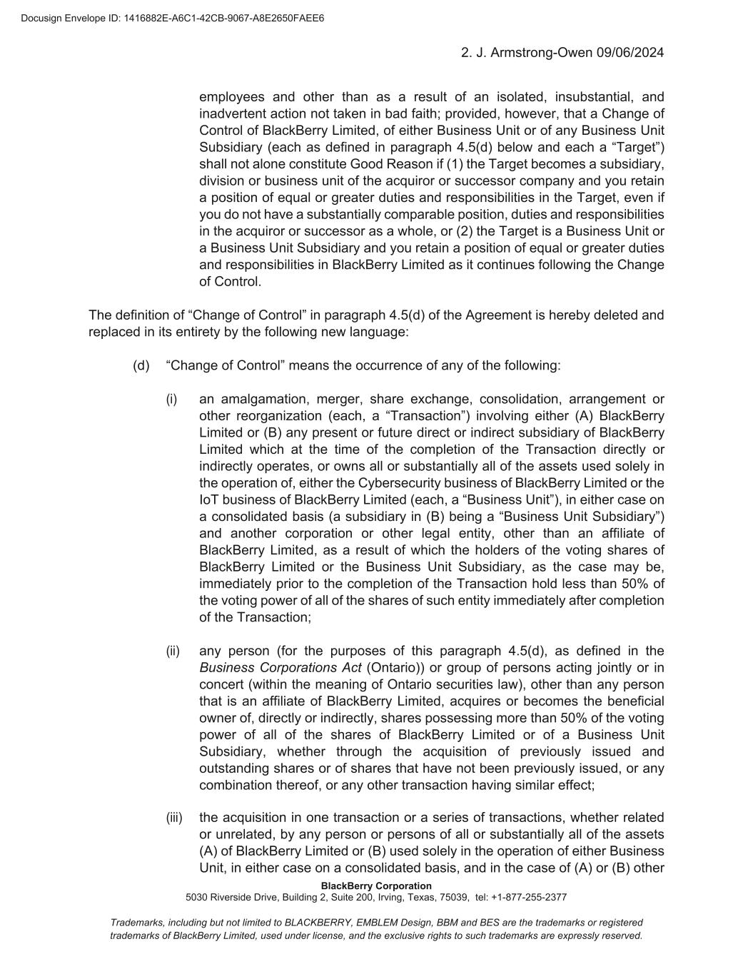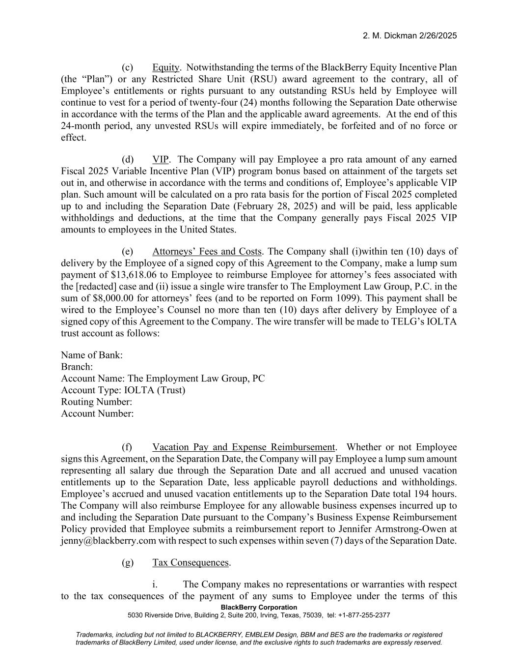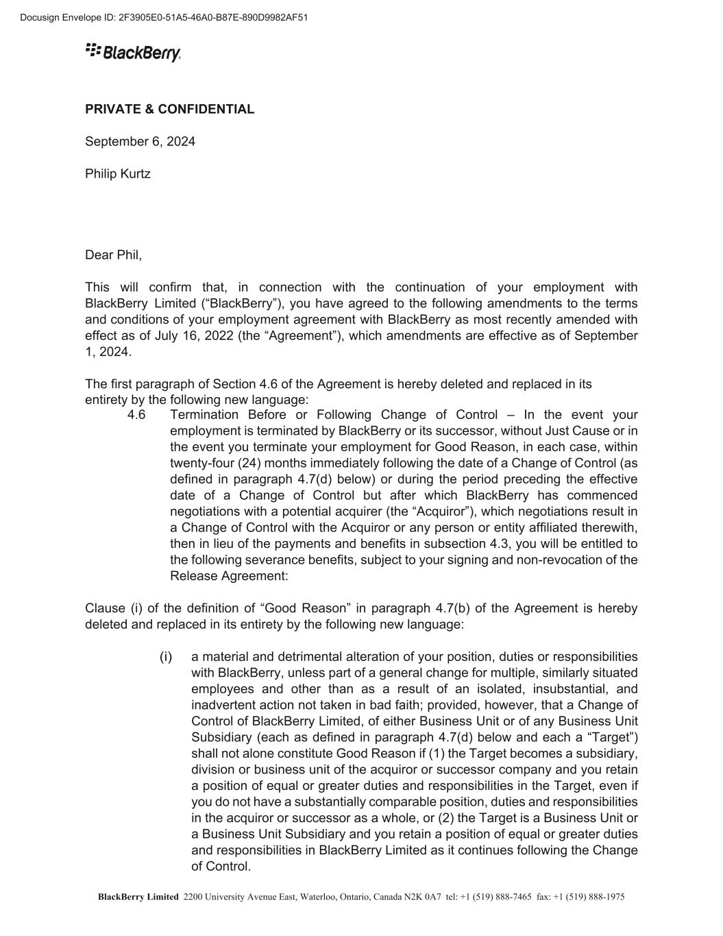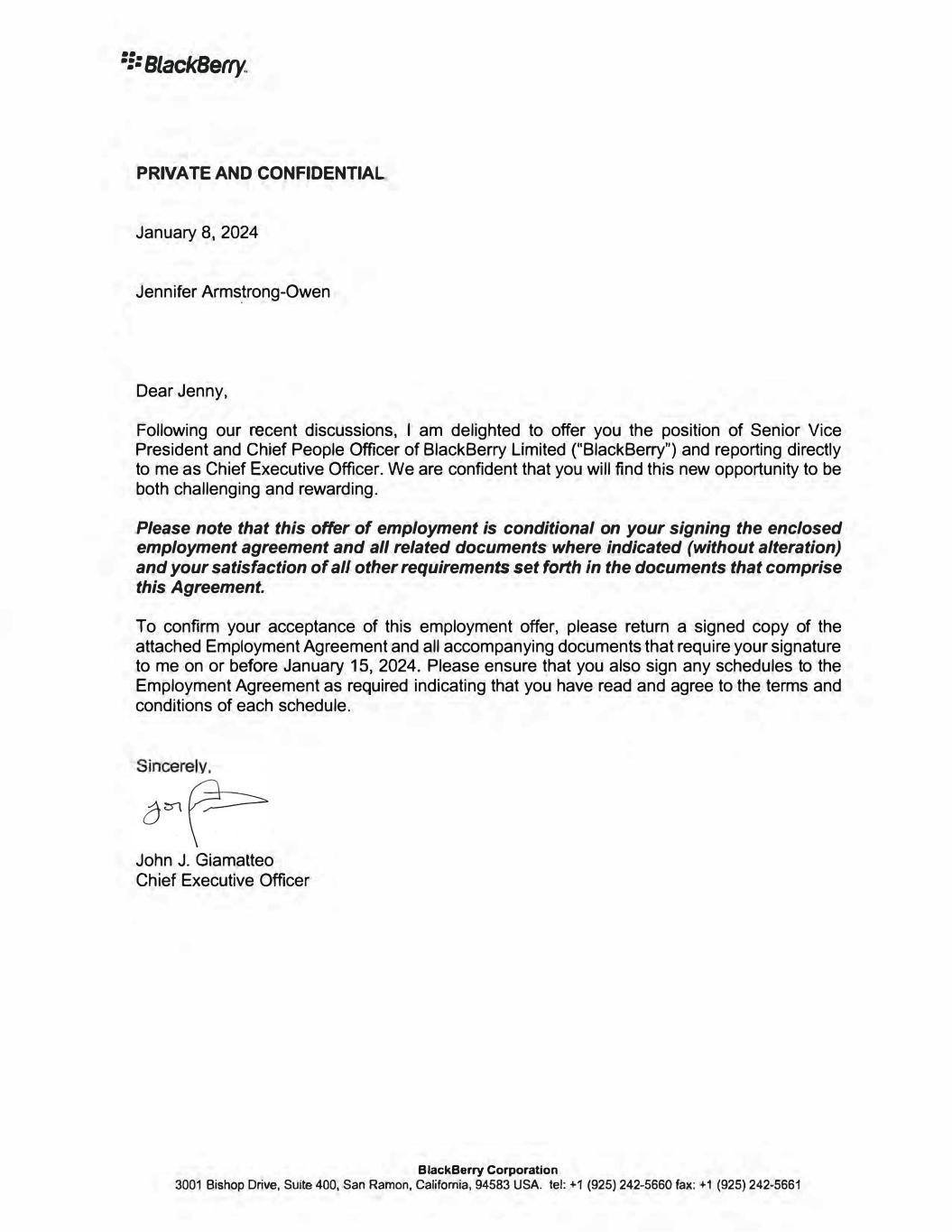 BlackBerry Insider Trading Policy BlackBerry Company-wide Guideline Page 3 of 8 Updated: April 1, 2025 Owner: Corporate Disclosure Committee Approved by: Board of Directors Trading Blackouts BlackBerry imposes a regular trading blackout period which applies to, among others, BlackBerry’s Board of Directors and BlackBerry’s officers who are required to report their securities transactions under applicable securities legislation (“Reporting Insiders”), members of the CDC, and other Insiders determined by the CDC, together with any of their executive assistants (collectively, “Restricted Insiders”). During a regular or special trading blackout, a Restricted Insider may not buy or sell BlackBerry's securities (or the securities of another public company, as applicable) and may not modify their enrollment in or withdraw from the Employee Stock Purchase Plan. The regular trading blackout period begins two weeks prior to the end of a fiscal quarter or fiscal year and ends at 9:00 am EST on the second trading day after the public release of quarter or year-end results. An Insider Trading Policy Administrator will notify by email all persons who are Restricted Insiders under this Insider Trading Policy of such status. Special trading blackouts relating to the securities of BlackBerry or another public company may also be imposed by the CDC or the Board of Directors as a result of special circumstances relating to BlackBerry or the other public company. A special trading blackout may apply to all Insiders or certain Insiders (e.g., Restricted Insiders or persons at BlackBerry who are privy to material, non-public information about a specific matter). An Insider Trading Policy Administrator will notify affected Insiders if a special trading blackout has been imposed and its duration, if known. Affected Insiders will also be notified by email when the trading blackout is lifted. The prohibition on trading by a Restricted Insider during a regular or special trading blackout does not include the sale of common shares under an automatic securities disposition plan adopted by the Insider and pre-cleared by BlackBerry's Board of Directors under the procedures set forth below under "Automatic Securities Disposition Plans". The CDC may also impose other, less formal restrictions on trading pursuant to its Company Acquisition Policy or otherwise. Pre-Clearance Requirement When a trading blackout is not in effect, and in order to avoid any appearance of impropriety, all Restricted Insiders are required to clear, in advance, any trading of BlackBerry's securities in accordance with the instructions contained in the email advising Restricted Insiders that a quarterly regular or special trading blackout has been lifted. This requirement is necessary to confirm that such Restricted Insiders are not in possession of material non-public information (favourable or unfavourable) concerning BlackBerry that has not been publicly disclosed. The CDC may also impose a special pre-clearance requirement on other Insiders from time to time as a result of special circumstances relating to BlackBerry. This special pre-clearance requirement may apply to all Insiders or certain Insiders (e.g., Restricted Insiders or persons at BlackBerry who are aware of material, non-public information about a specific matter). An Insider Trading Policy Administrator will notify affected Insiders of the imposition of a special pre-clearance requirement and its duration, if known. Affected Insiders will also be notified by email when the pre-clearance requirement is lifted, if the duration was not stated at the outset. All Restricted Insiders, even those who believe they are unaware of any material non-public information, must comply with the pre- clearance requirement. Unless otherwise stated, clearance is effective only on the day on which the Restricted Insider is informed by the Insider Trading Policy Administrator that a trade may be effected, and the next trading day thereafter. An Insider Trading Policy Administrator must obtain the approval of the Chief Financial Officer or the Chief Legal Officer prior to pre-clearing a trade by a Reporting Insider or member of the CDC, provided that no person may pre-clear his or her own trade. As noted below, under "Automatic Securities Disposition Plans", additional pre-clearance requirements apply in connection with the adoption by an Insider of an automatic securities disposition plan, but once such a plan is established, trades under the plan do not require further pre-clearance.