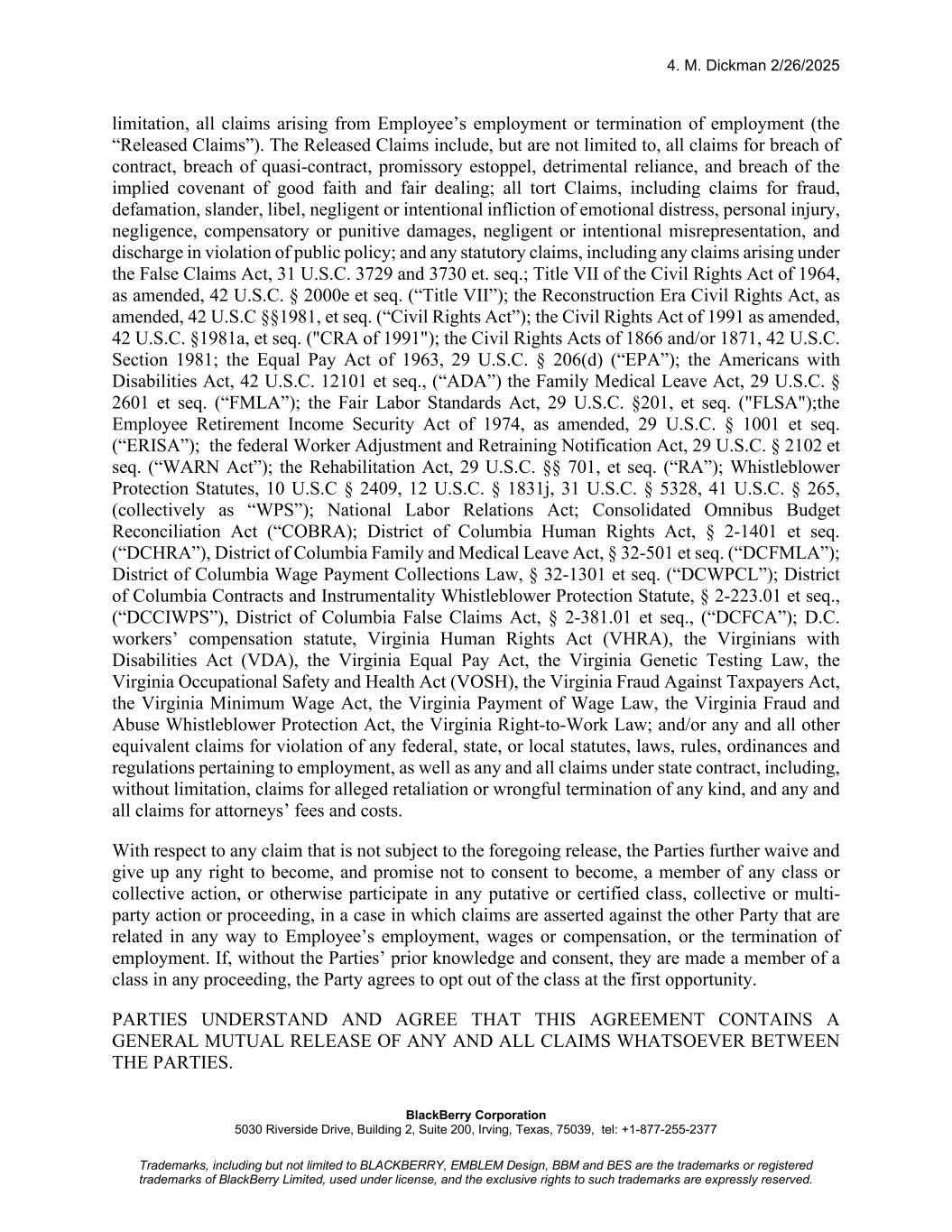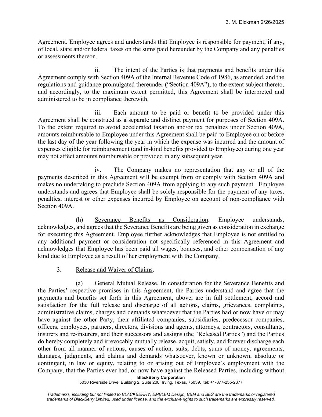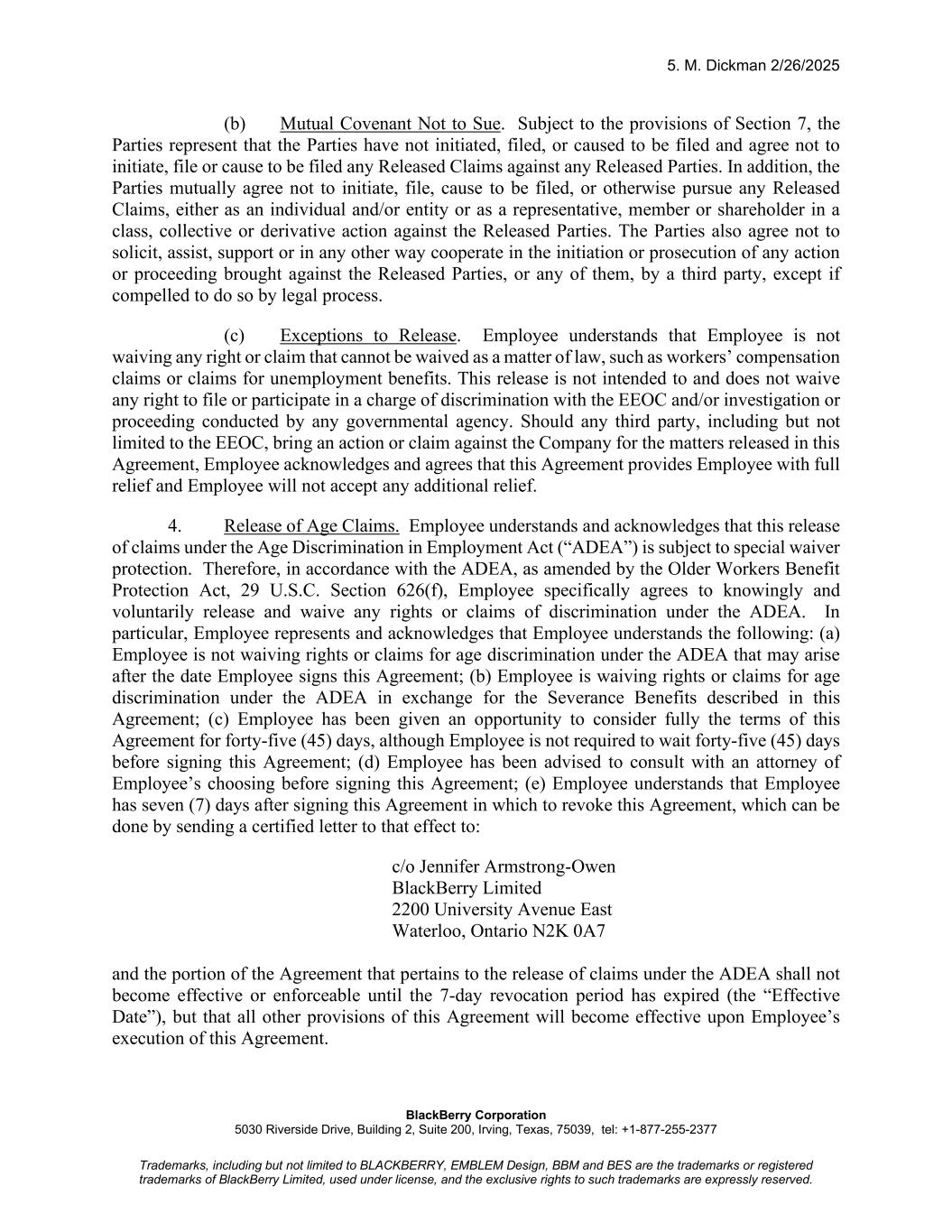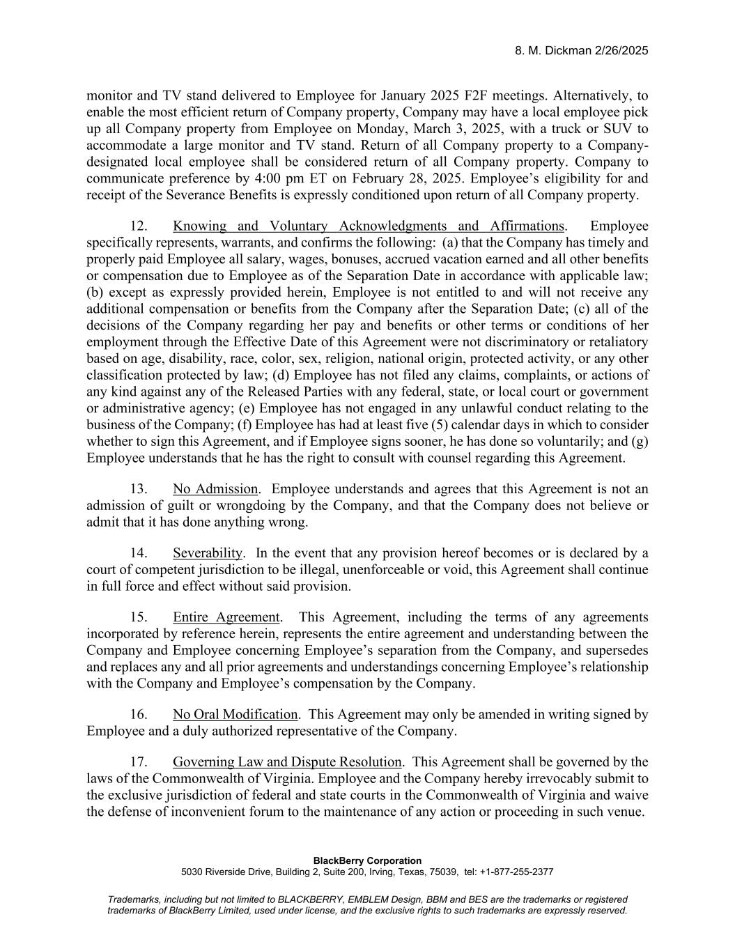 BlackBerry Insider Trading Policy BlackBerry Company-wide Guideline Page 3 of 8 Updated: April 1, 2025 Owner: Corporate Disclosure Committee Approved by: Board of Directors Trading Blackouts BlackBerry imposes a regular trading blackout period which applies to, among others, BlackBerry’s Board of Directors and BlackBerry’s officers who are required to report their securities transactions under applicable securities legislation (“Reporting Insiders”), members of the CDC, and other Insiders determined by the CDC, together with any of their executive assistants (collectively, “Restricted Insiders”). During a regular or special trading blackout, a Restricted Insider may not buy or sell BlackBerry's securities (or the securities of another public company, as applicable) and may not modify their enrollment in or withdraw from the Employee Stock Purchase Plan. The regular trading blackout period begins two weeks prior to the end of a fiscal quarter or fiscal year and ends at 9:00 am EST on the second trading day after the public release of quarter or year-end results. An Insider Trading Policy Administrator will notify by email all persons who are Restricted Insiders under this Insider Trading Policy of such status. Special trading blackouts relating to the securities of BlackBerry or another public company may also be imposed by the CDC or the Board of Directors as a result of special circumstances relating to BlackBerry or the other public company. A special trading blackout may apply to all Insiders or certain Insiders (e.g., Restricted Insiders or persons at BlackBerry who are privy to material, non-public information about a specific matter). An Insider Trading Policy Administrator will notify affected Insiders if a special trading blackout has been imposed and its duration, if known. Affected Insiders will also be notified by email when the trading blackout is lifted. The prohibition on trading by a Restricted Insider during a regular or special trading blackout does not include the sale of common shares under an automatic securities disposition plan adopted by the Insider and pre-cleared by BlackBerry's Board of Directors under the procedures set forth below under "Automatic Securities Disposition Plans". The CDC may also impose other, less formal restrictions on trading pursuant to its Company Acquisition Policy or otherwise. Pre-Clearance Requirement When a trading blackout is not in effect, and in order to avoid any appearance of impropriety, all Restricted Insiders are required to clear, in advance, any trading of BlackBerry's securities in accordance with the instructions contained in the email advising Restricted Insiders that a quarterly regular or special trading blackout has been lifted. This requirement is necessary to confirm that such Restricted Insiders are not in possession of material non-public information (favourable or unfavourable) concerning BlackBerry that has not been publicly disclosed. The CDC may also impose a special pre-clearance requirement on other Insiders from time to time as a result of special circumstances relating to BlackBerry. This special pre-clearance requirement may apply to all Insiders or certain Insiders (e.g., Restricted Insiders or persons at BlackBerry who are aware of material, non-public information about a specific matter). An Insider Trading Policy Administrator will notify affected Insiders of the imposition of a special pre-clearance requirement and its duration, if known. Affected Insiders will also be notified by email when the pre-clearance requirement is lifted, if the duration was not stated at the outset. All Restricted Insiders, even those who believe they are unaware of any material non-public information, must comply with the pre- clearance requirement. Unless otherwise stated, clearance is effective only on the day on which the Restricted Insider is informed by the Insider Trading Policy Administrator that a trade may be effected, and the next trading day thereafter. An Insider Trading Policy Administrator must obtain the approval of the Chief Financial Officer or the Chief Legal Officer prior to pre-clearing a trade by a Reporting Insider or member of the CDC, provided that no person may pre-clear his or her own trade. As noted below, under "Automatic Securities Disposition Plans", additional pre-clearance requirements apply in connection with the adoption by an Insider of an automatic securities disposition plan, but once such a plan is established, trades under the plan do not require further pre-clearance.