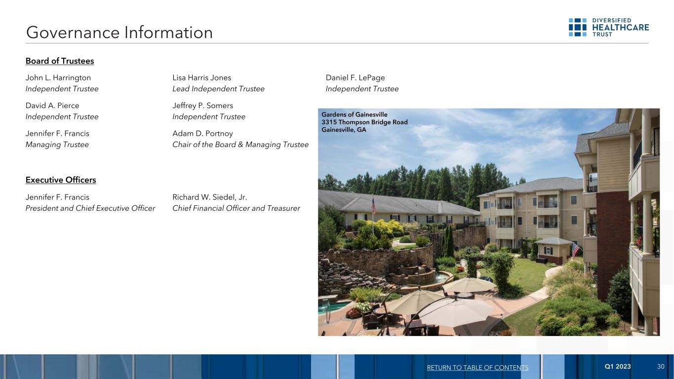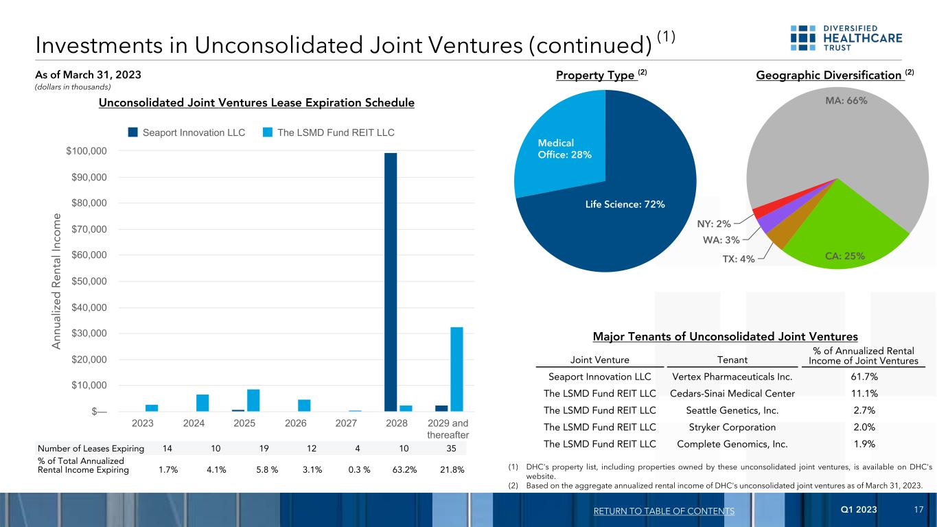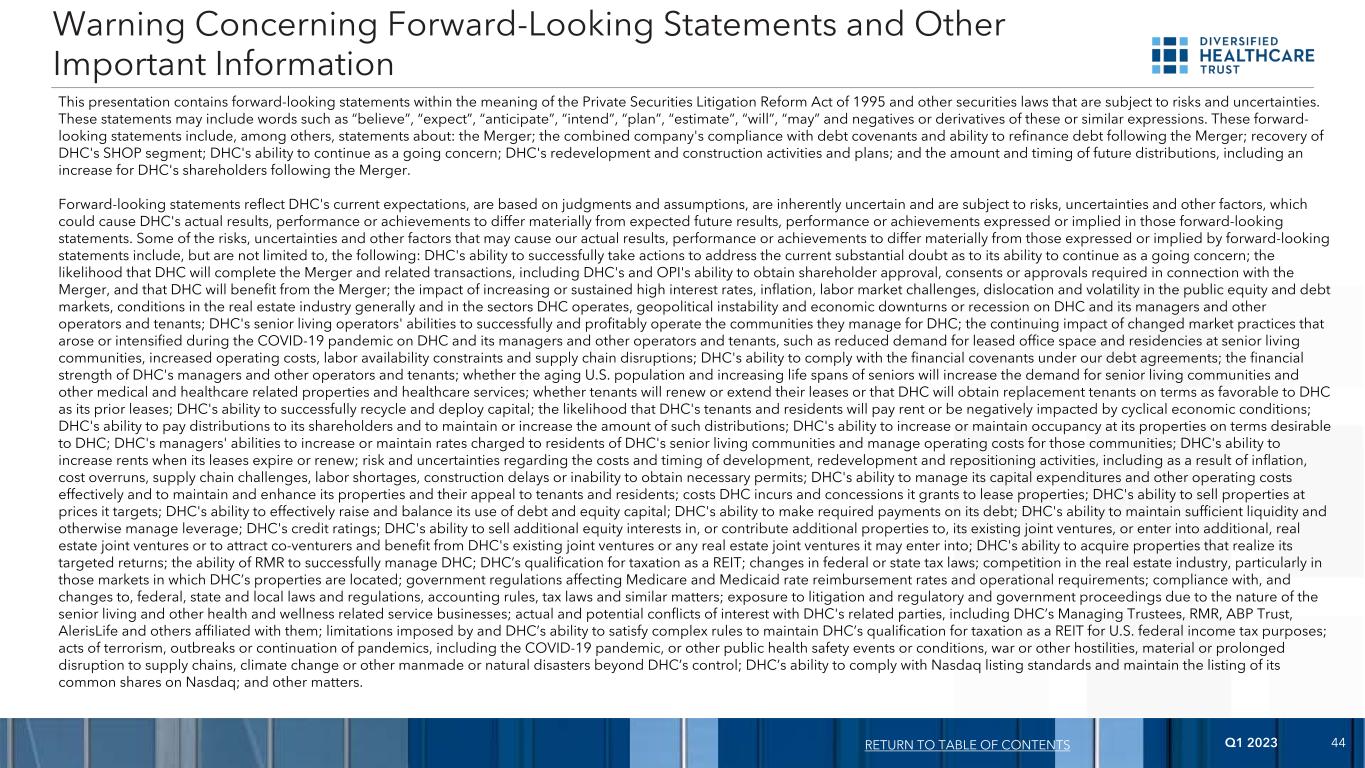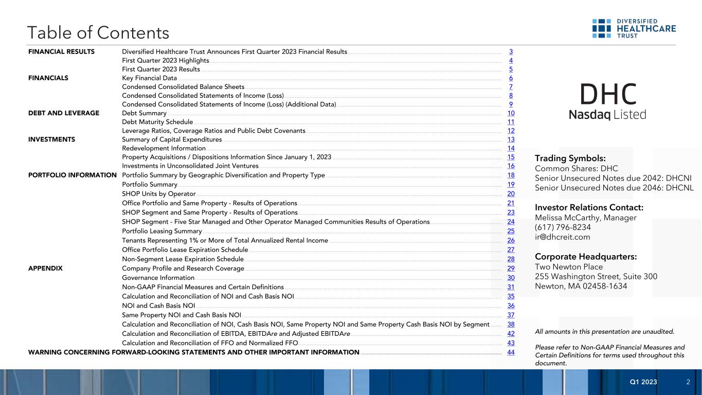 Q1 2023 2 FINANCIAL RESULTS Diversified Healthcare Trust Announces First Quarter 2023 Financial Results .............................................................................................. 3 First Quarter 2023 Highlights .................................................................................................................................................................................. 4 First Quarter 2023 Results ....................................................................................................................................................................................... 5 FINANCIALS Key Financial Data ..................................................................................................................................................................................................... 6 Condensed Consolidated Balance Sheets ............................................................................................................................................................ 7 Condensed Consolidated Statements of Income (Loss) .................................................................................................................................... 8 Condensed Consolidated Statements of Income (Loss) (Additional Data) ..................................................................................................... 9 DEBT AND LEVERAGE Debt Summary ........................................................................................................................................................................................................... 10 Debt Maturity Schedule ........................................................................................................................................................................................... 11 Leverage Ratios, Coverage Ratios and Public Debt Covenants ....................................................................................................................... 12 INVESTMENTS Summary of Capital Expenditures .......................................................................................................................................................................... 13 Redevelopment Information .................................................................................................................................................................................... 14 Property Acquisitions / Dispositions Information Since January 1, 2023 ....................................................................................................... 15 Investments in Unconsolidated Joint Ventures .................................................................................................................................................... 16 PORTFOLIO INFORMATION Portfolio Summary by Geographic Diversification and Property Type ........................................................................................................... 18 Portfolio Summary ..................................................................................................................................................................................................... 19 SHOP Units by Operator .......................................................................................................................................................................................... 20 Office Portfolio and Same Property - Results of Operations ............................................................................................................................ 21 SHOP Segment and Same Property - Results of Operations ............................................................................................................................ 23 SHOP Segment - Five Star Managed and Other Operator Managed Communities Results of Operations ............................................ 24 Portfolio Leasing Summary ...................................................................................................................................................................................... 25 Tenants Representing 1% or More of Total Annualized Rental Income ......................................................................................................... 26 Office Portfolio Lease Expiration Schedule .......................................................................................................................................................... 27 Non-Segment Lease Expiration Schedule ............................................................................................................................................................. 28 APPENDIX Company Profile and Research Coverage ............................................................................................................................................................ 29 Governance Information........................................................................................................................................................................................... 30 Non-GAAP Financial Measures and Certain Definitions .................................................................................................................................... 31 Calculation and Reconciliation of NOI and Cash Basis NOI .............................................................................................................................. 35 NOI and Cash Basis NOI .......................................................................................................................................................................................... 36 Same Property NOI and Cash Basis NOI .............................................................................................................................................................. 37 Calculation and