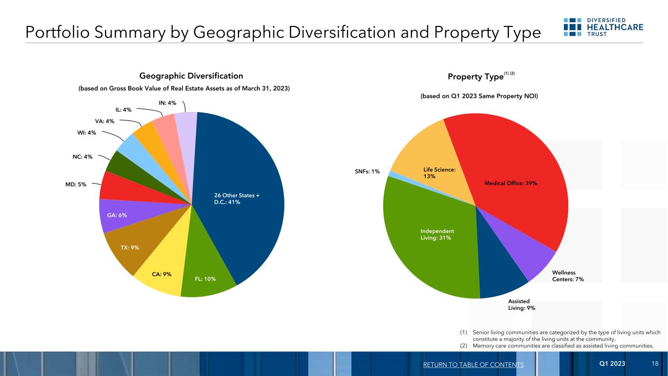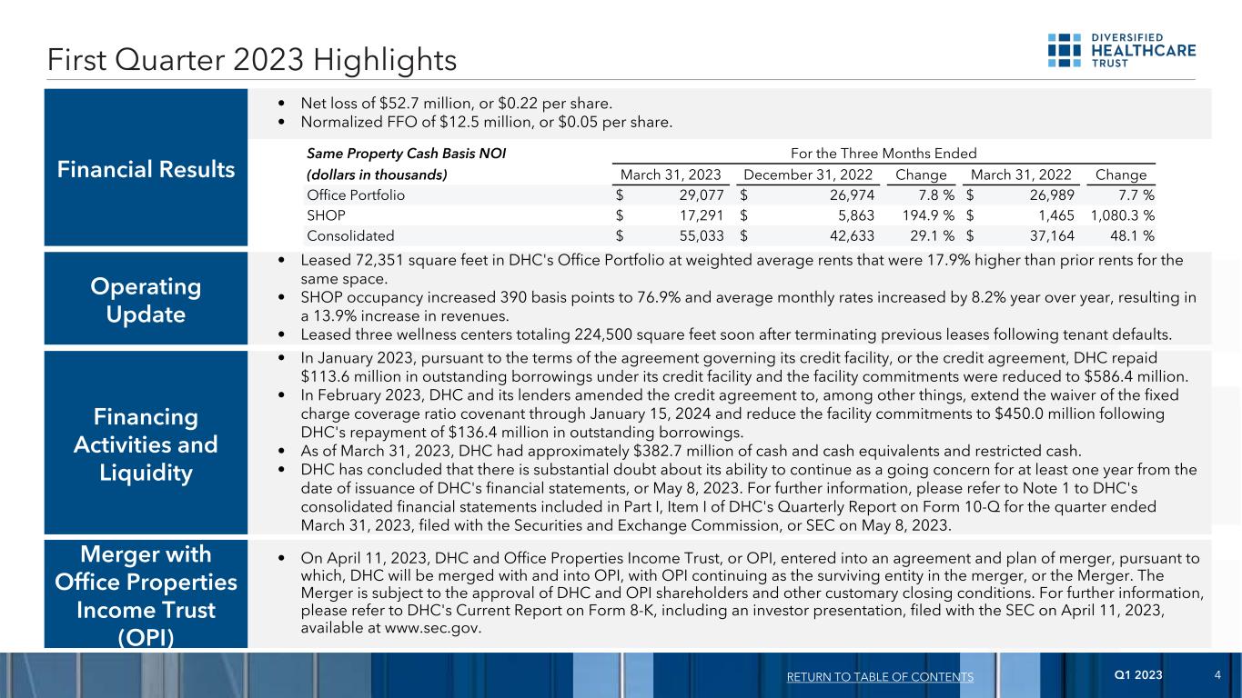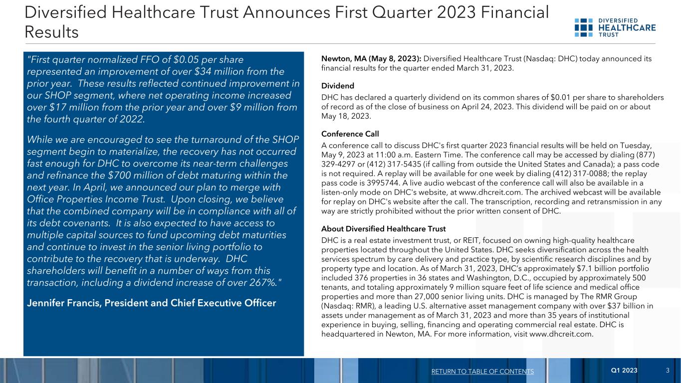 Q1 2023 3 "First quarter normalized FFO of $0.05 per share represented an improvement of over $34 million from the prior year. These results reflected continued improvement in our SHOP segment, where net operating income increased over $17 million from the prior year and over $9 million from the fourth quarter of 2022. While we are encouraged to see the turnaround of the SHOP segment begin to materialize, the recovery has not occurred fast enough for DHC to overcome its near-term challenges and refinance the $700 million of debt maturing within the next year. In April, we announced our plan to merge with Office Properties Income Trust. Upon closing, we believe that the combined company will be in compliance with all of its debt covenants. It is also expected to have access to multiple capital sources to fund upcoming debt maturities and continue to invest in the senior living portfolio to contribute to the recovery that is underway. DHC shareholders will benefit in a number of ways from this transaction, including a dividend increase of over 267%." Jennifer Francis, President and Chief Executive Officer Diversified Healthcare Trust Announces First Quarter 2023 Financial Results RETURN TO TABLE OF CONTENTS Newton, MA (May 8, 2023): Diversified Healthcare Trust (Nasdaq: DHC) today announced its financial results for the quarter ended March 31, 2023. Dividend DHC has declared a quarterly dividend on its common shares of $0.01 per share to shareholders of record as of the close of business on April 24, 2023. This dividend will be paid on or about May 18, 2023. Conference Call A conference call to discuss DHC's first quarter 2023 financial results will be held on Tuesday, May 9, 2023 at 11:00 a.m. Eastern Time. The conference call may be accessed by dialing (877) 329-4297 or (412) 317-5435 (if calling from outside the United States and Canada); a pass code is not required. A replay will be available for one week by dialing (412) 317-0088; the replay pass code is 3995744. A live audio webcast of the conference call will also be available in a listen-only mode on DHC's website, at www.dhcreit.com. The archived webcast will be available for replay on DHC's website after the call. The transcription, recording and retransmission in any way are strictly prohibited without the prior written consent of DHC. About Diversified Healthcare Trust DHC is a real estate investment trust, or REIT, focused on owning high-quality healthcare properties located throughout the United States. DHC seeks diversification across the health services spectrum by care delivery and practice type, by scientific research disciplines and by property type and location. As of March 31, 2023, DHC’s approximately $7.1 billion portfolio included 376 properties in 36 states and Washington, D.C., occupied by approximately 500 tenants, and totaling approximately 9 million square feet of life science and medical office properties and more than 27,000 senior living units. DHC is managed by The RMR Group (Nasdaq: RMR), a leading U.S. alternative asset management company with over $37 billion in assets under management as of March 31, 2023 and more than 35 years of institutional experience in buying, selling, financing and operating commercial real estate. DHC is headquartered in Newton, MA. For more information, visit www.dhcreit.com.